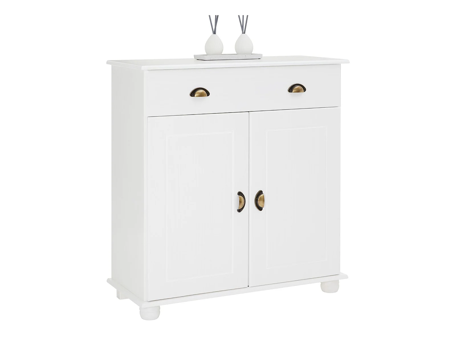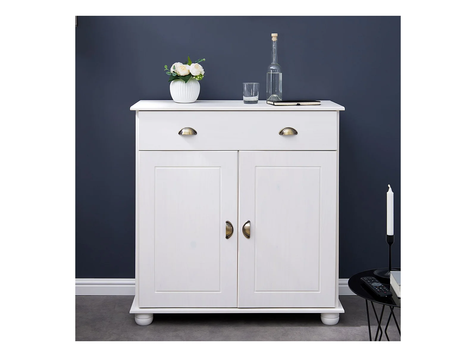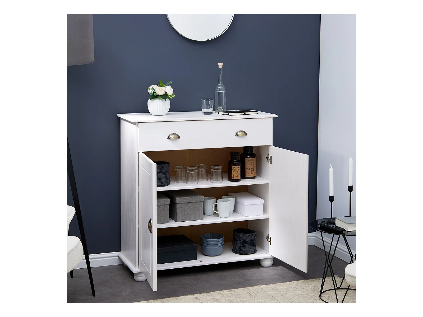 Buffet COLMAR commode bahut vaisselier meuble bas rangement avec 1 tiroir et 2 portes, en pin massif lasuré blanc