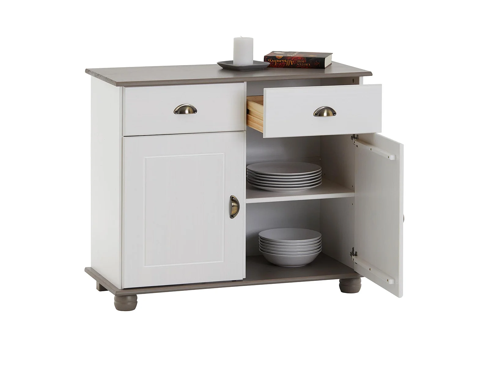 Buffet COLMAR commode bahut vaisselier meuble bas rangement avec 2 tiroirs et 2 portes, en pin massif lasuré blanc et taupe