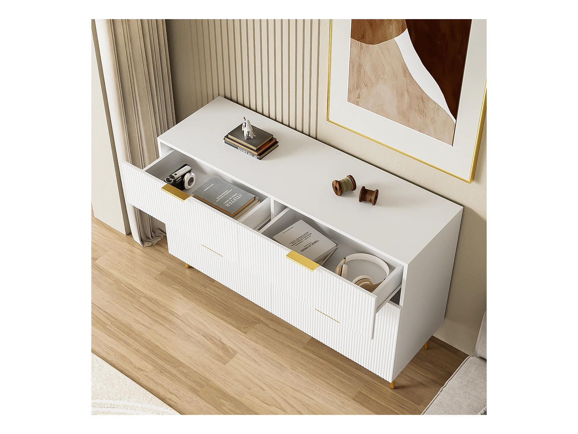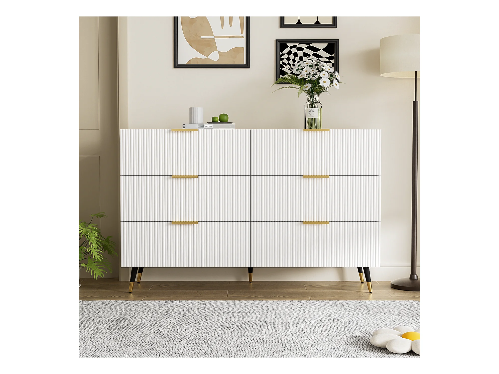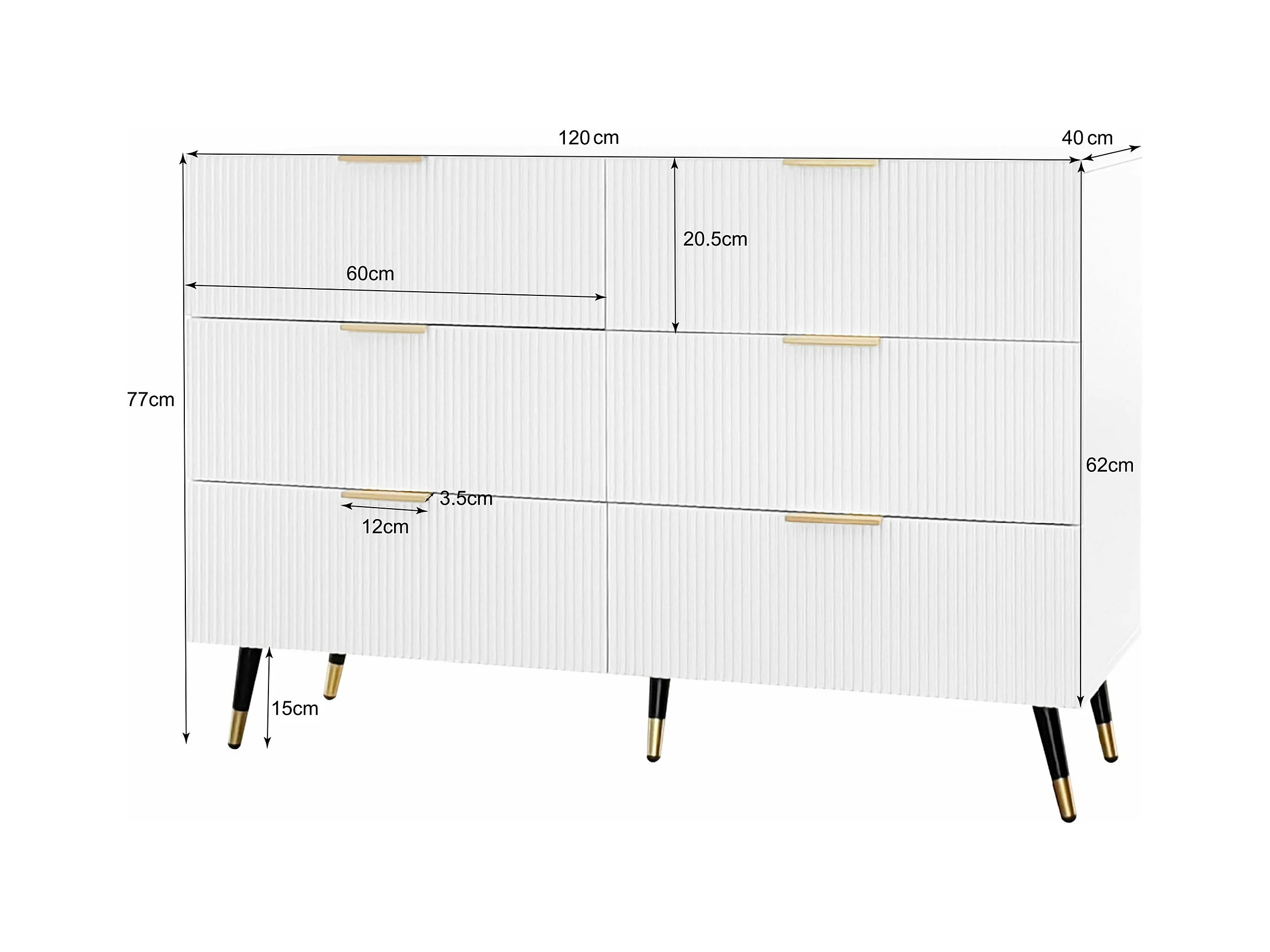 Buffet, commode avec 6 tiroirs - 120 x 40 x 77 cm - Panneaux de particules - Poignées et pièds dorés - Blanc