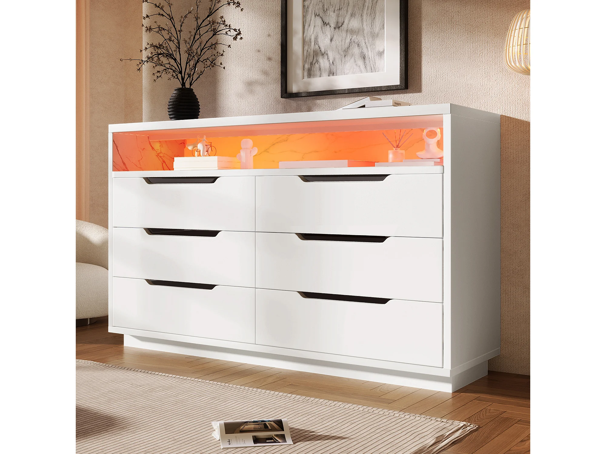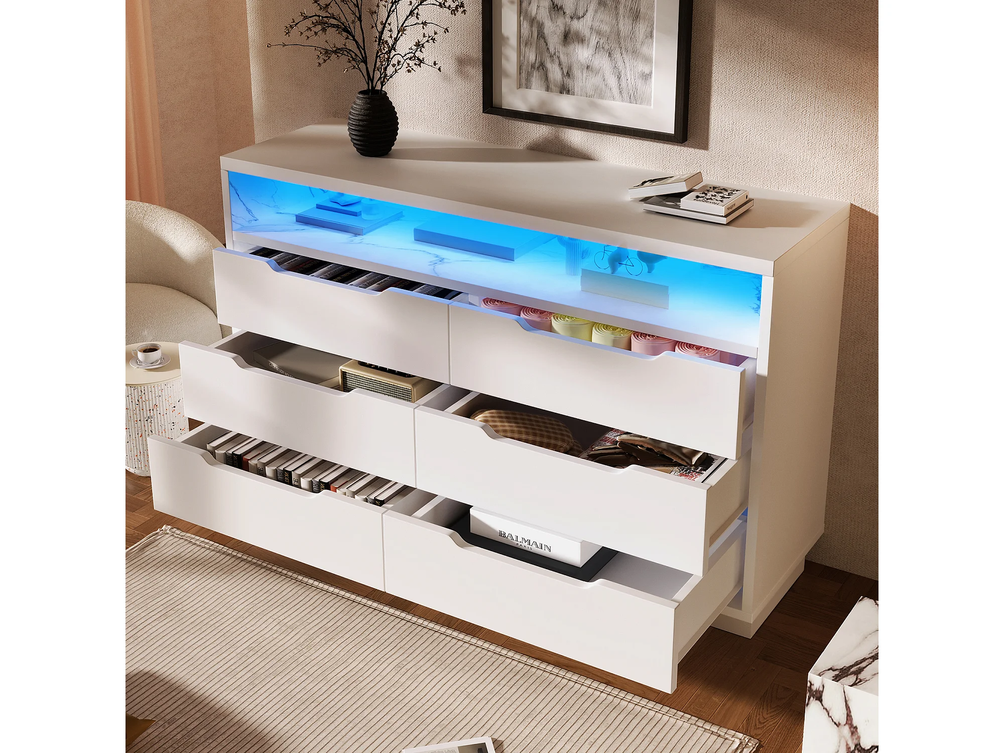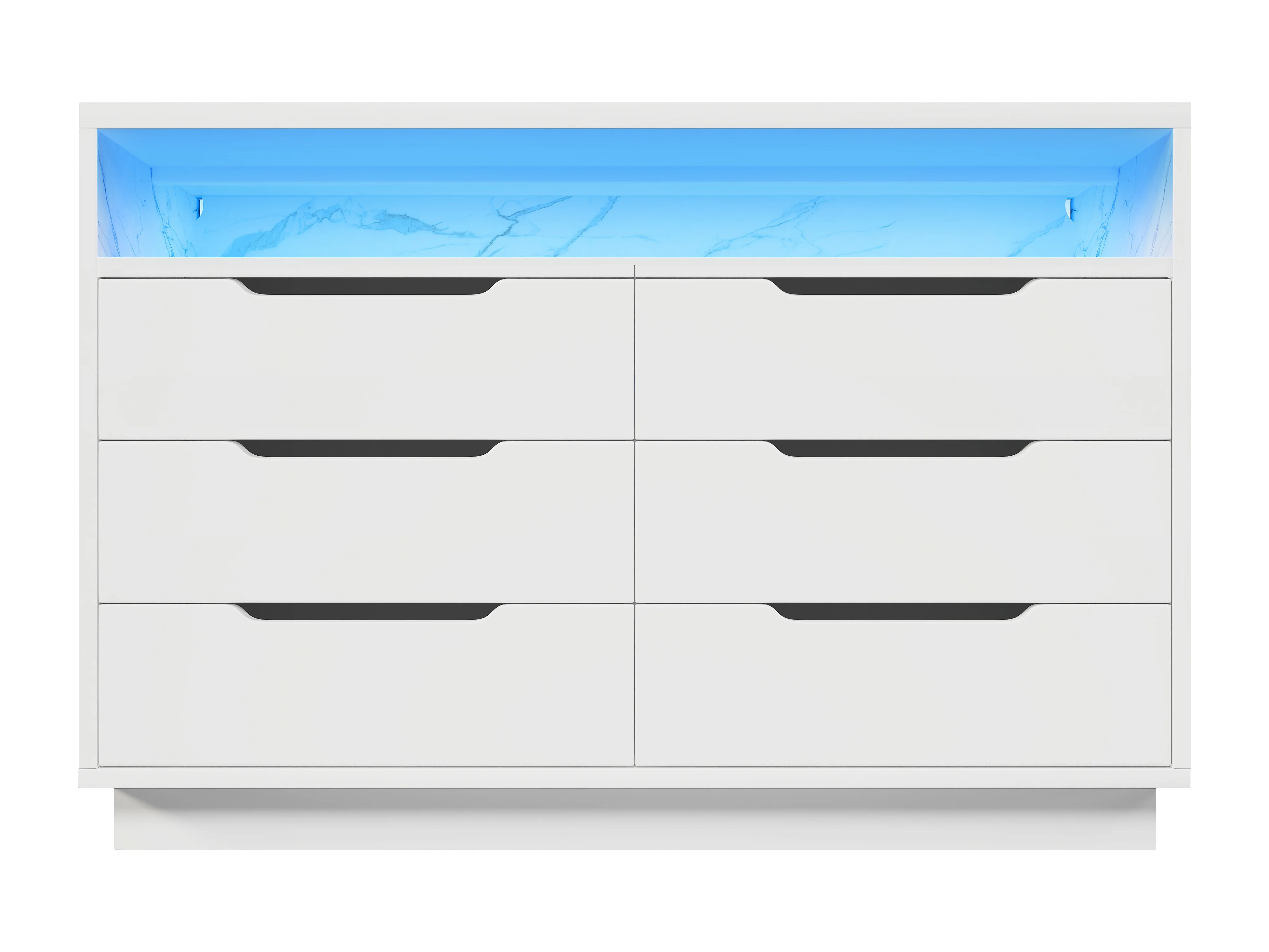 Buffet, commode avec éclairage LED et 6 tiroirs, compartiment de rangement avec grain de marbre, 120x40x85 cm, blanc