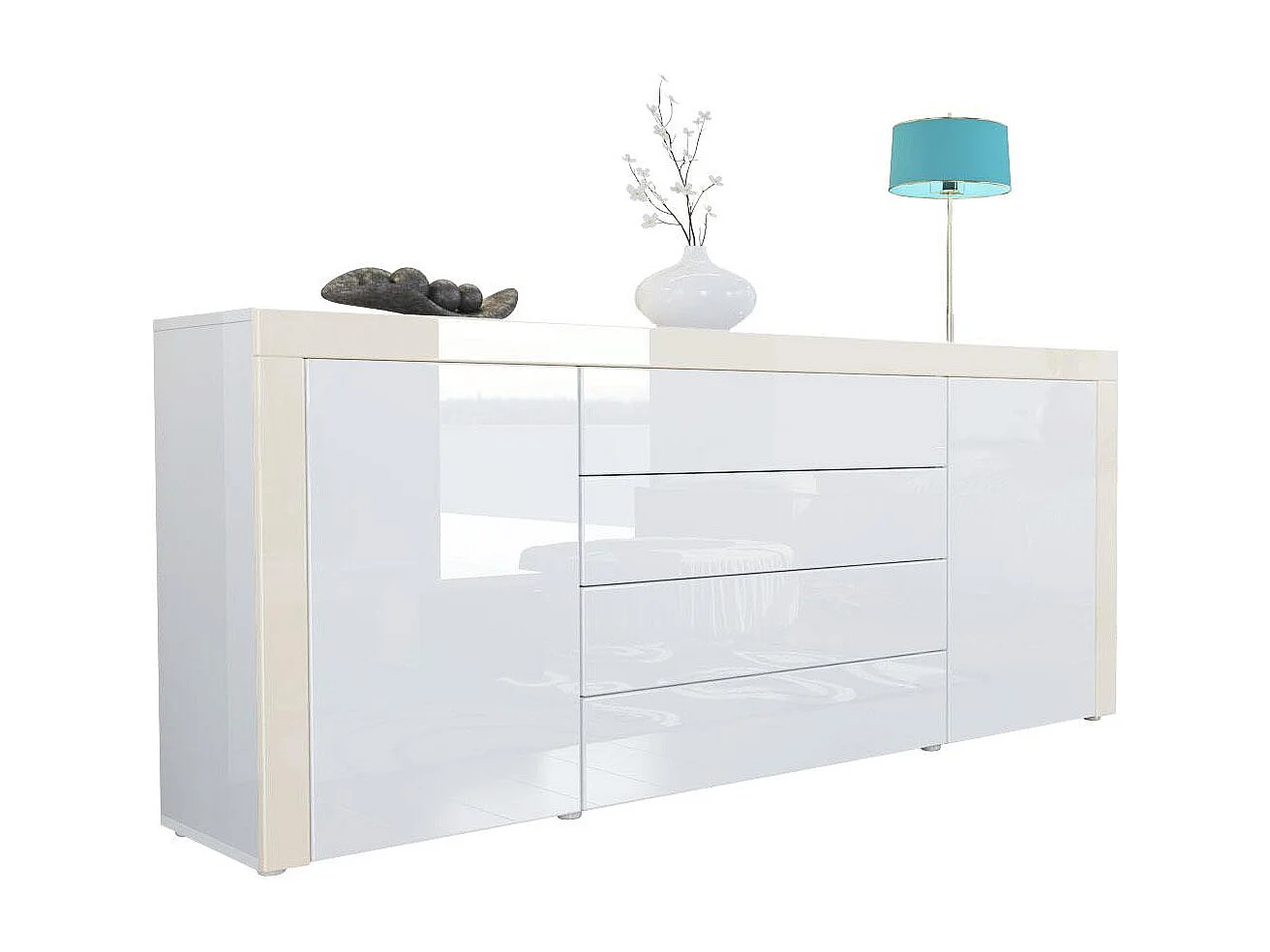 Buffet commode La Paz, Corps en Blanc haute brillance / Façades en blanc haute brillance avec une bordure en crème haute brillance