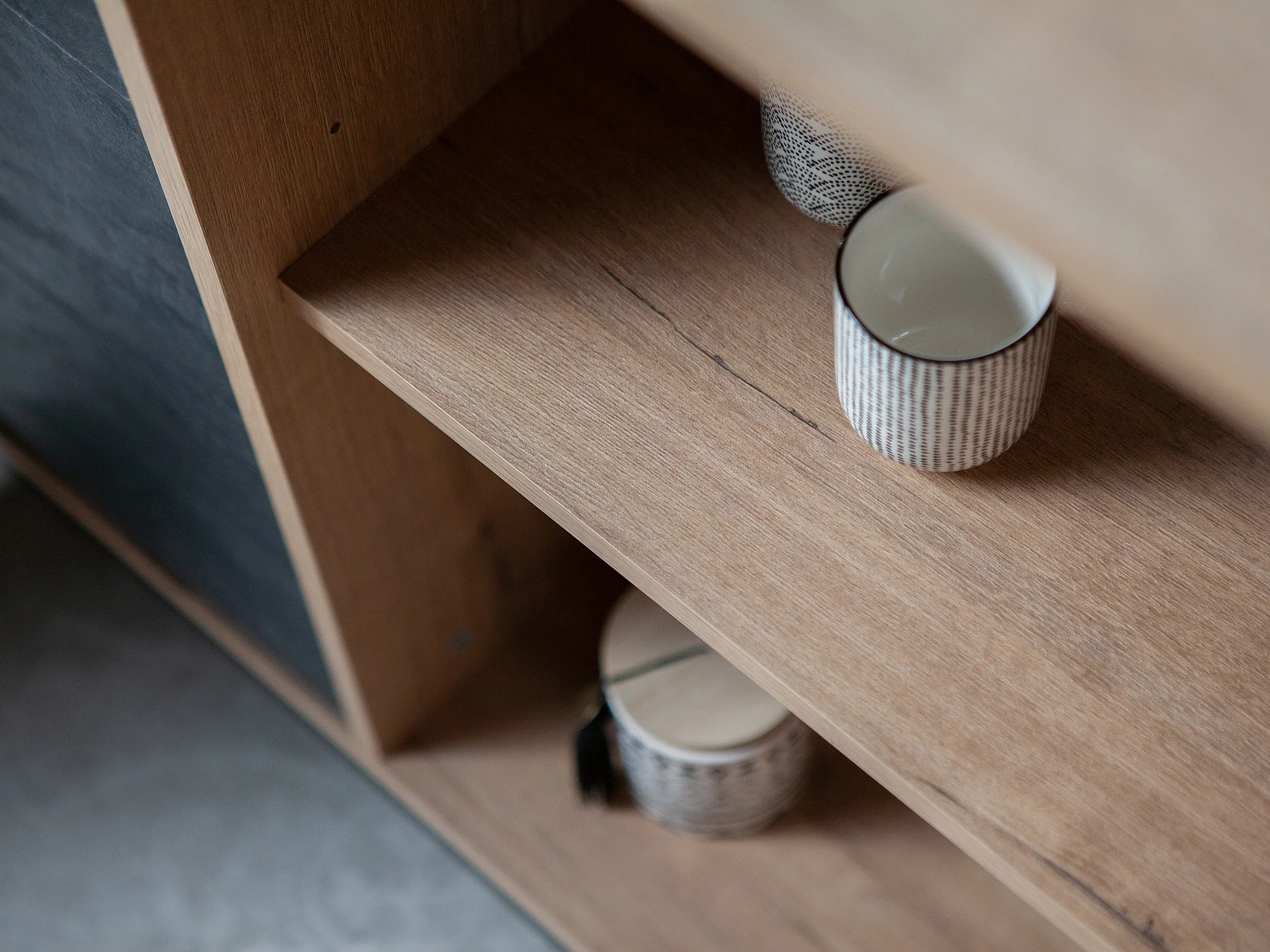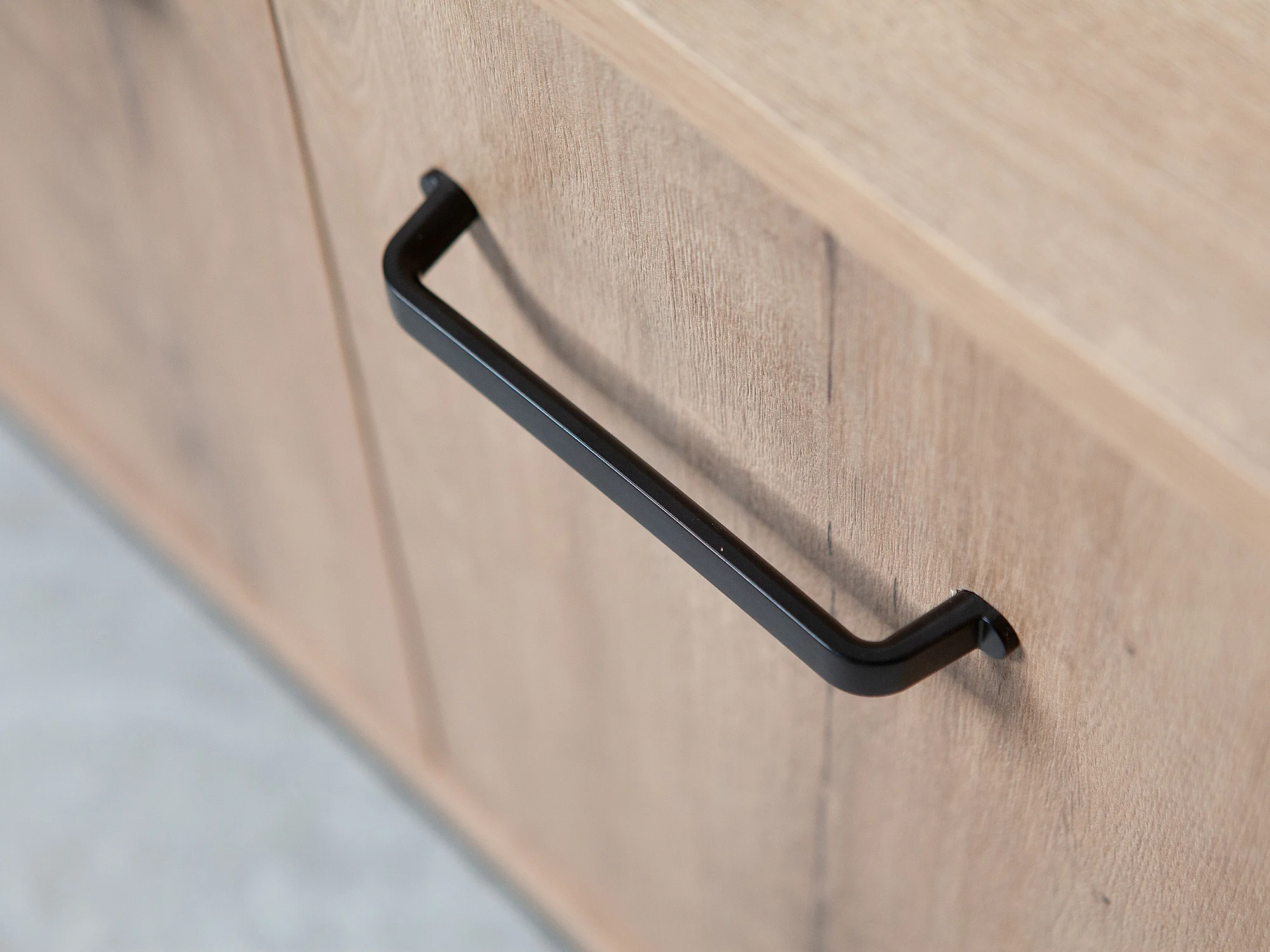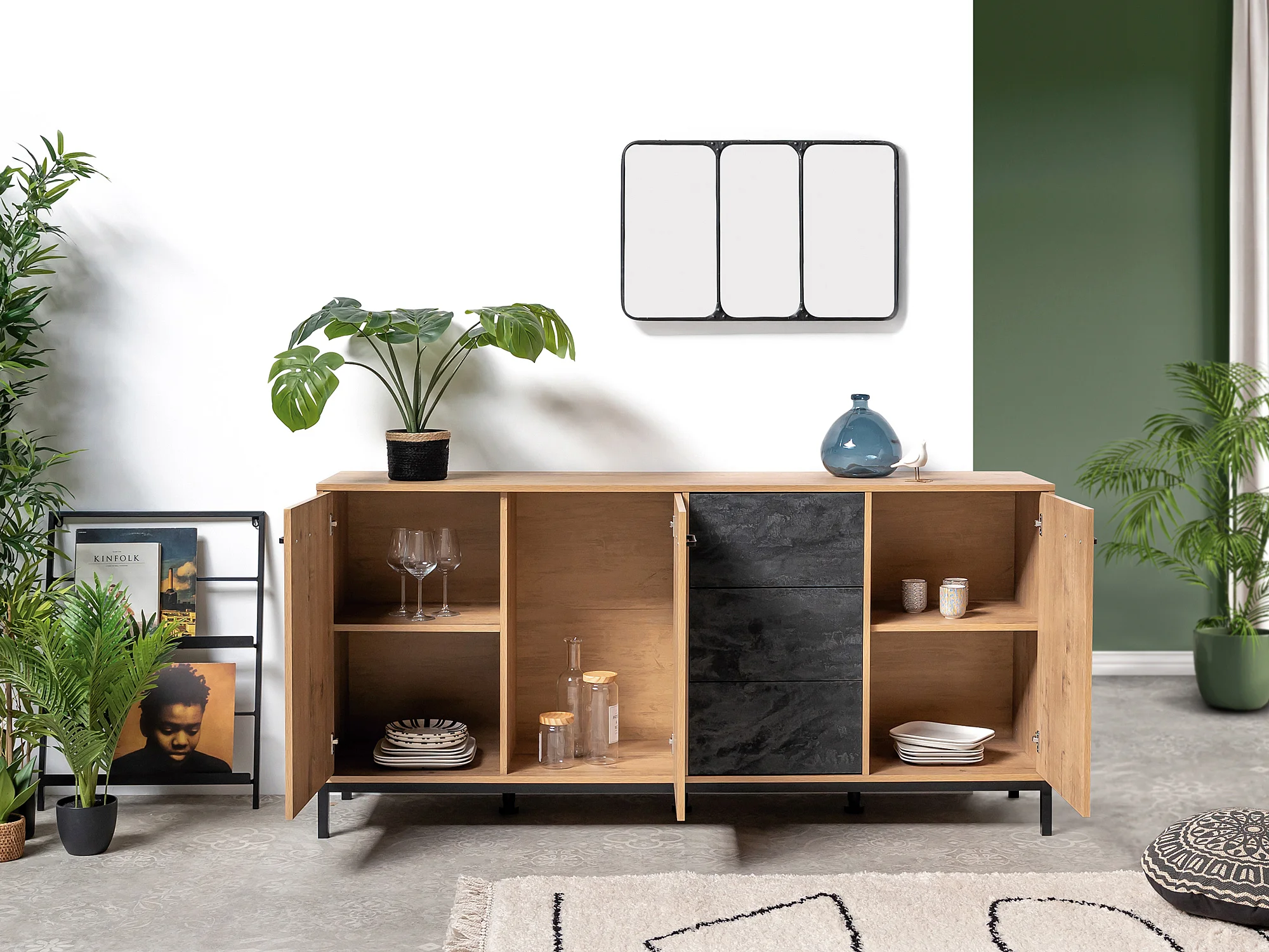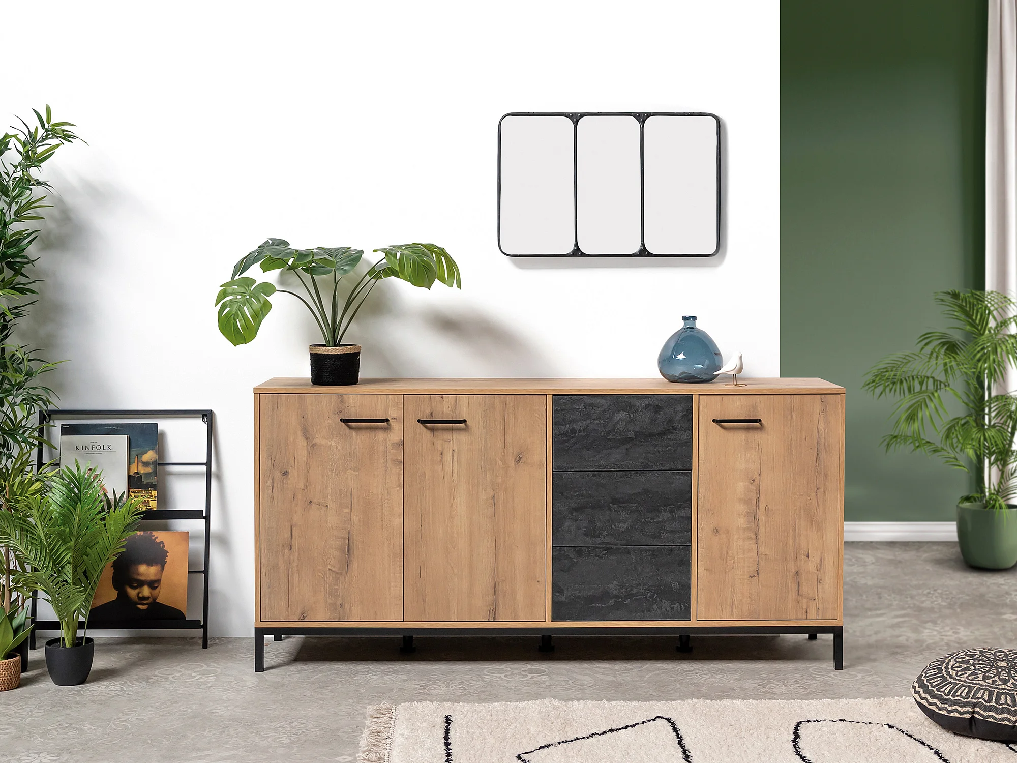 Buffet commode meuble de rangement 3 portes coloris chêne doré/effet marbre noir - Longueur 180 x Profondeur 40 x Hauteur 85 cm