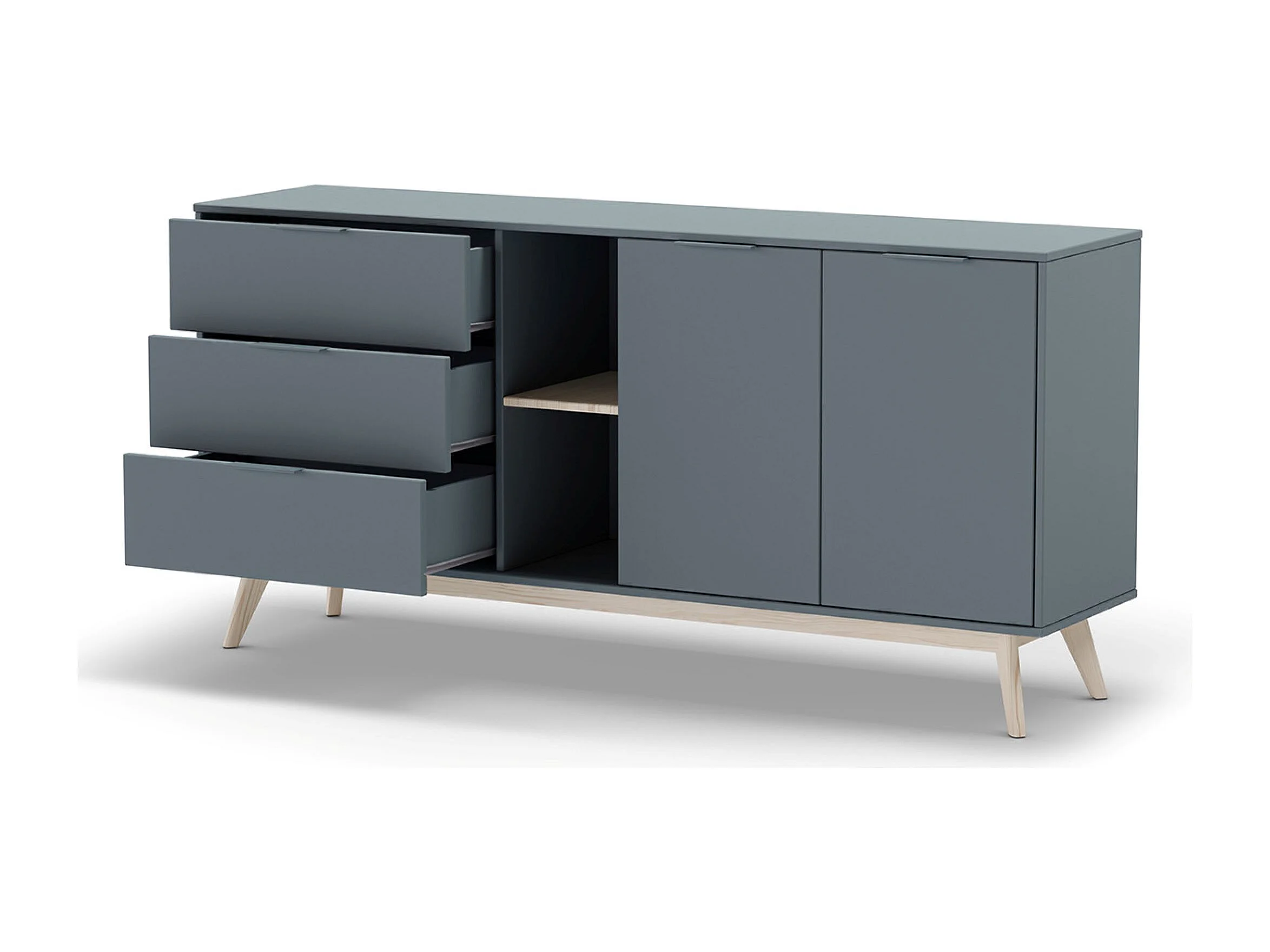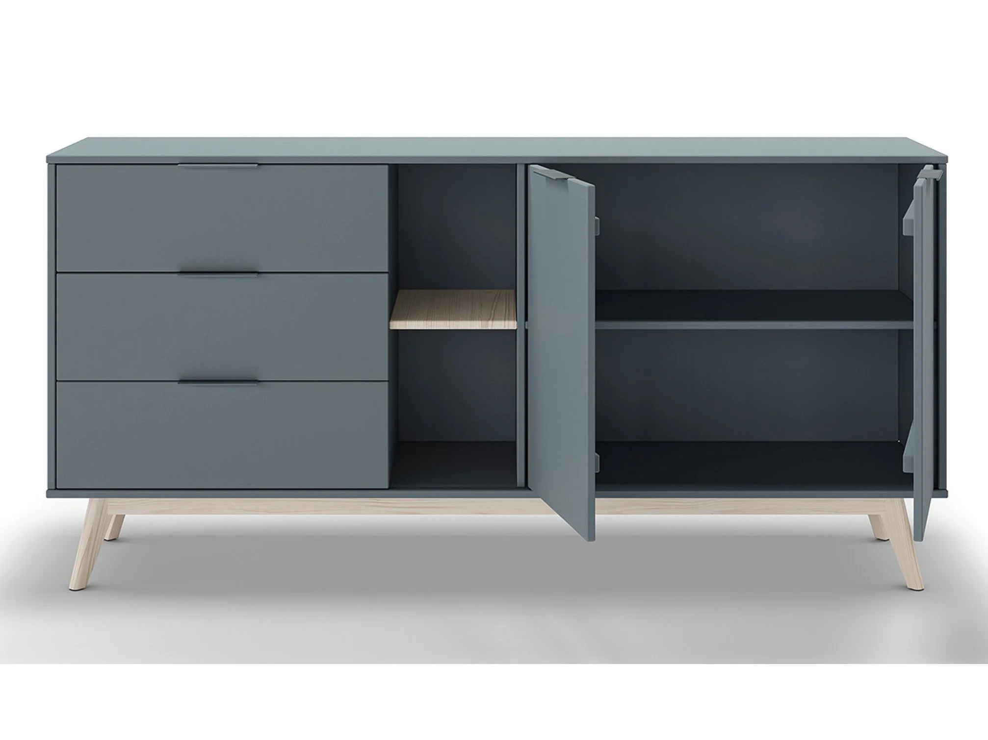 Buffet, commode rectangulaire avec 2 portes et 3 tiroirs aspect bois coloris Vert Kaki, pieds en pin coloris blanc ciré