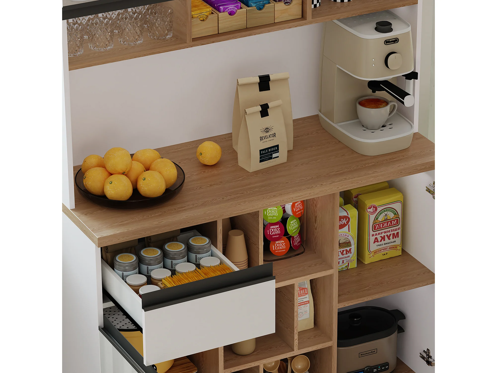Buffet de cuisine 105x48x185cm avec 5 portes, 1 tiroir et niches, corps en blanc et noir laqué
