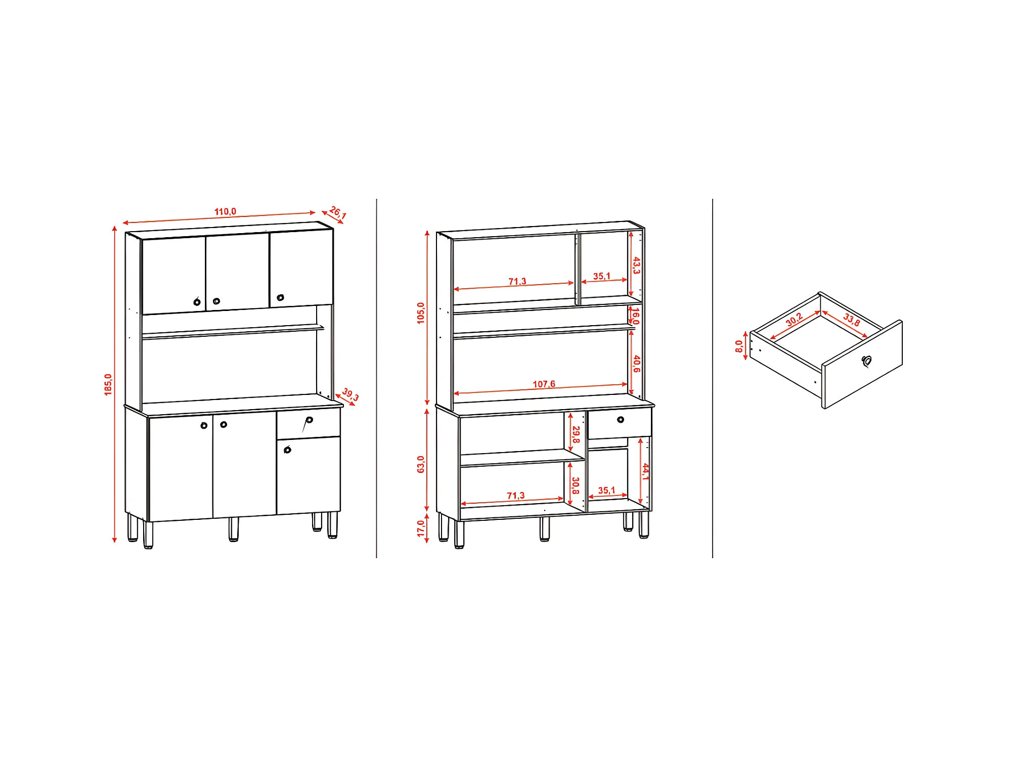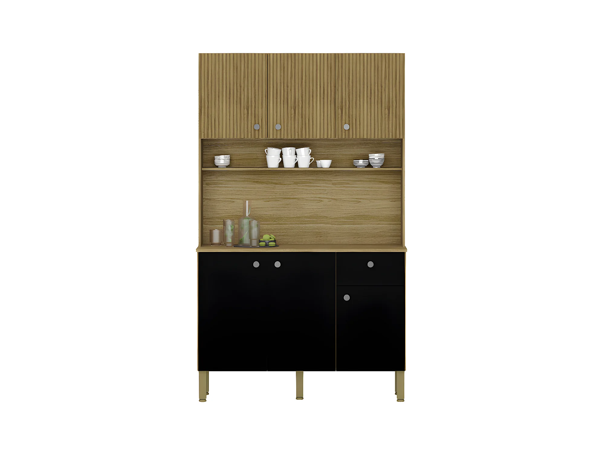 Buffet de Cuisine 6 Portes 1 Tiroir Chêne et Noir 7 Niches L 111 H 185 P 39.3 cm