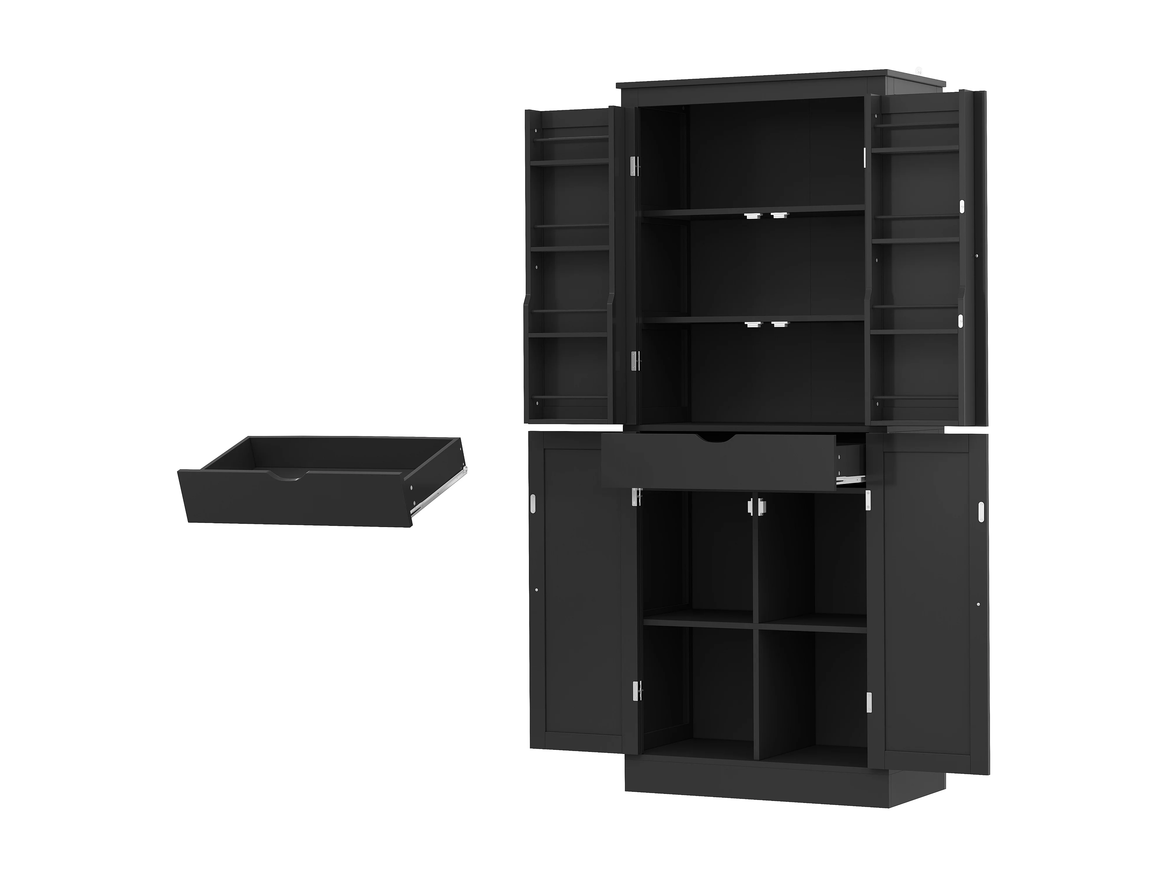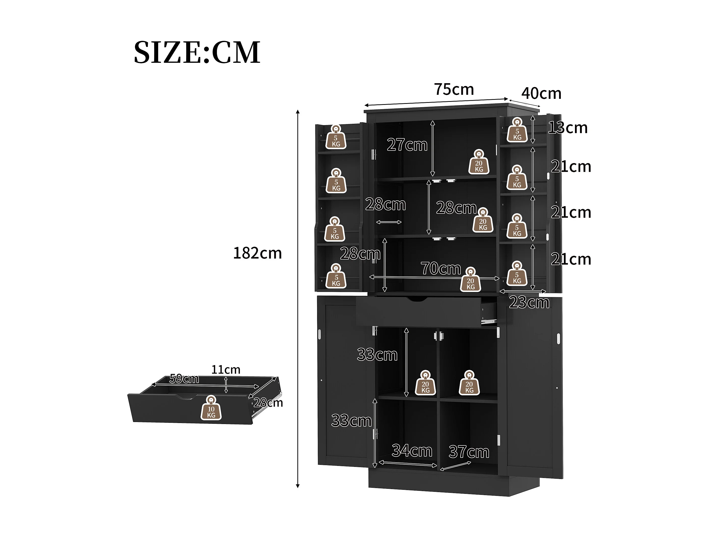 Buffet de cuisine 75x40x180cm - 2 portes de rangement avec étagères - 1 tiroir et compartiment de rangement - Noir