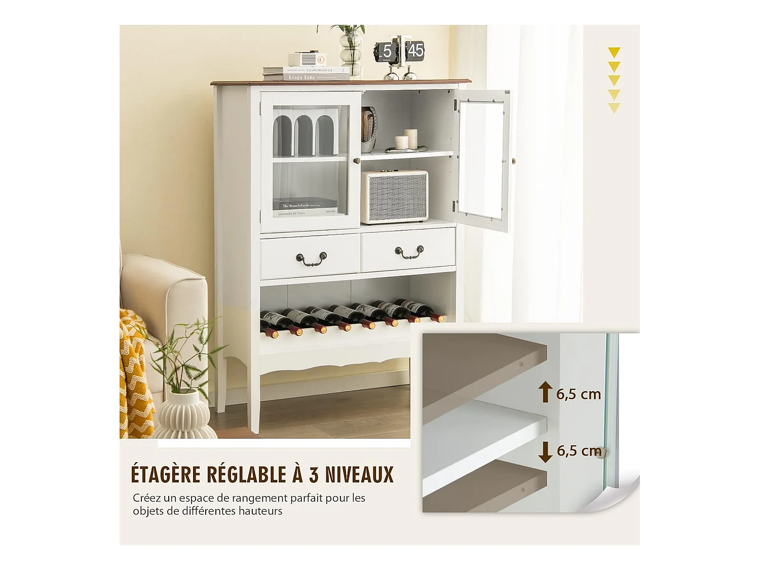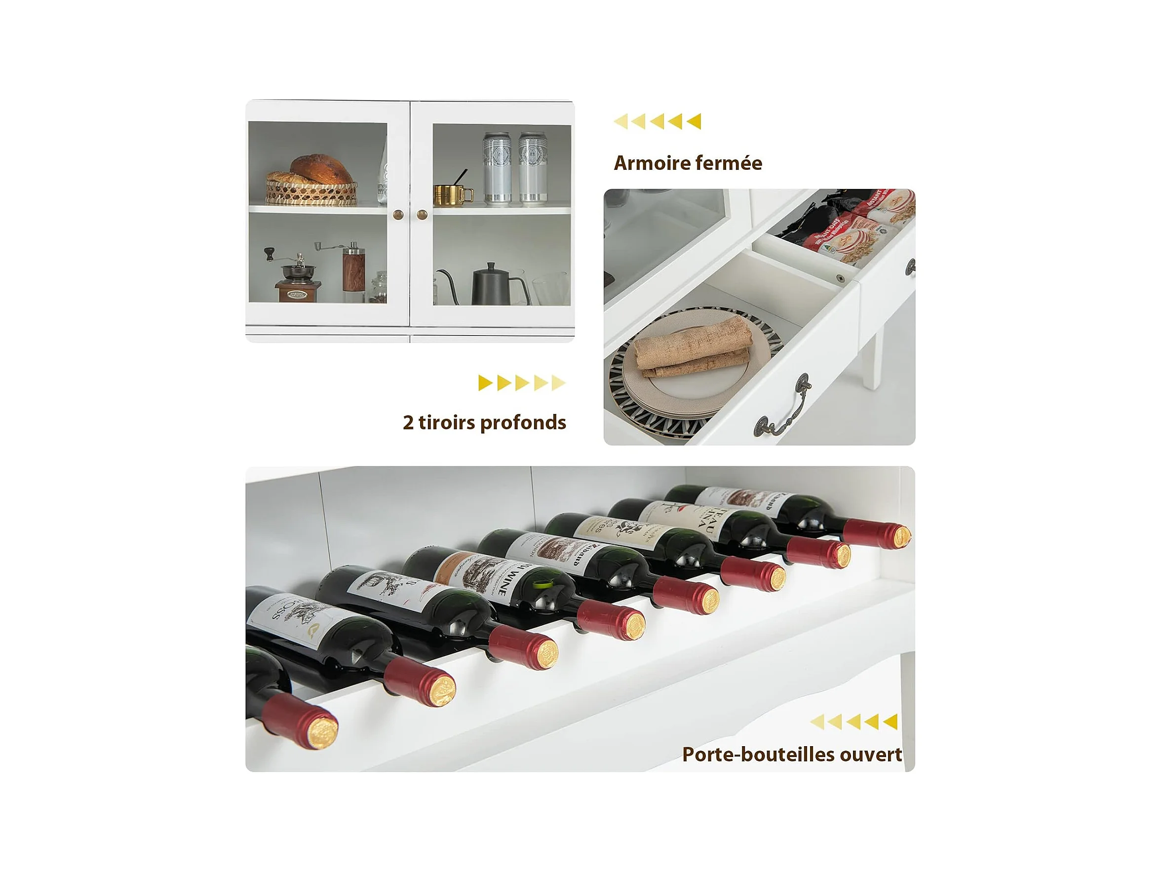 Buffet de cuisine à 2 portes vitrées avec 2 tiroirs porte-bouteilles,90x40x126,5cm blanc
