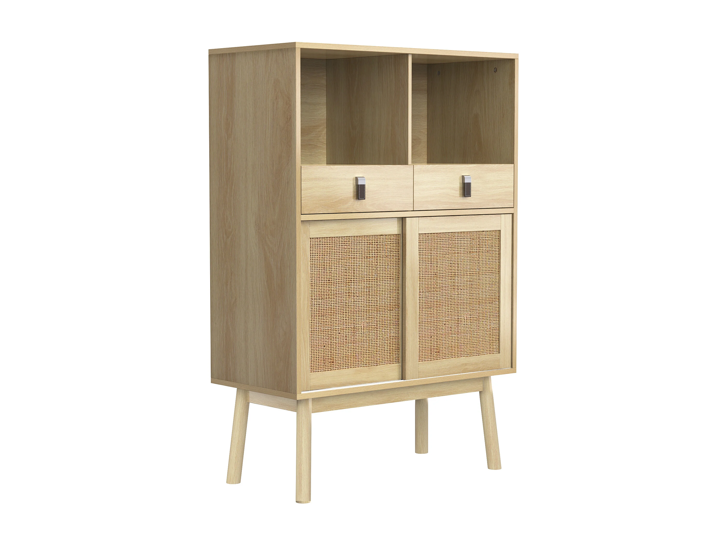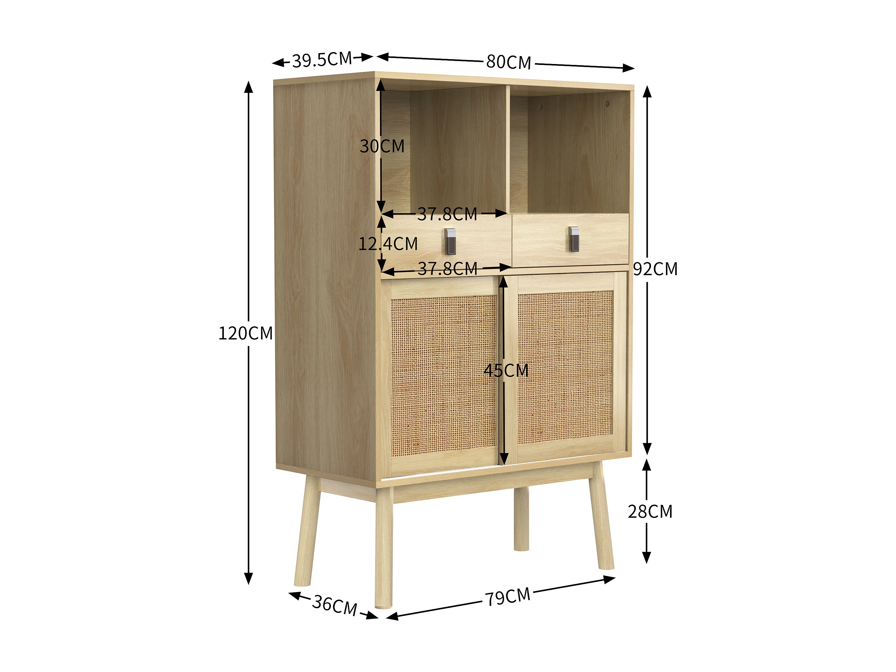 Buffet de cuisine avec 2 tiroirs et 2 portes coulissantes en rotin - 80 x 39,5 x 120 cm - Panneau de particules - Coloris bois