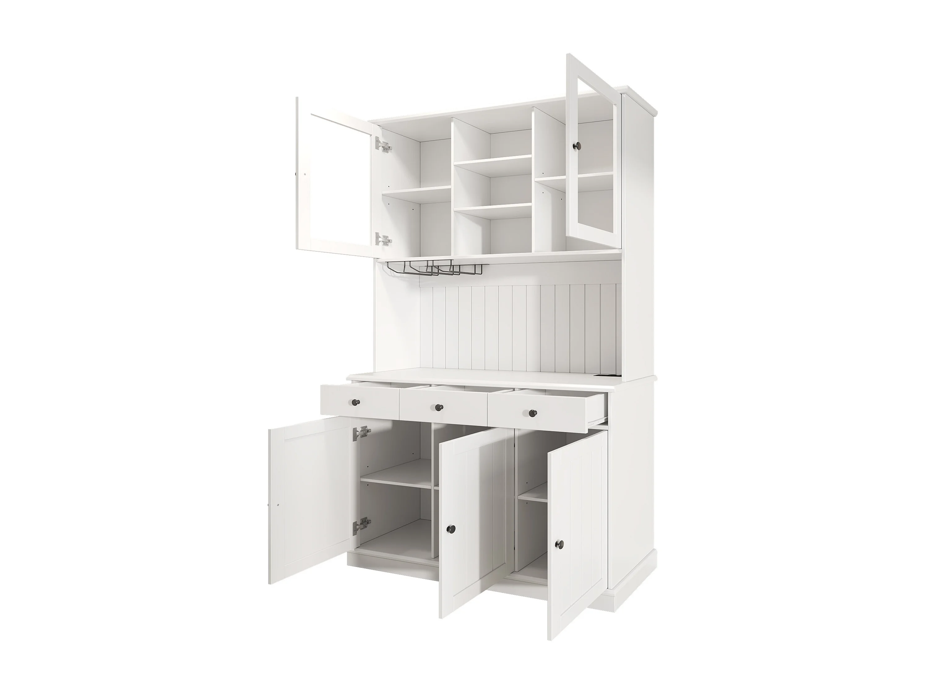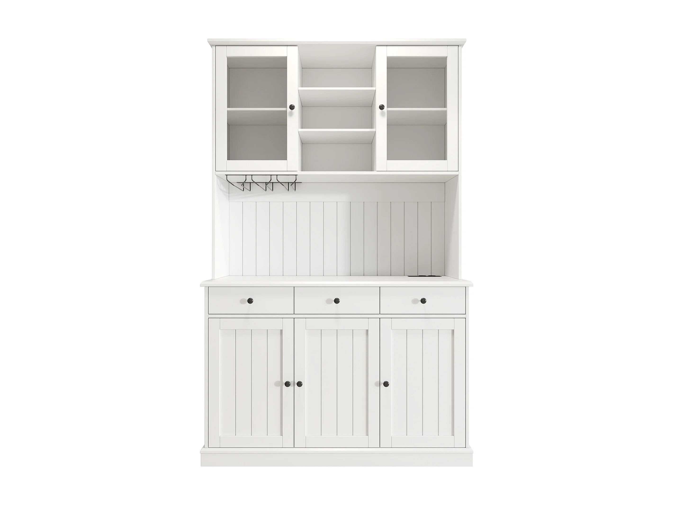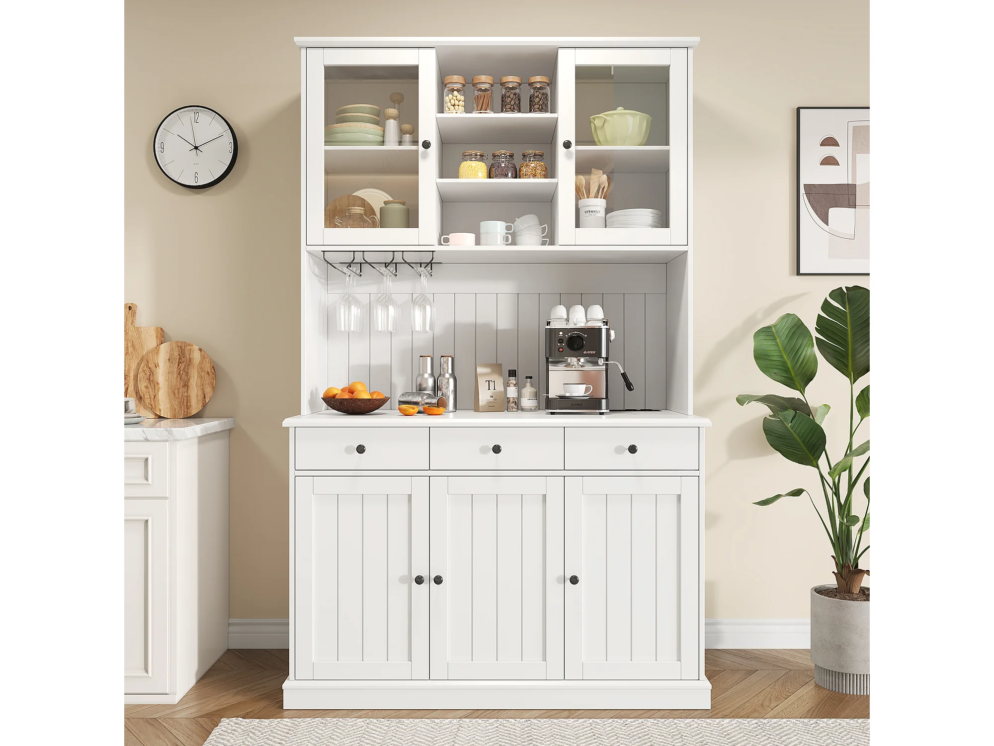 Buffet de cuisine avec 5 portes ,3 tiroirs et porte-verres, prise électrique - Blanc