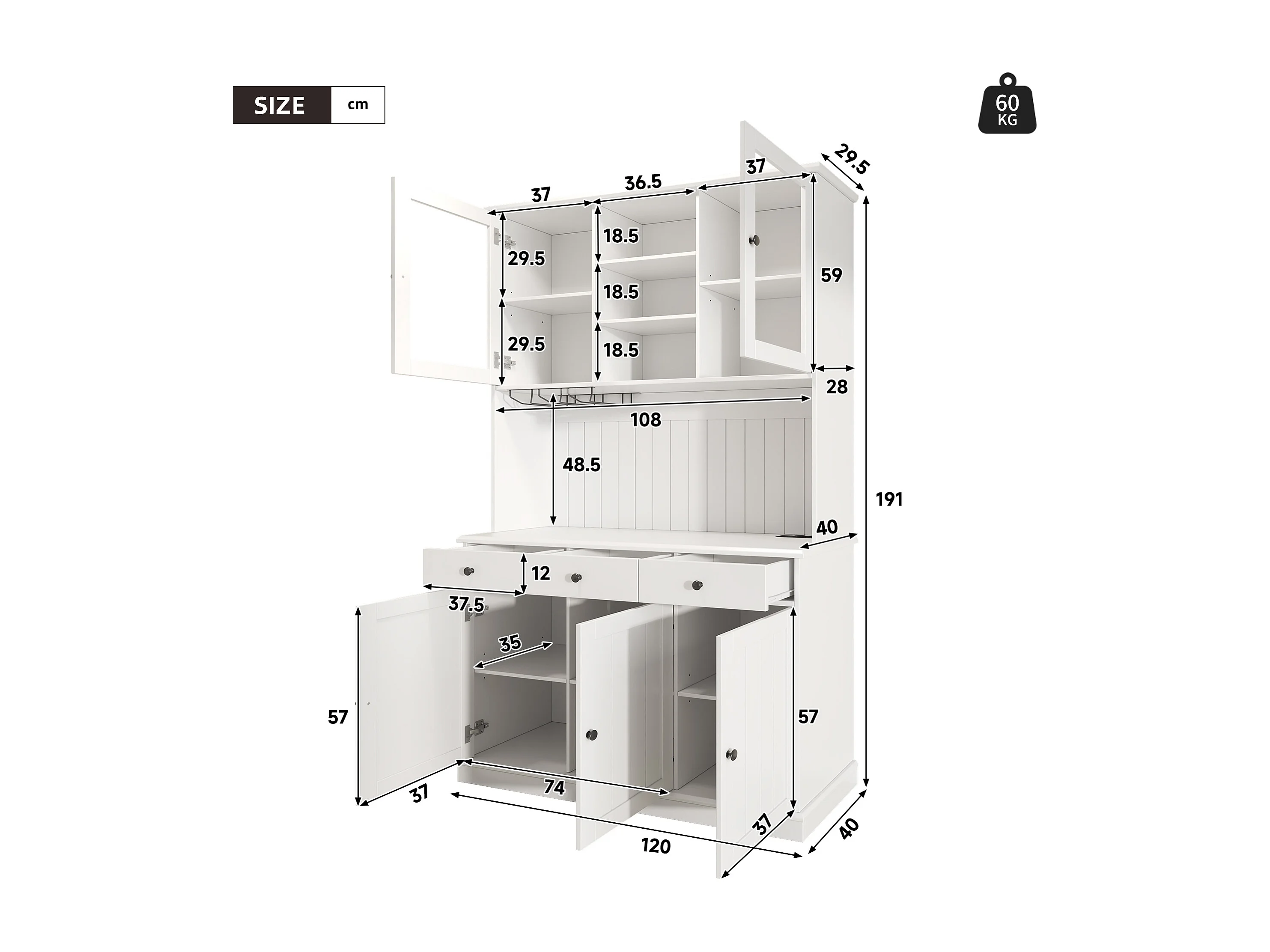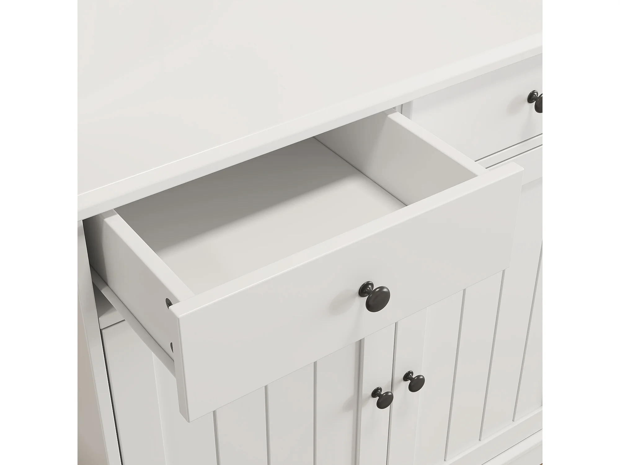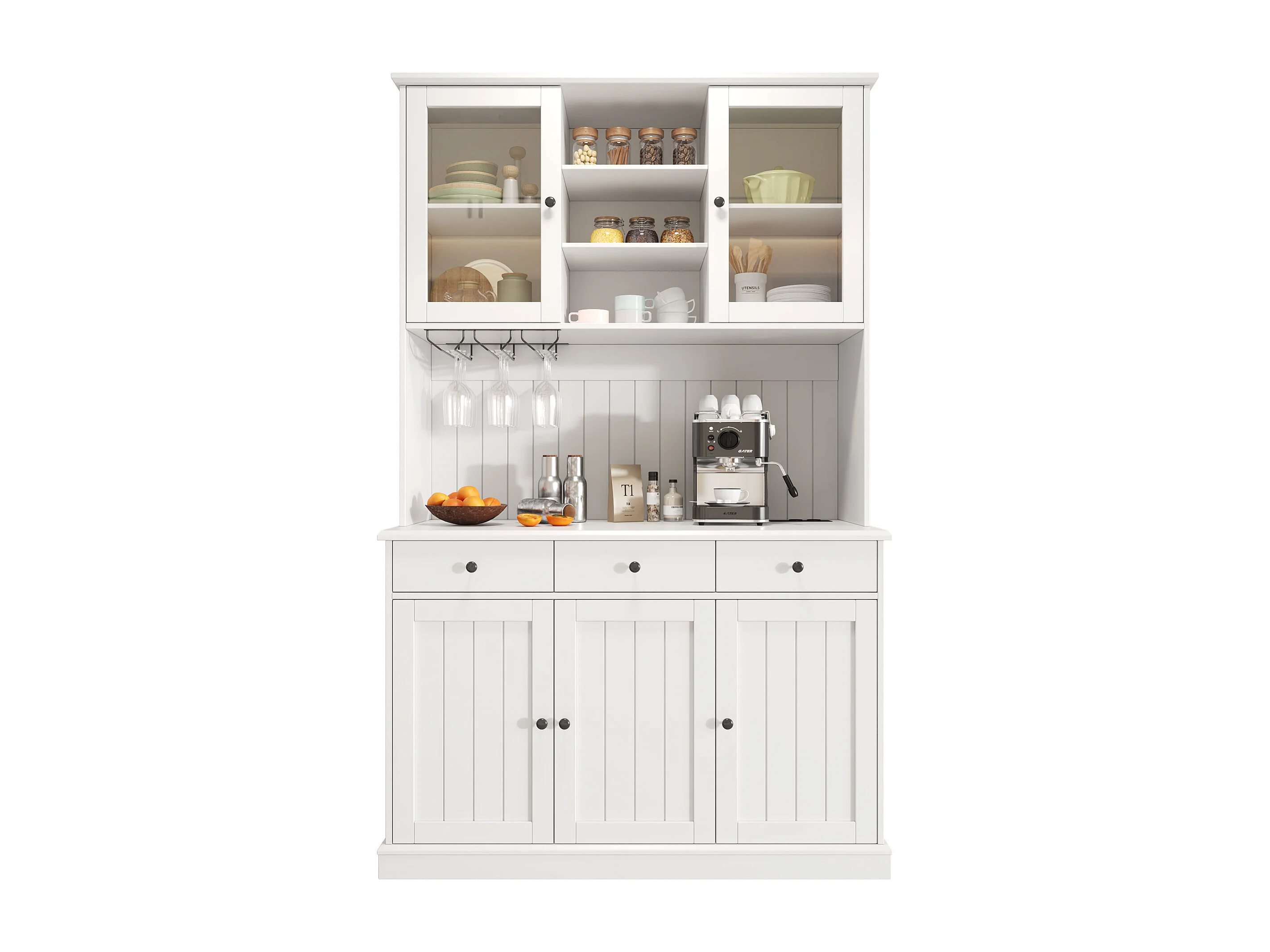 Buffet de cuisine avec 5 portes ,3 tiroirs et porte-verres, prise électrique - Blanc