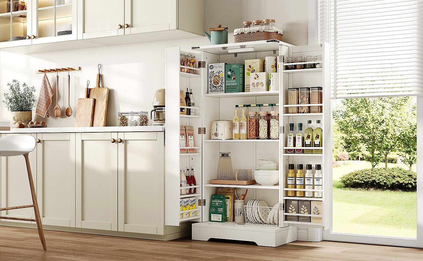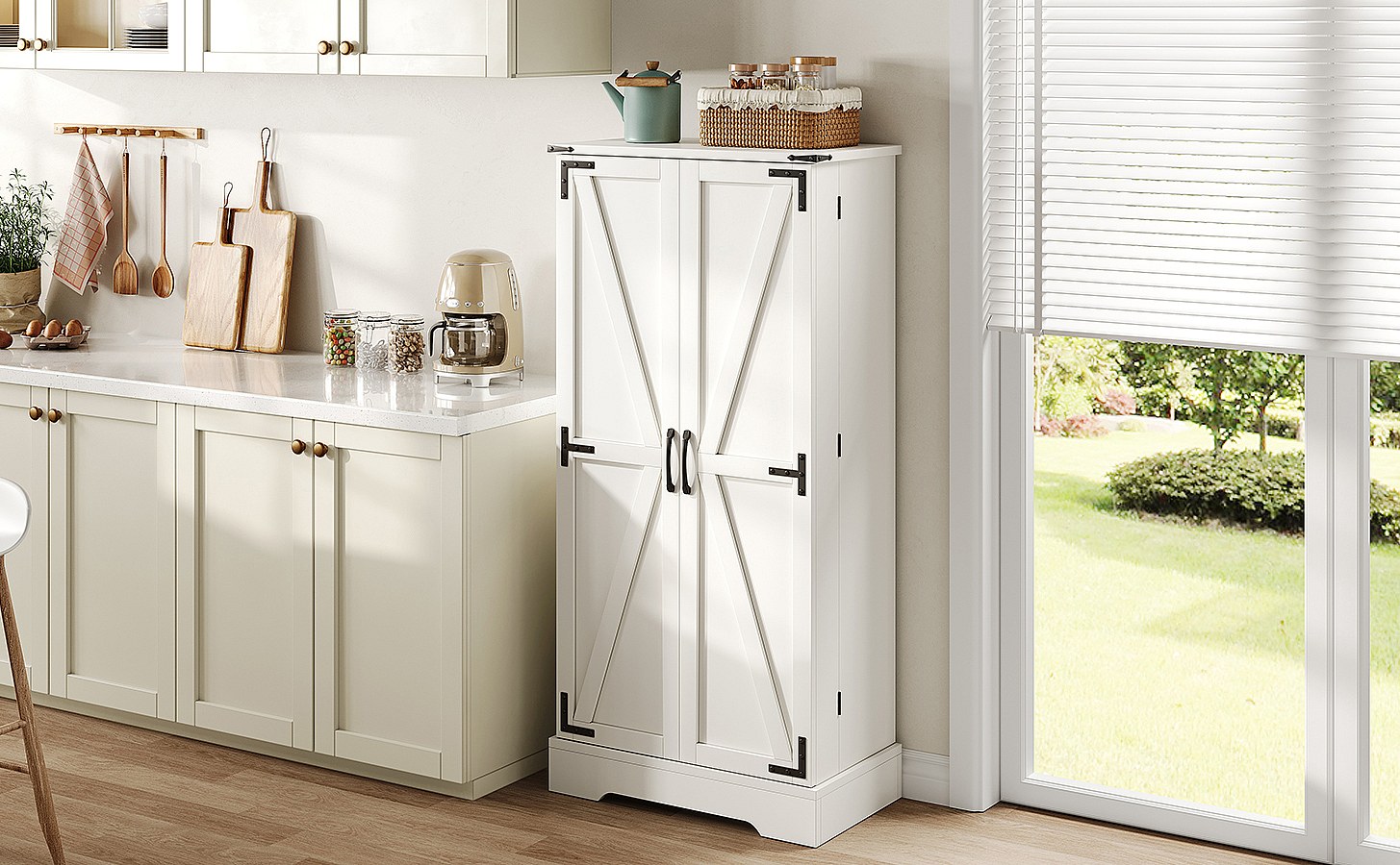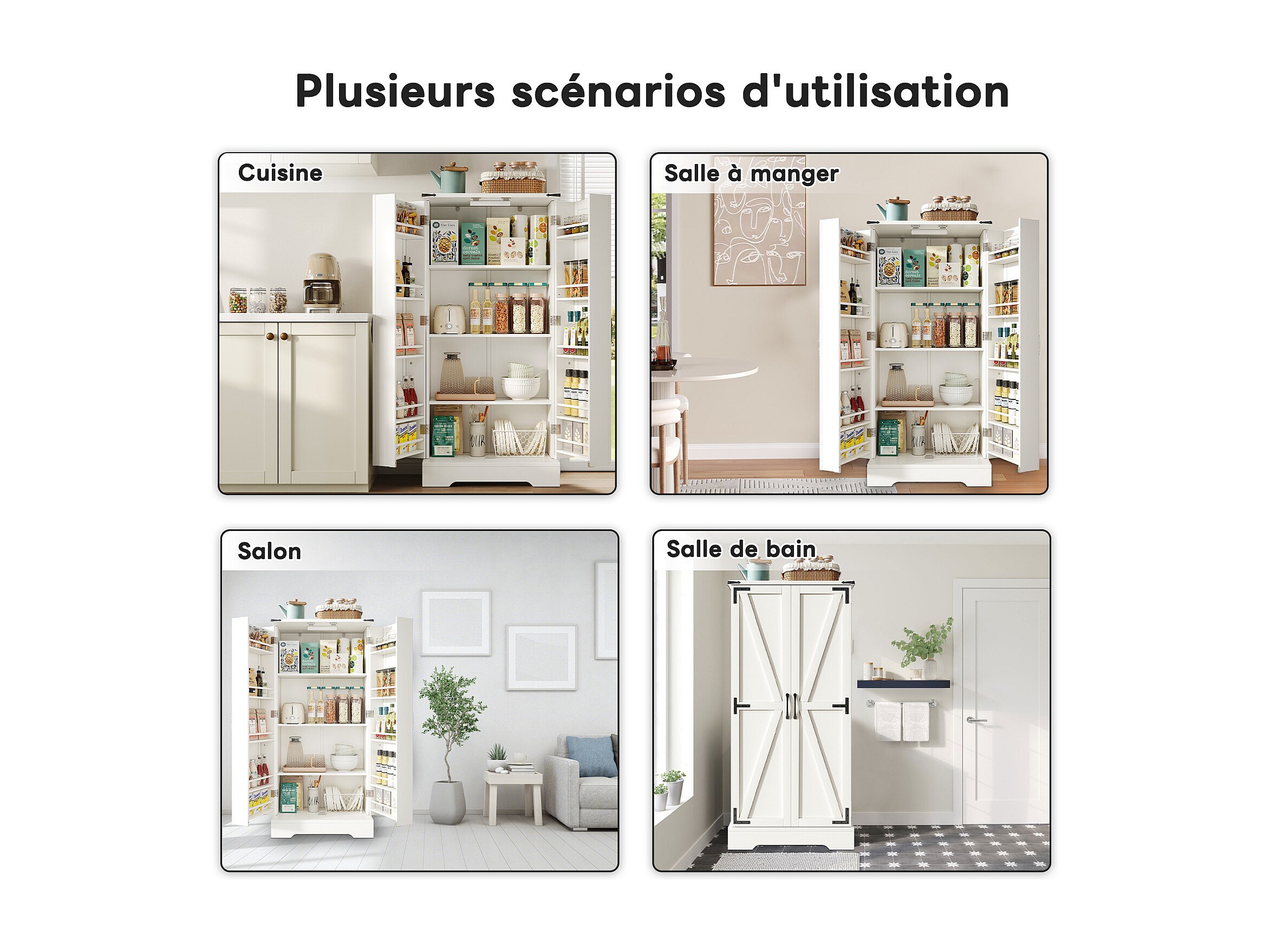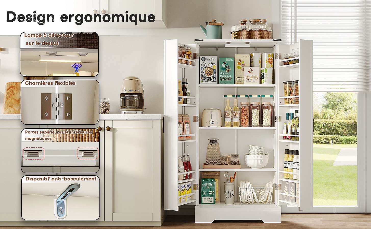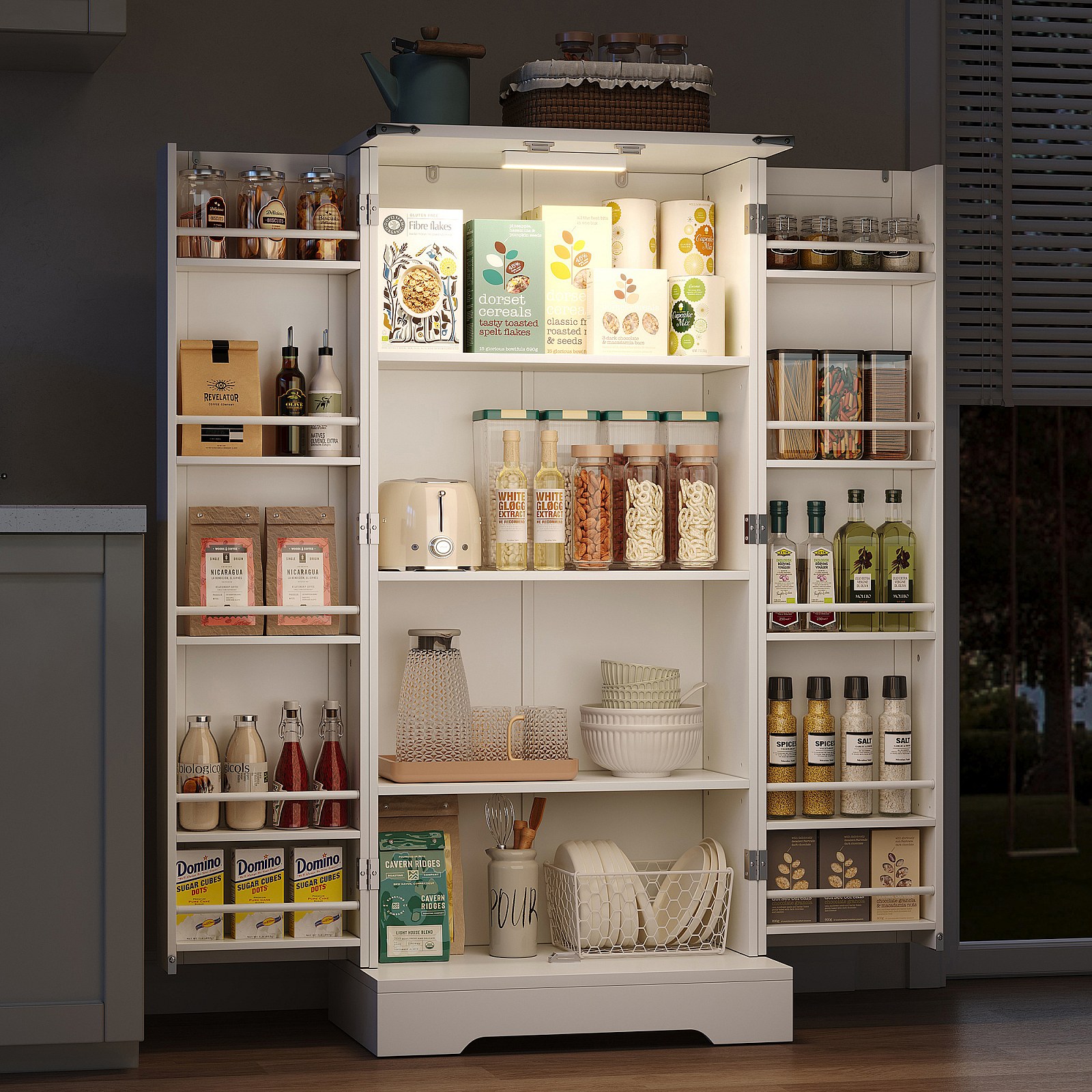 Buffet de cuisine avec LED, 2 portes battantes et étagères réglables – 128,5 cm, Meuble de rangement blanc pour salle à manger ou salon