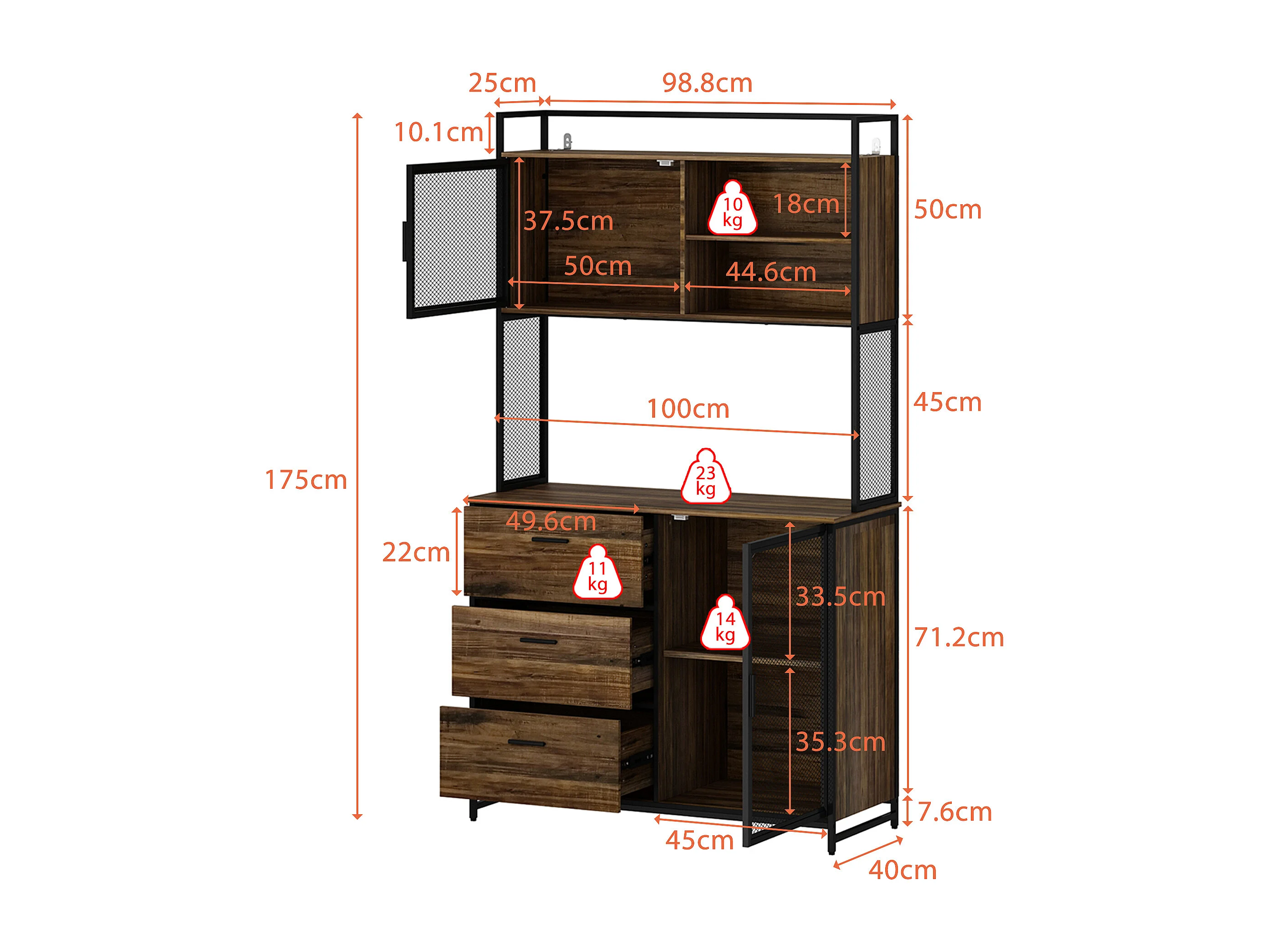Buffet de Cuisine avec 2 Portes en Métal et 3 Tiroirs et Compartiments, Armoire de Cuisine avec Aspect du Bois, 100x40x175, Marron