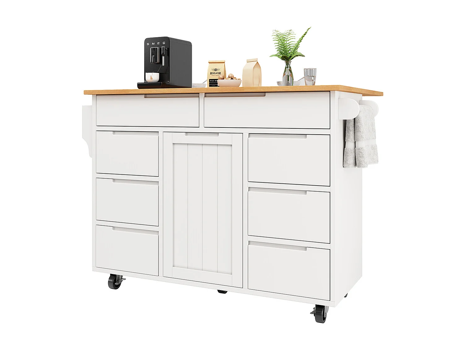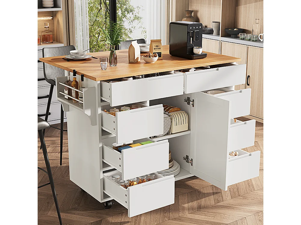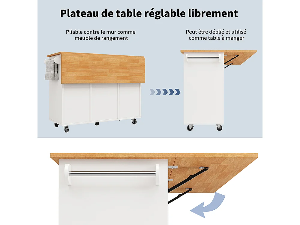 Buffet de cuisine blanc moderne extensible avec roulettes plan de travail étagère à épices et 8 tiroirs chariot de service fonctionnel