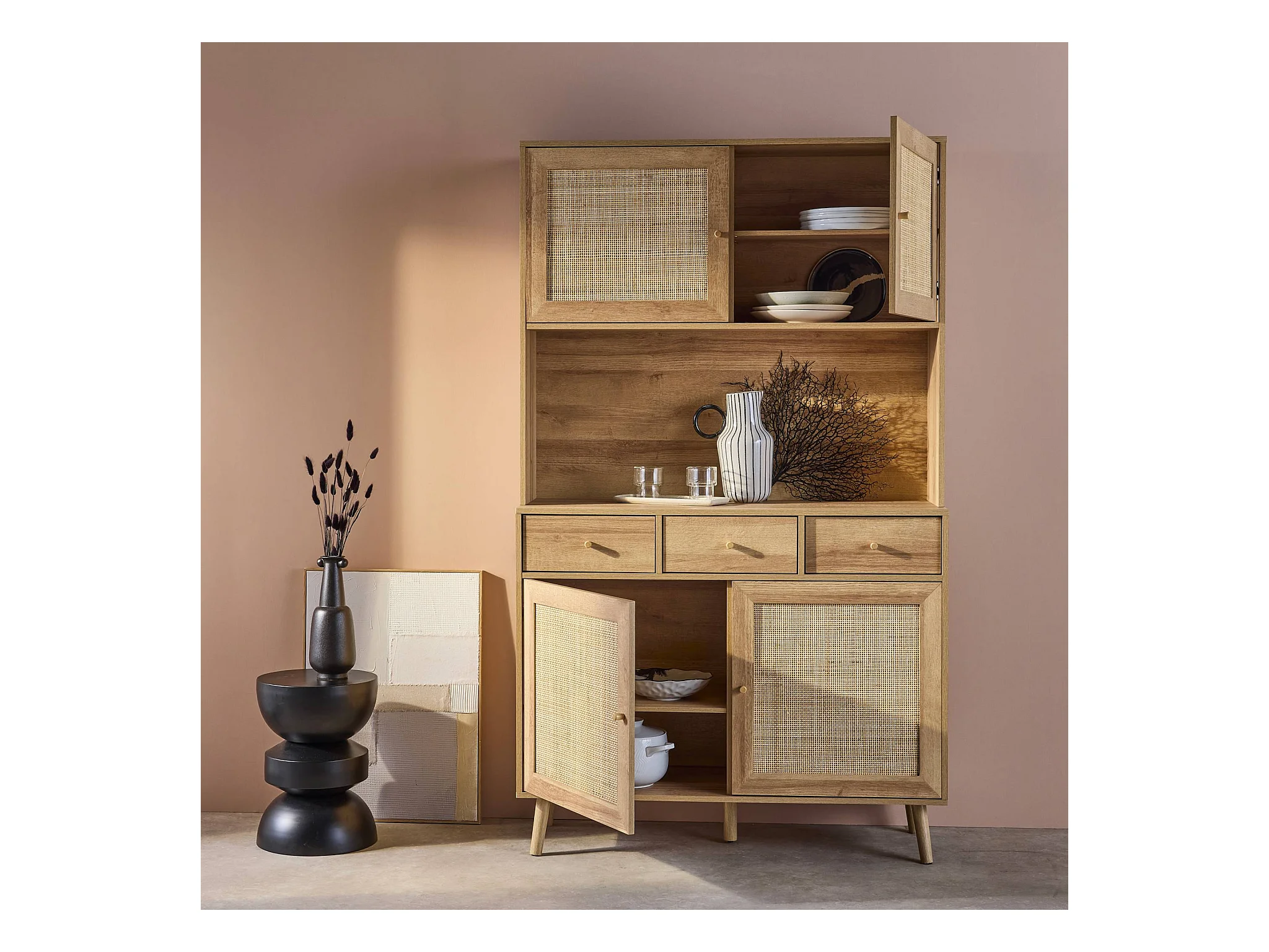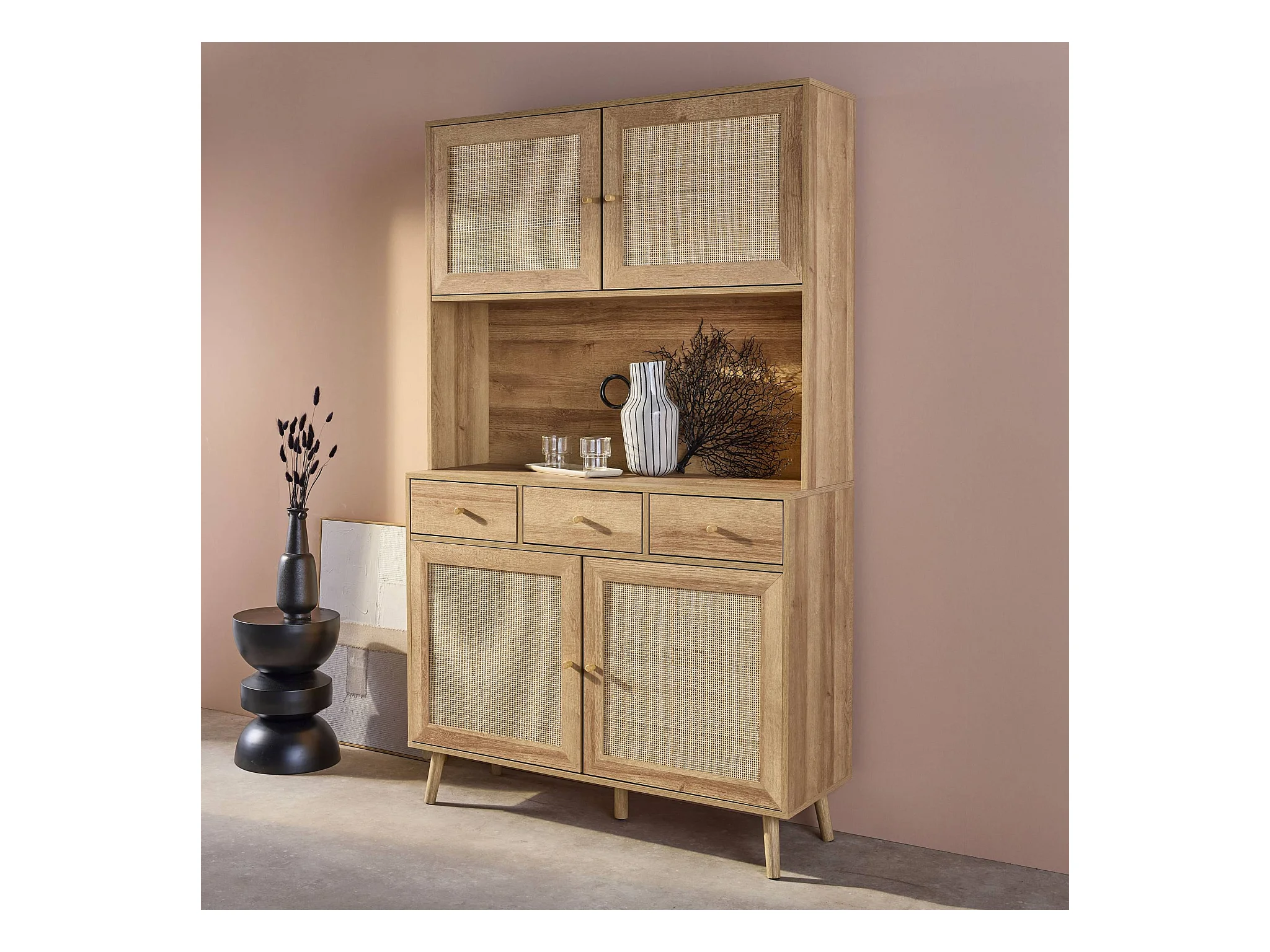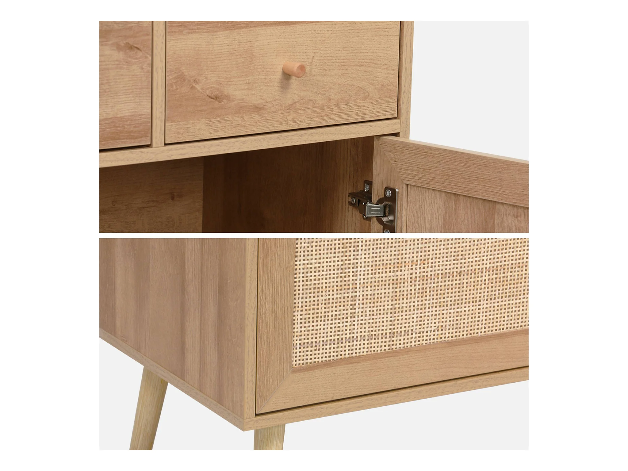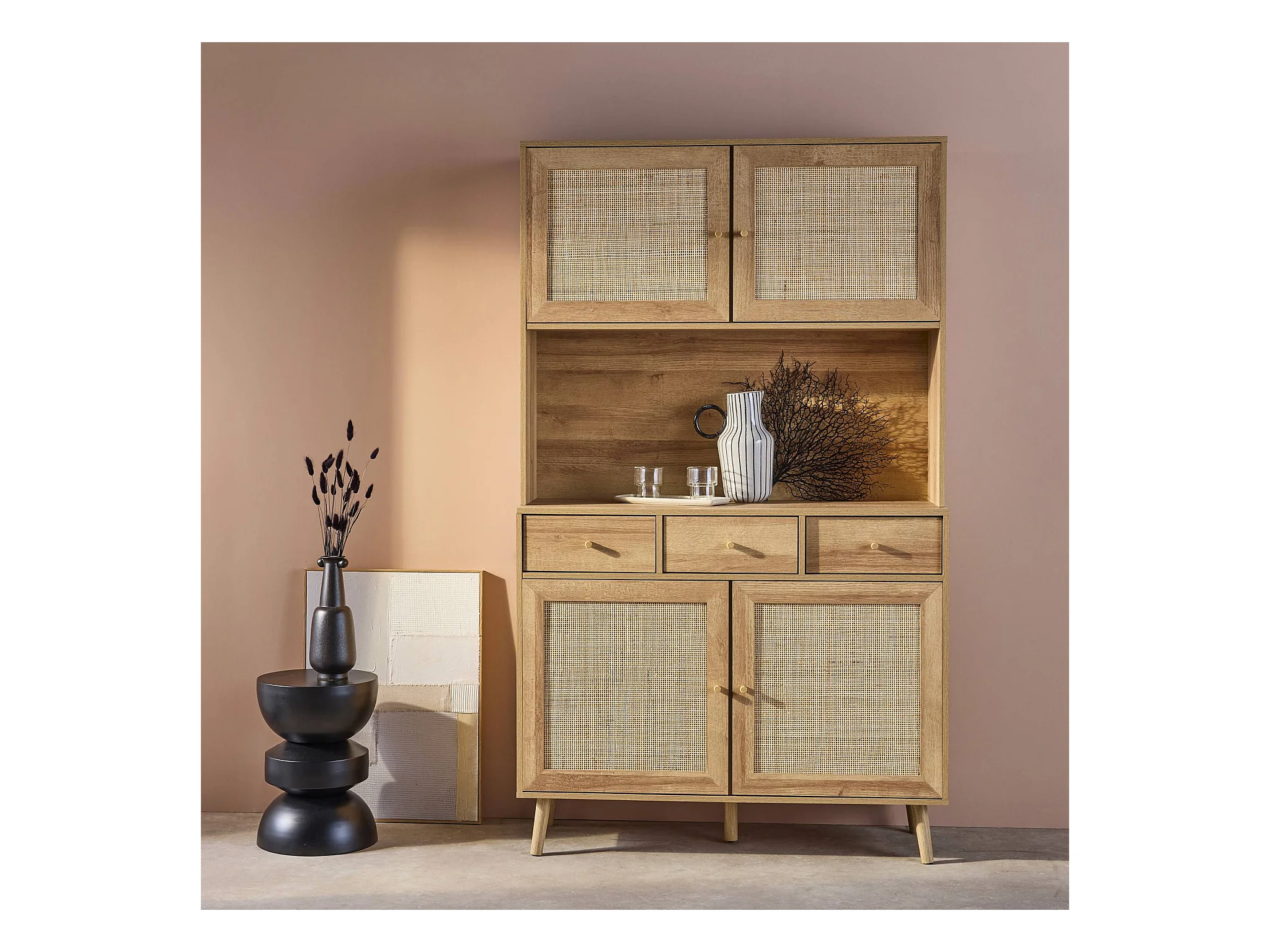 Buffet de cuisine BOHEME décor bois et cannage 4 portes 3 tiroirs 110 cm. Naturel. pieds en bois de pin revêtement papier