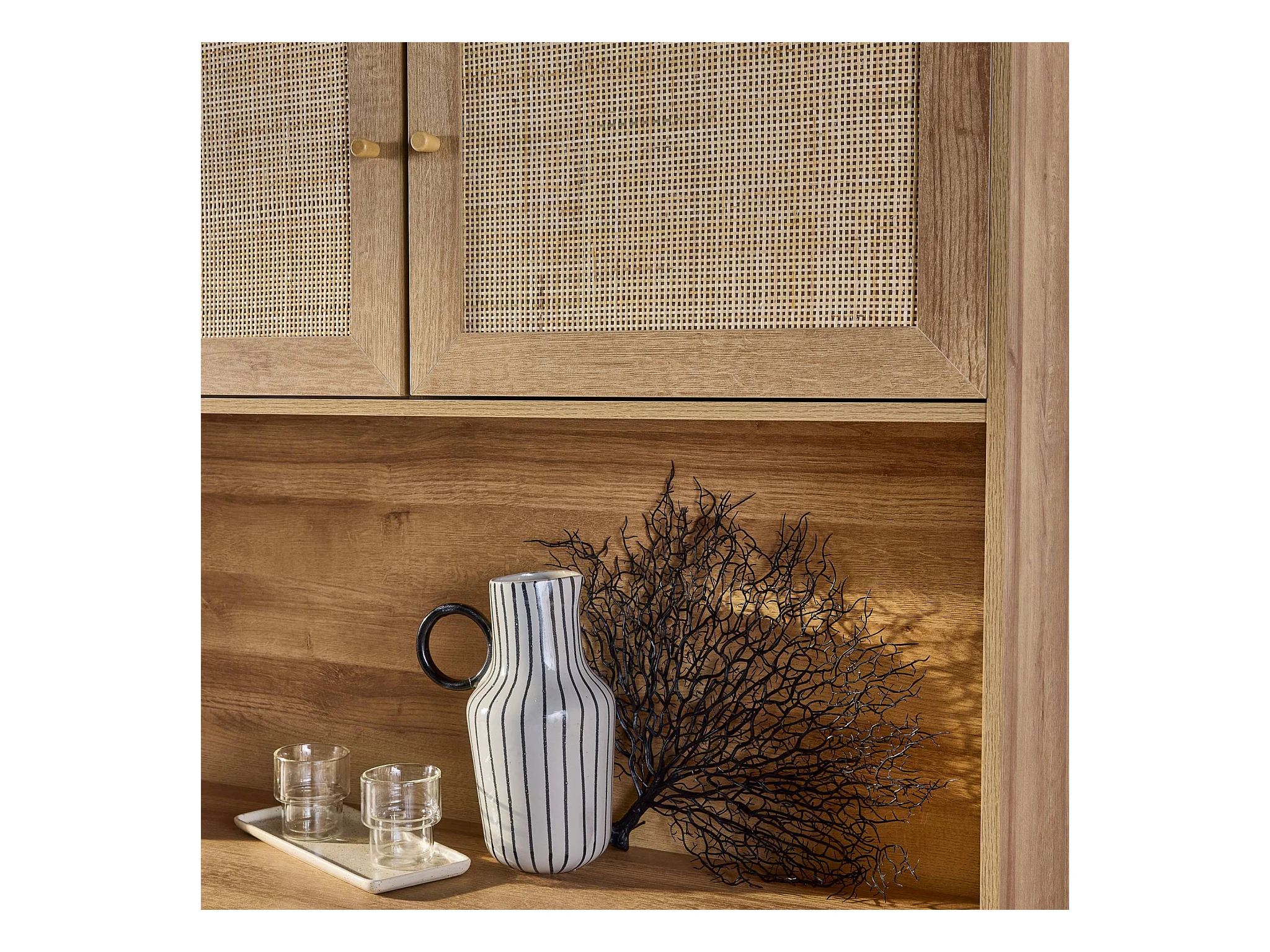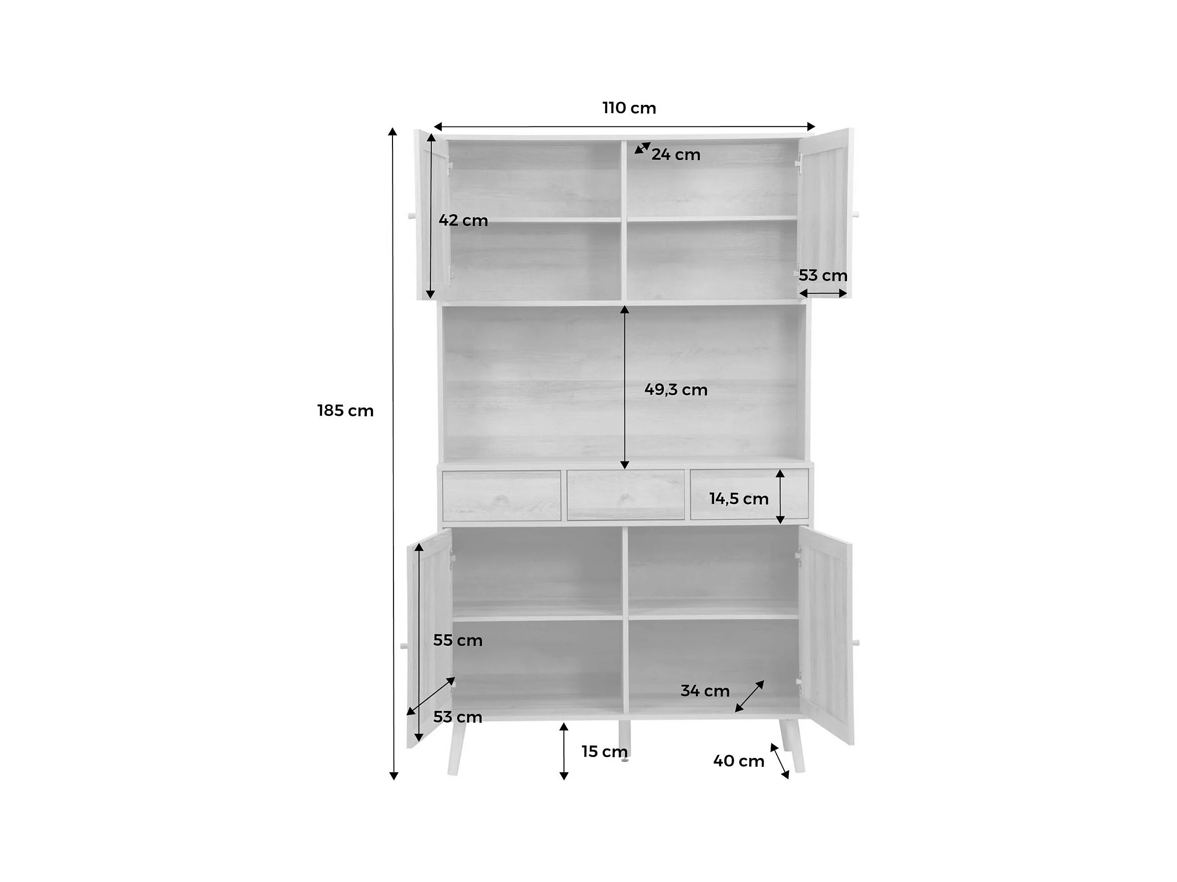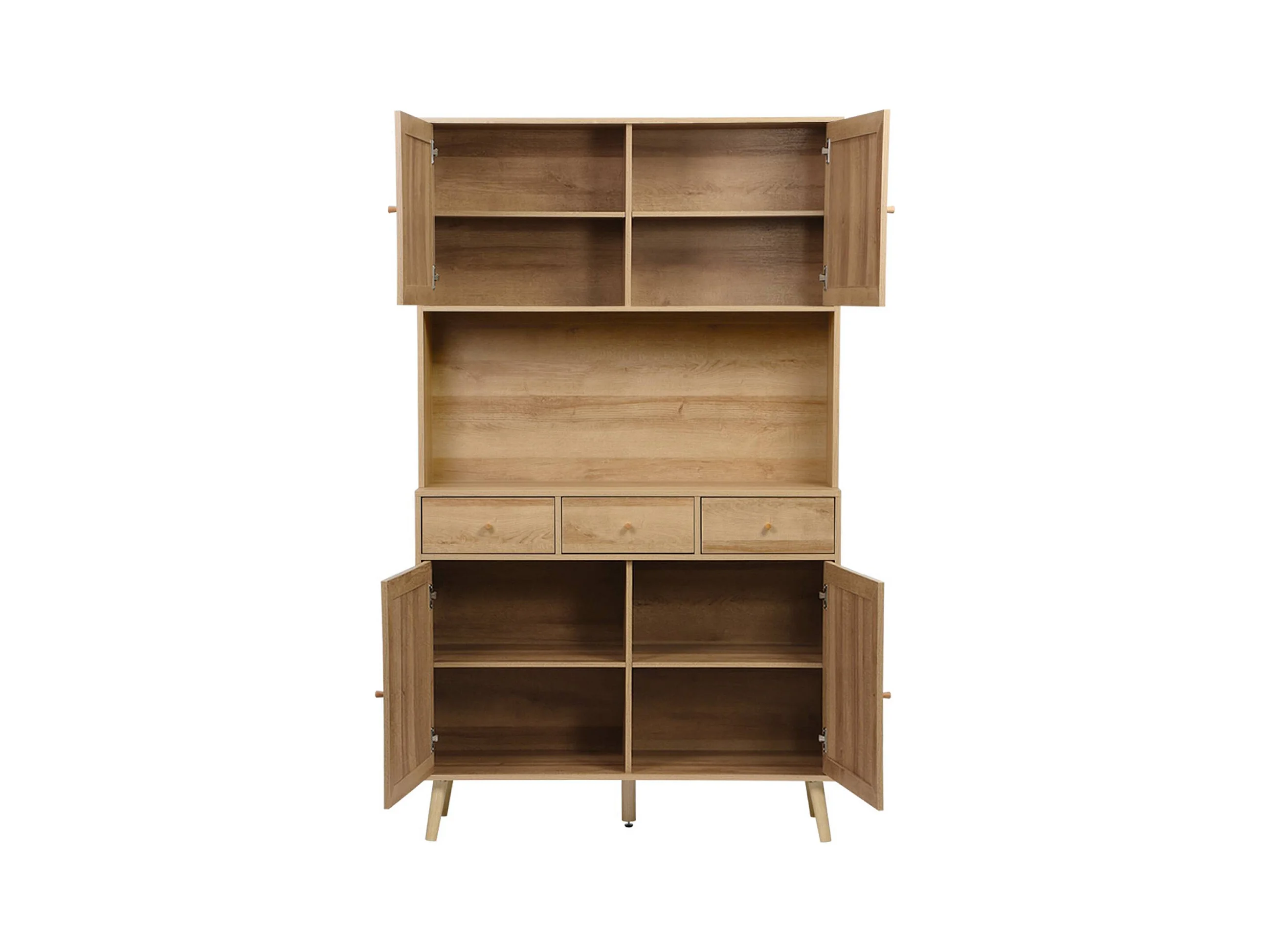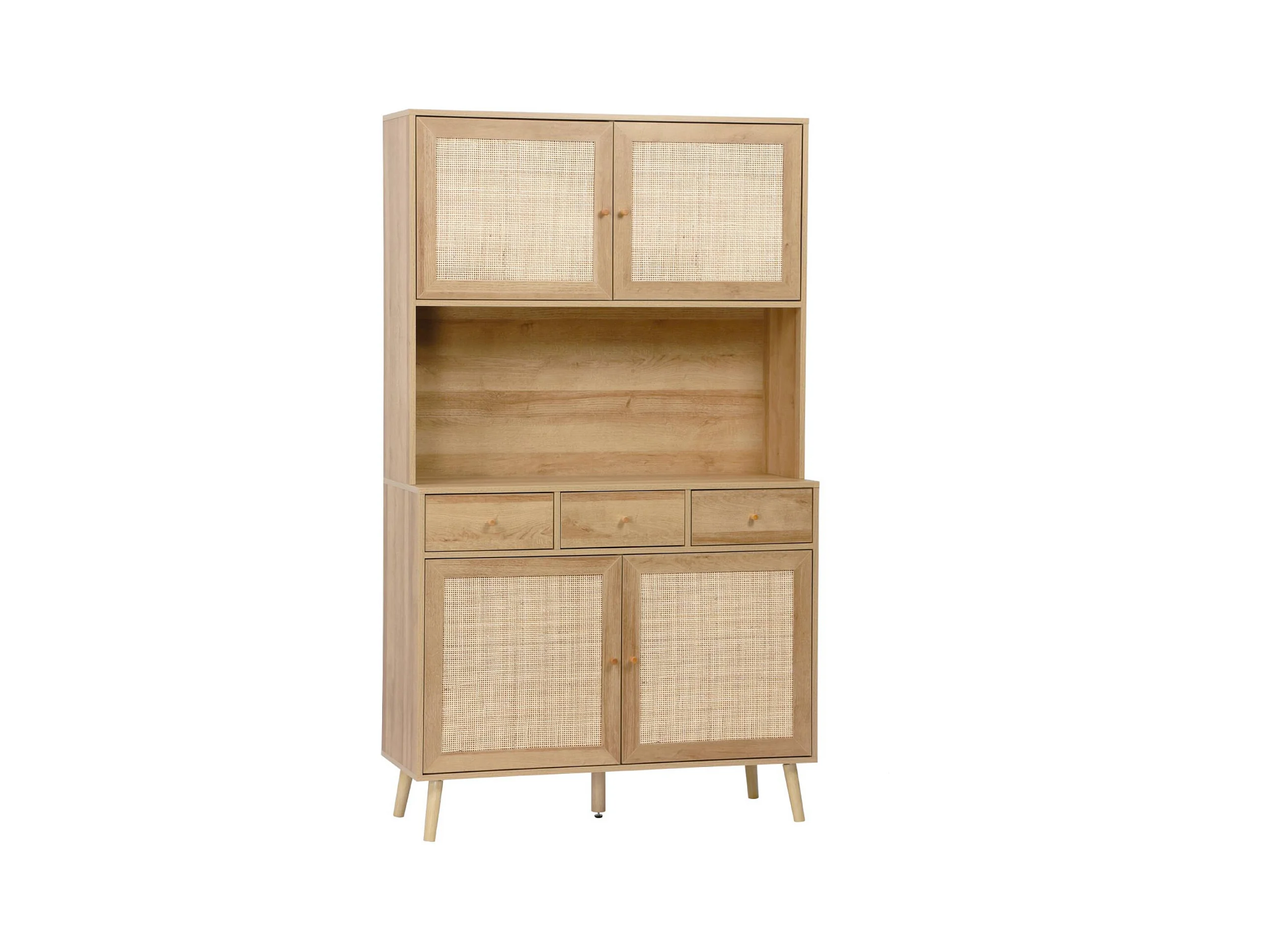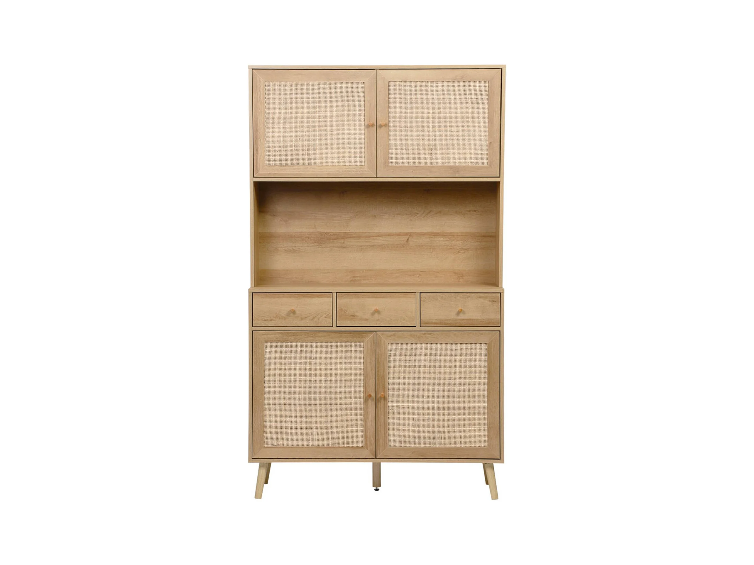 Buffet de cuisine BOHEME décor bois et cannage 4 portes 3 tiroirs 110 cm. Naturel. pieds en bois de pin revêtement papier
