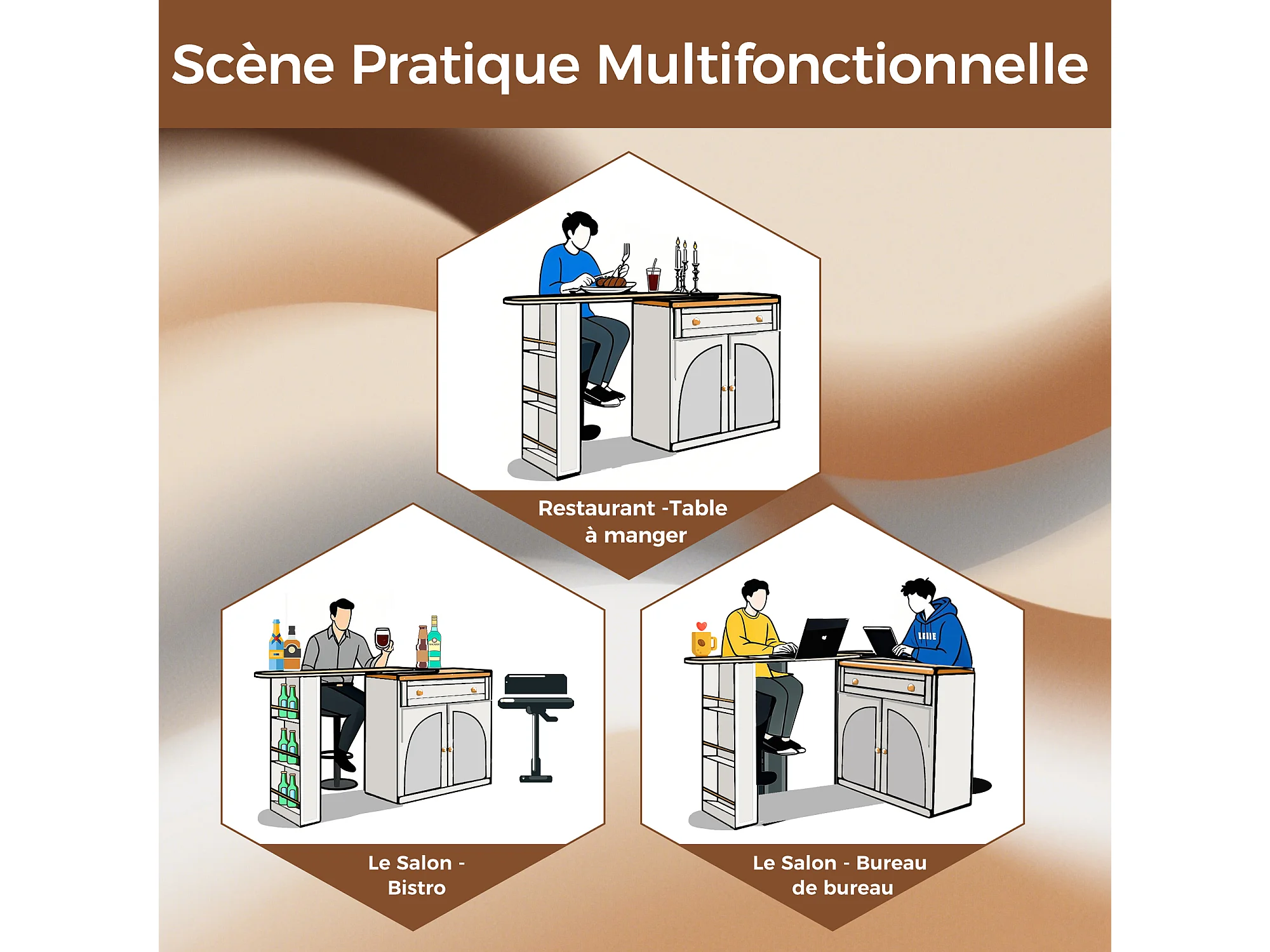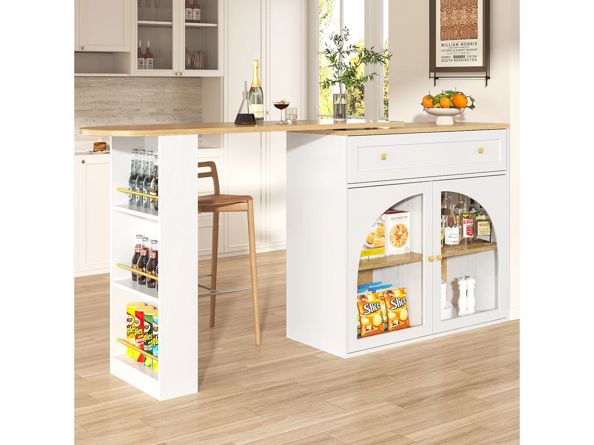 Buffet de cuisine extensible, table bar pivotante 360° avec rangement, étagères en verre, blanc