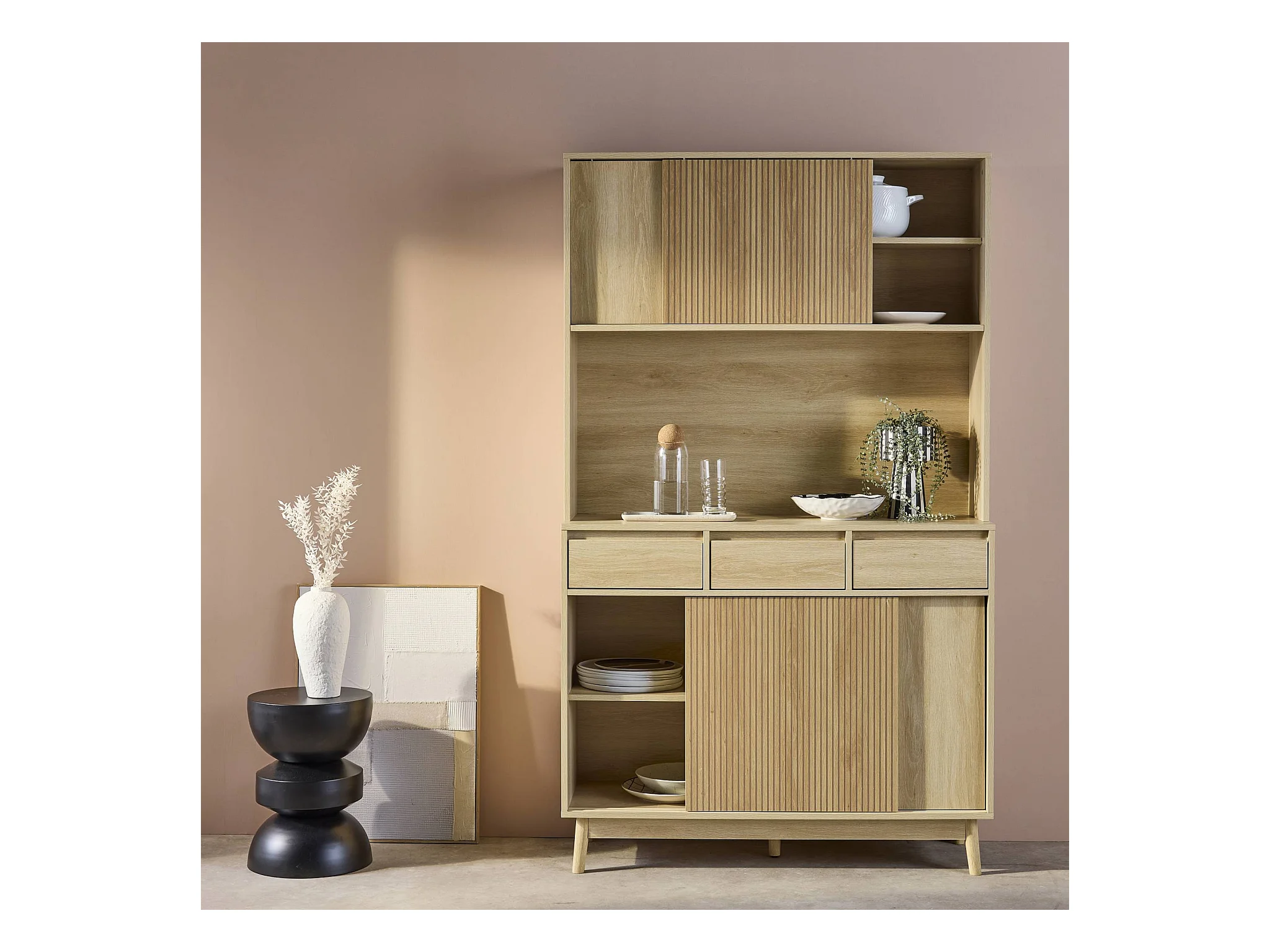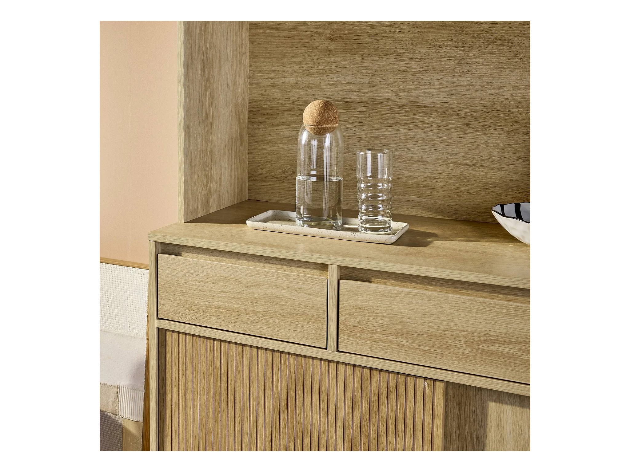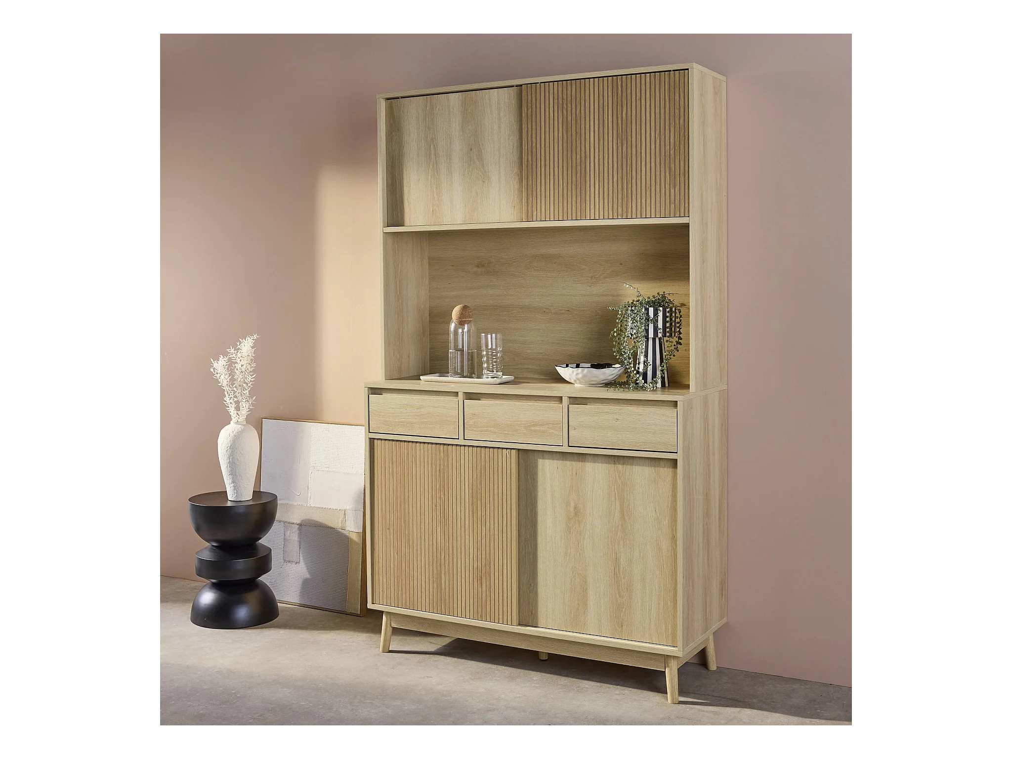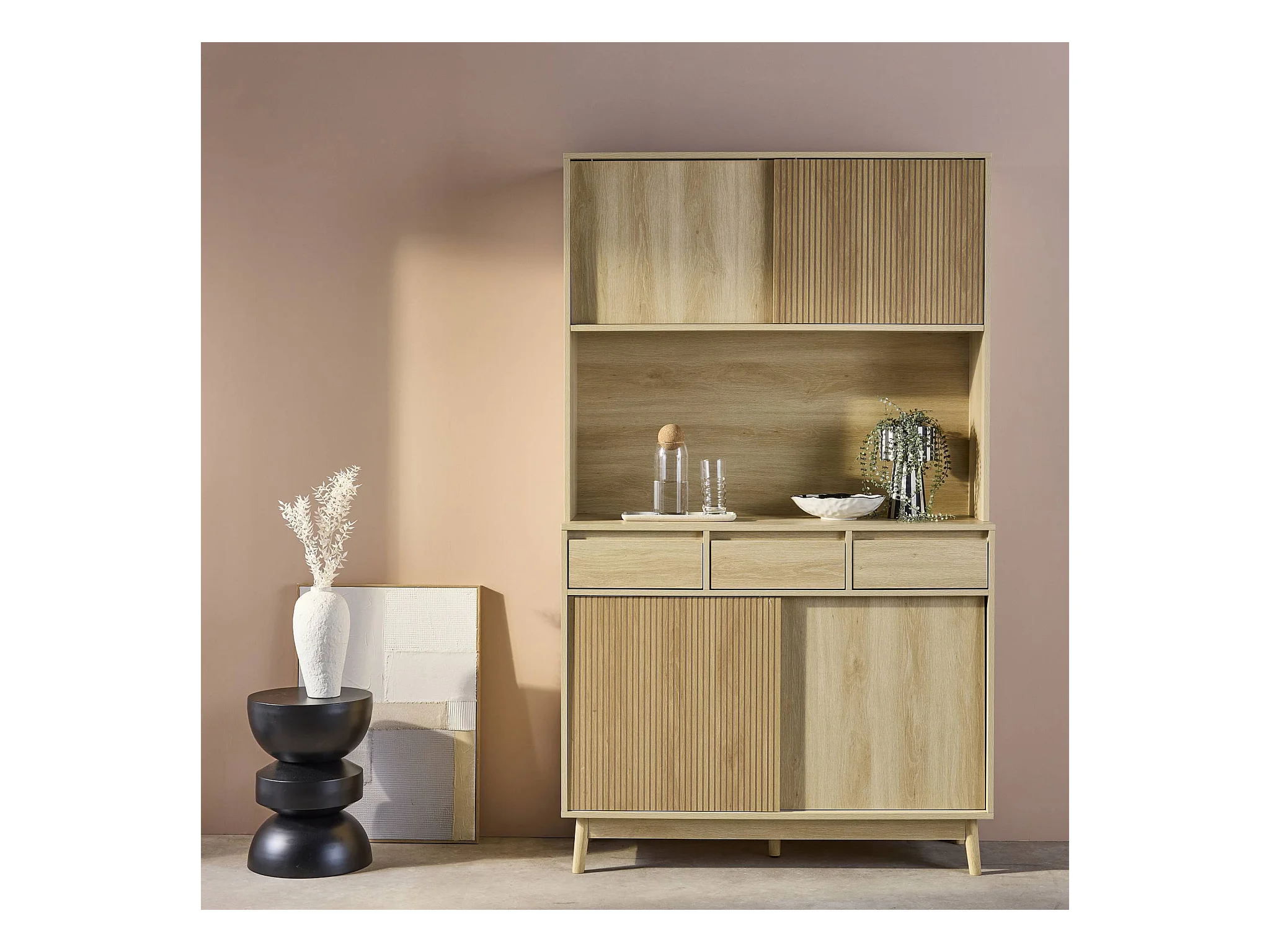 Buffet de cuisine LINEAR décor bois 4 portes 3 tiroirs 110 cm. Naturel. pieds en bois de pain revêtement papier