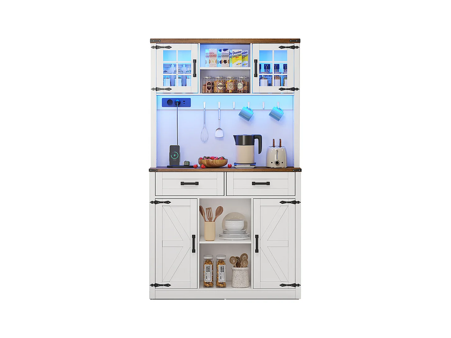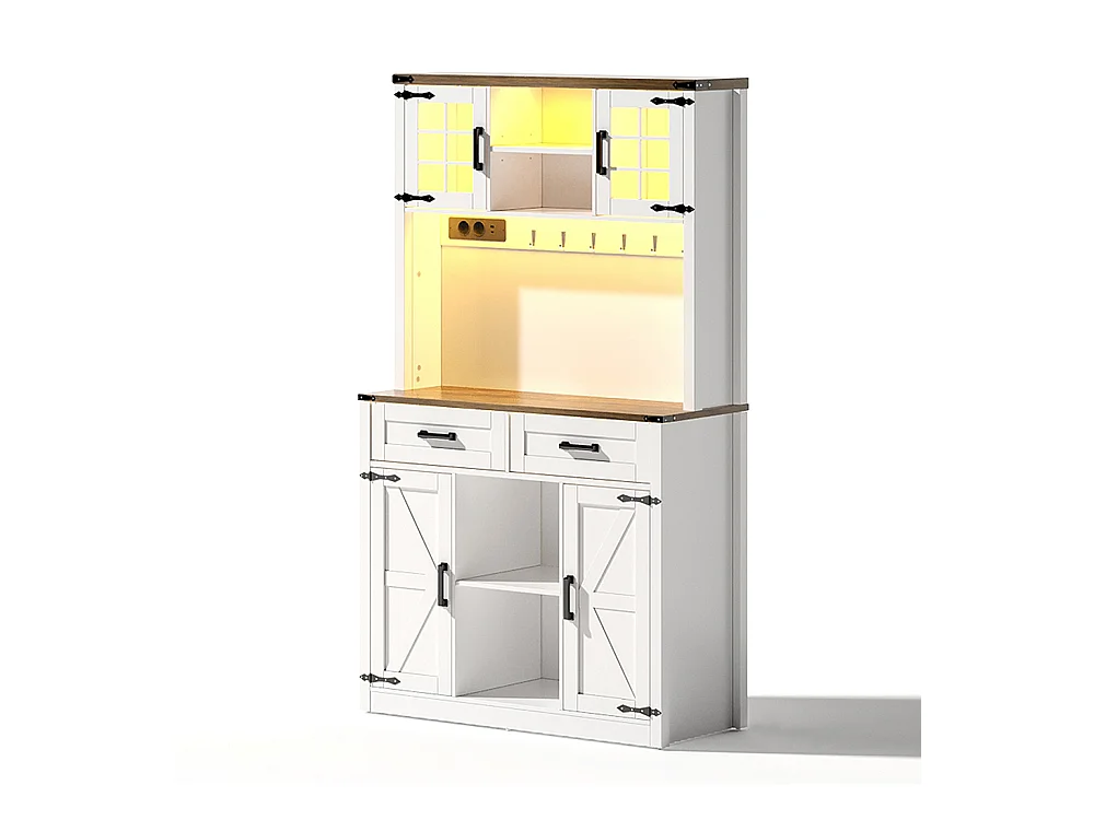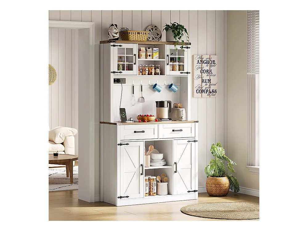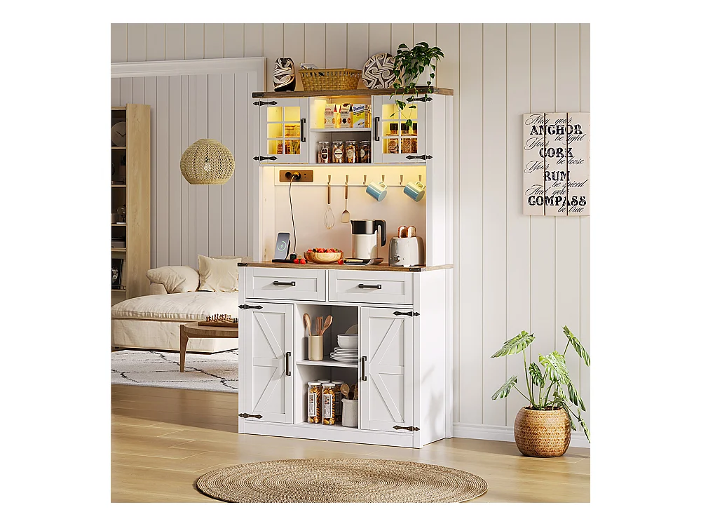 Buffet de cuisine meuble bar avec éclairage LED et prises avec 2 grands tiroirs design porte de grange étagères réglables table d'appoint rustique blanc