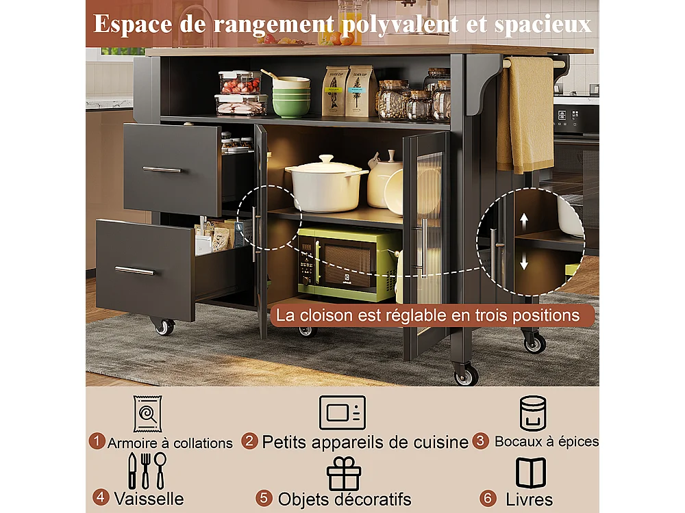 Buffet de cuisine noir avec cloisons amovibles vitrine en bois plan de travail éclairage LED porte-serviettes latéral et roulettes