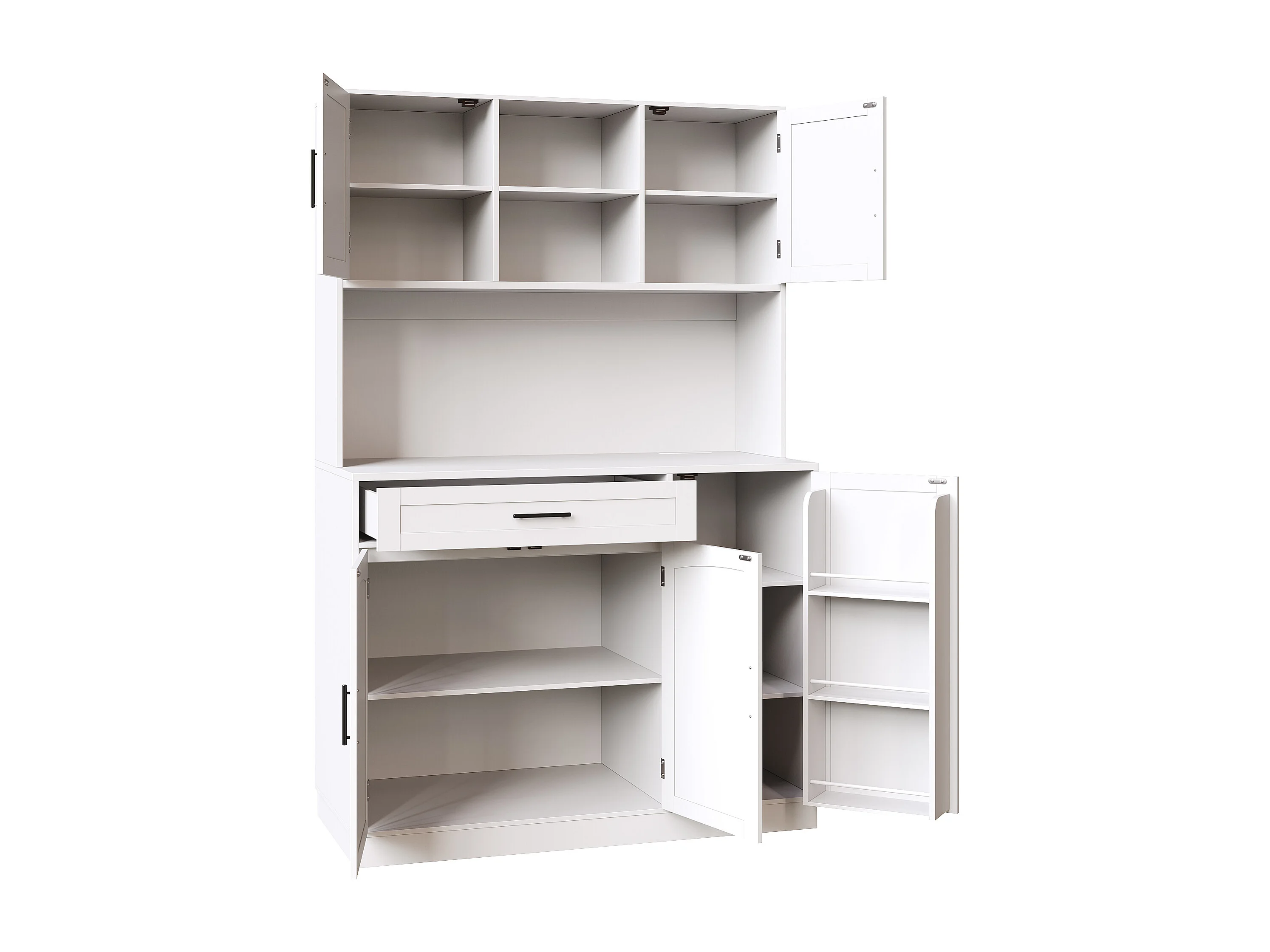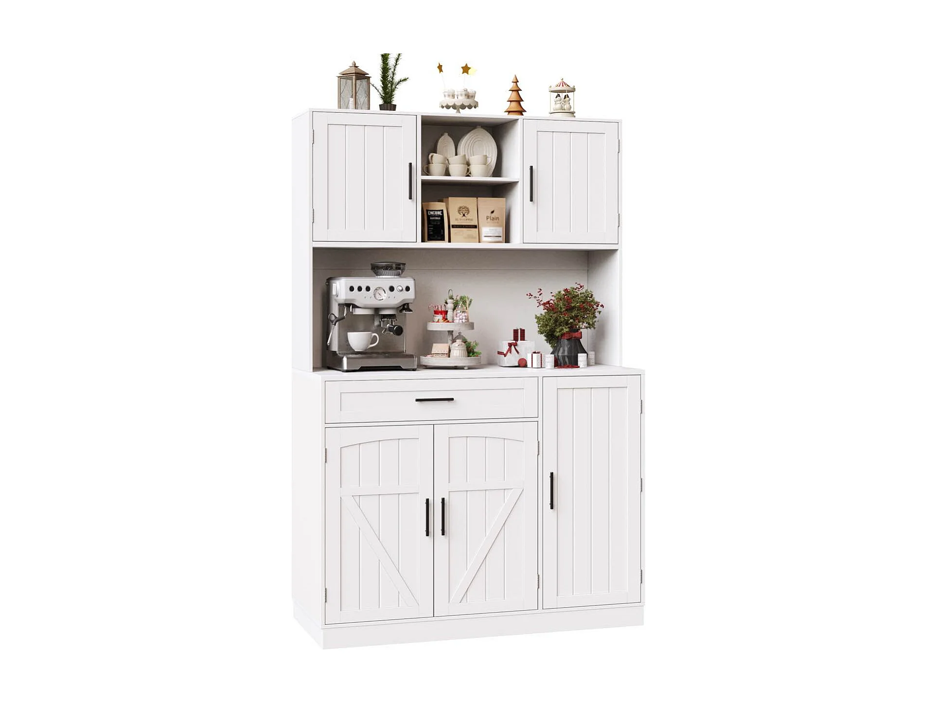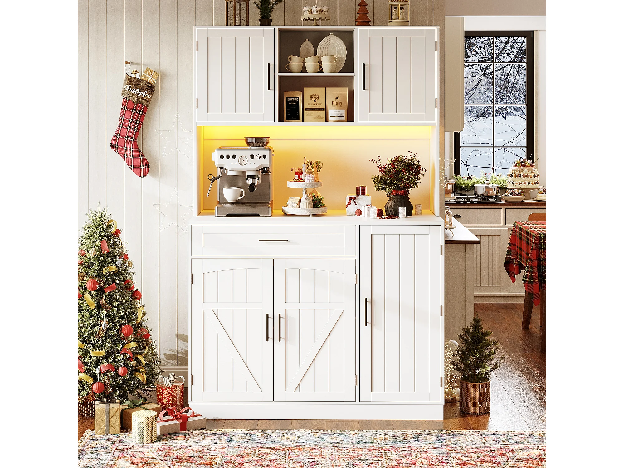 Buffet de cuisine style campagnard - 120 x 38 x 180 cm - avec Leds + prise + 5 portes + 1 tiroir - blanc