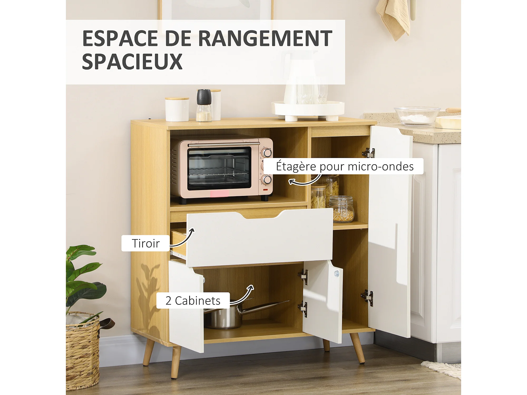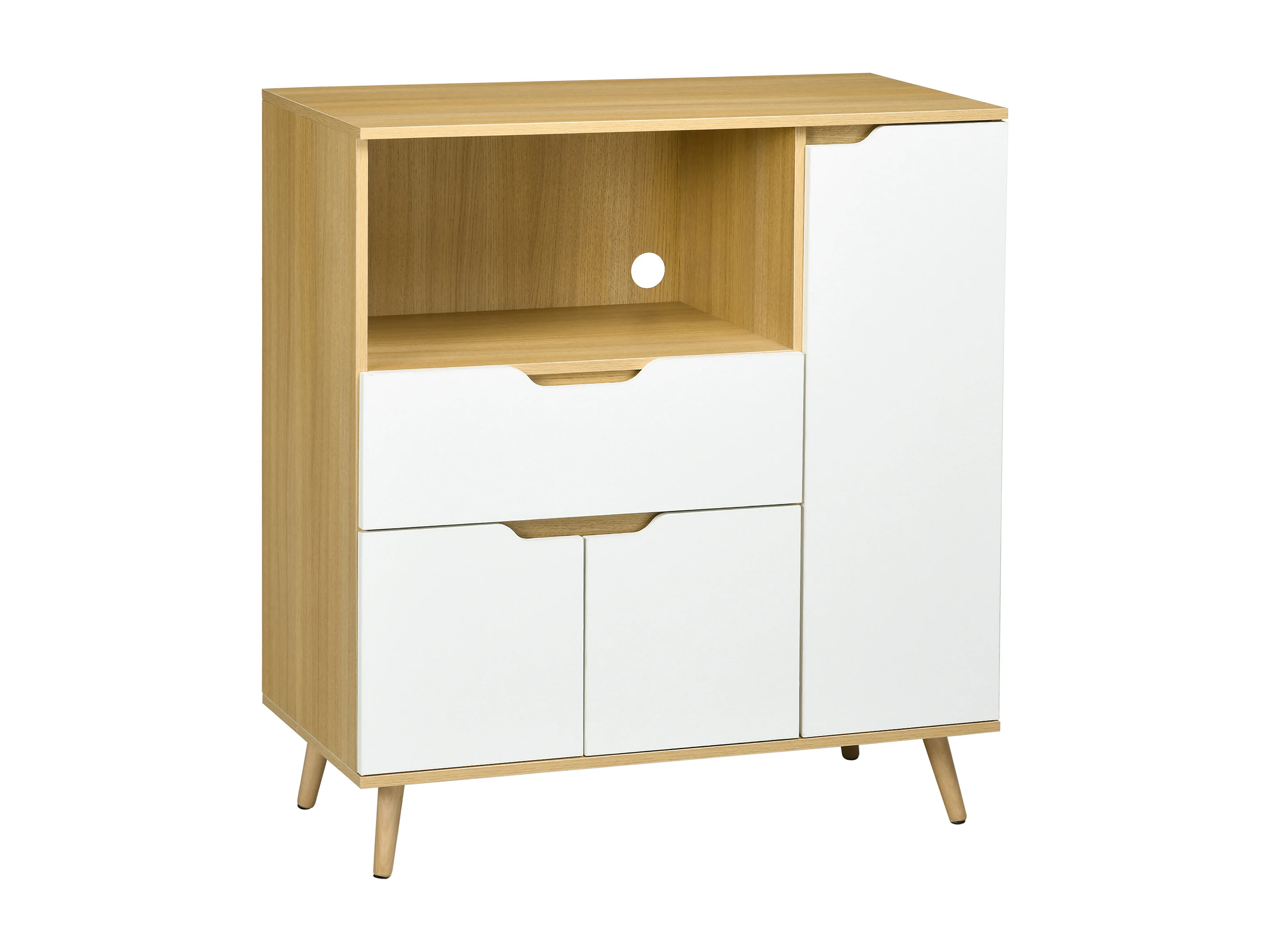 Buffet de cuisine style scandinave - meuble micro-ondes - 3 portes, étagère, niche, tiroir coulissant - dim. 90 x 40 x 98 cm - effet bois naturel blanc