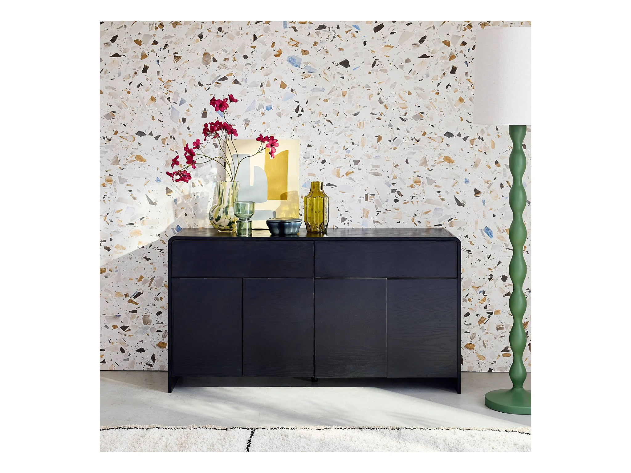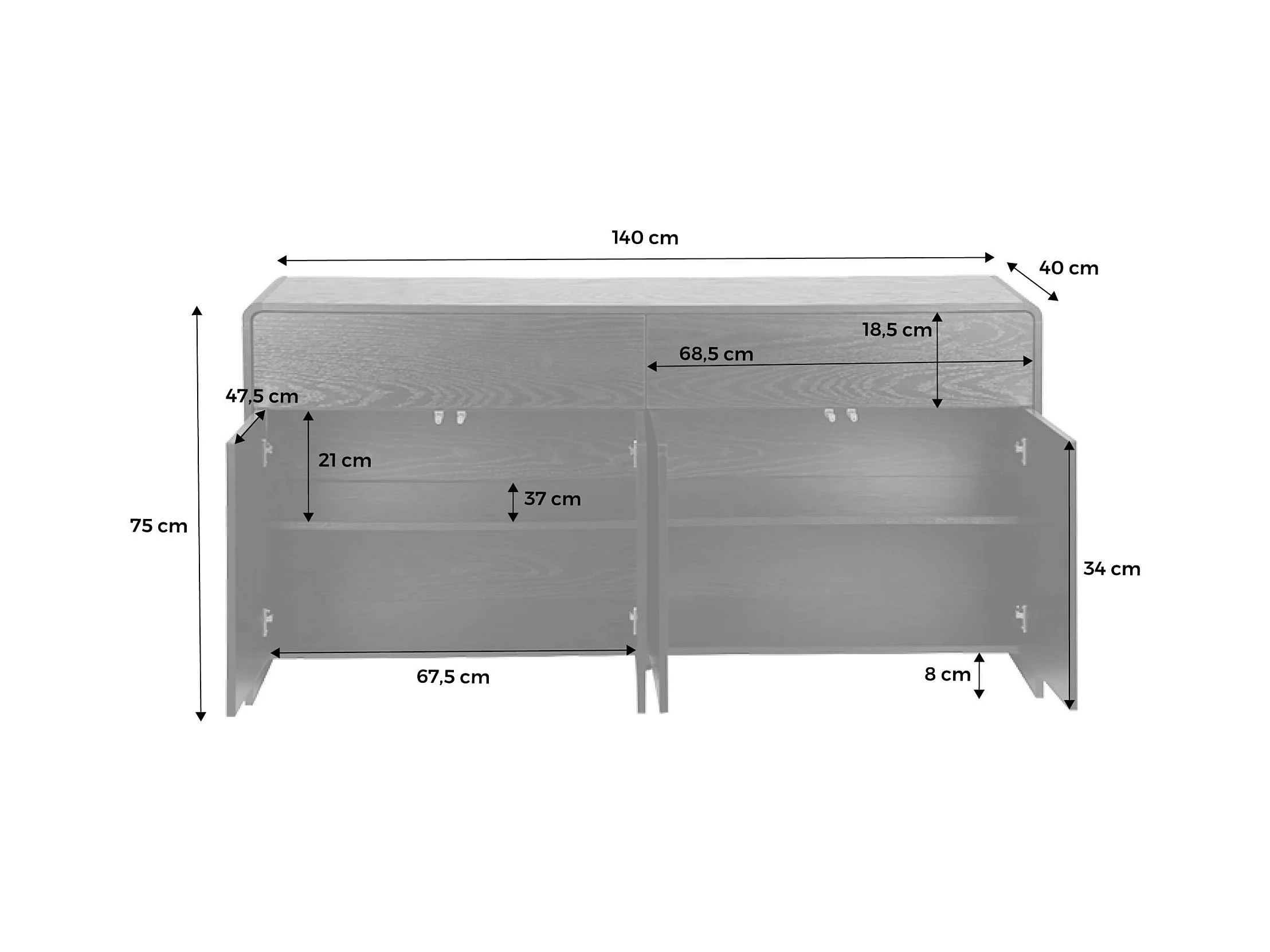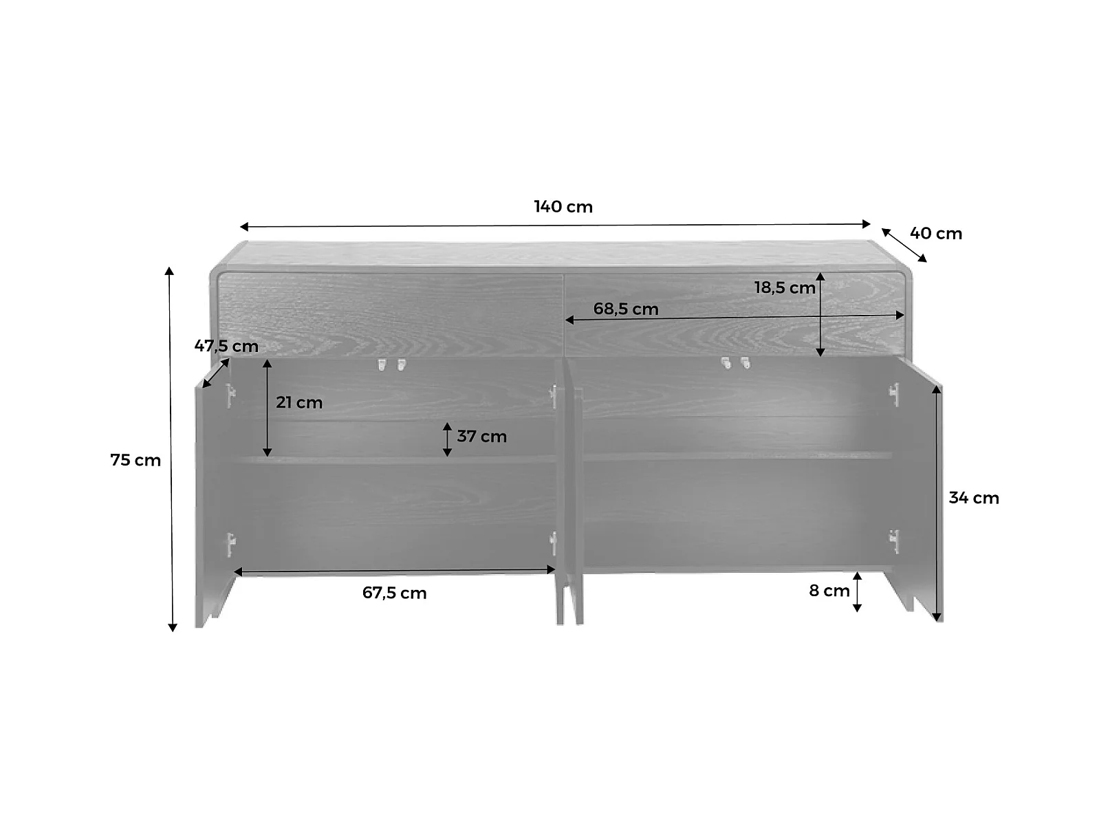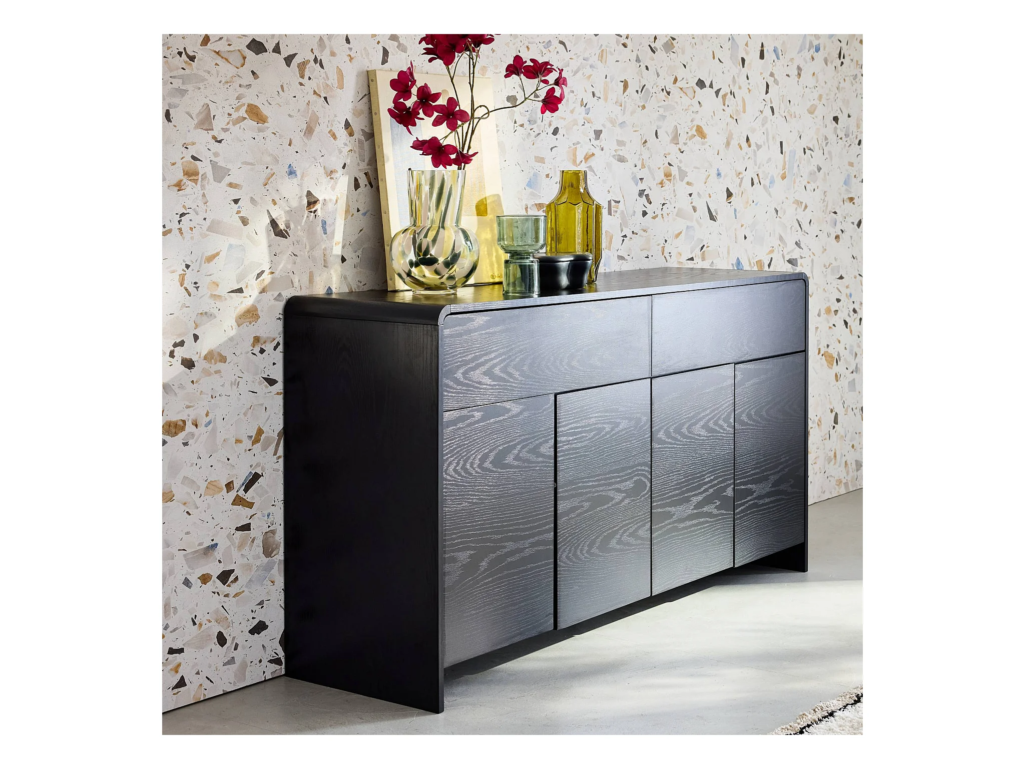 Buffet de rangement. buffet bas. 2 tiroirs 4 portes effet bois noir arrondi