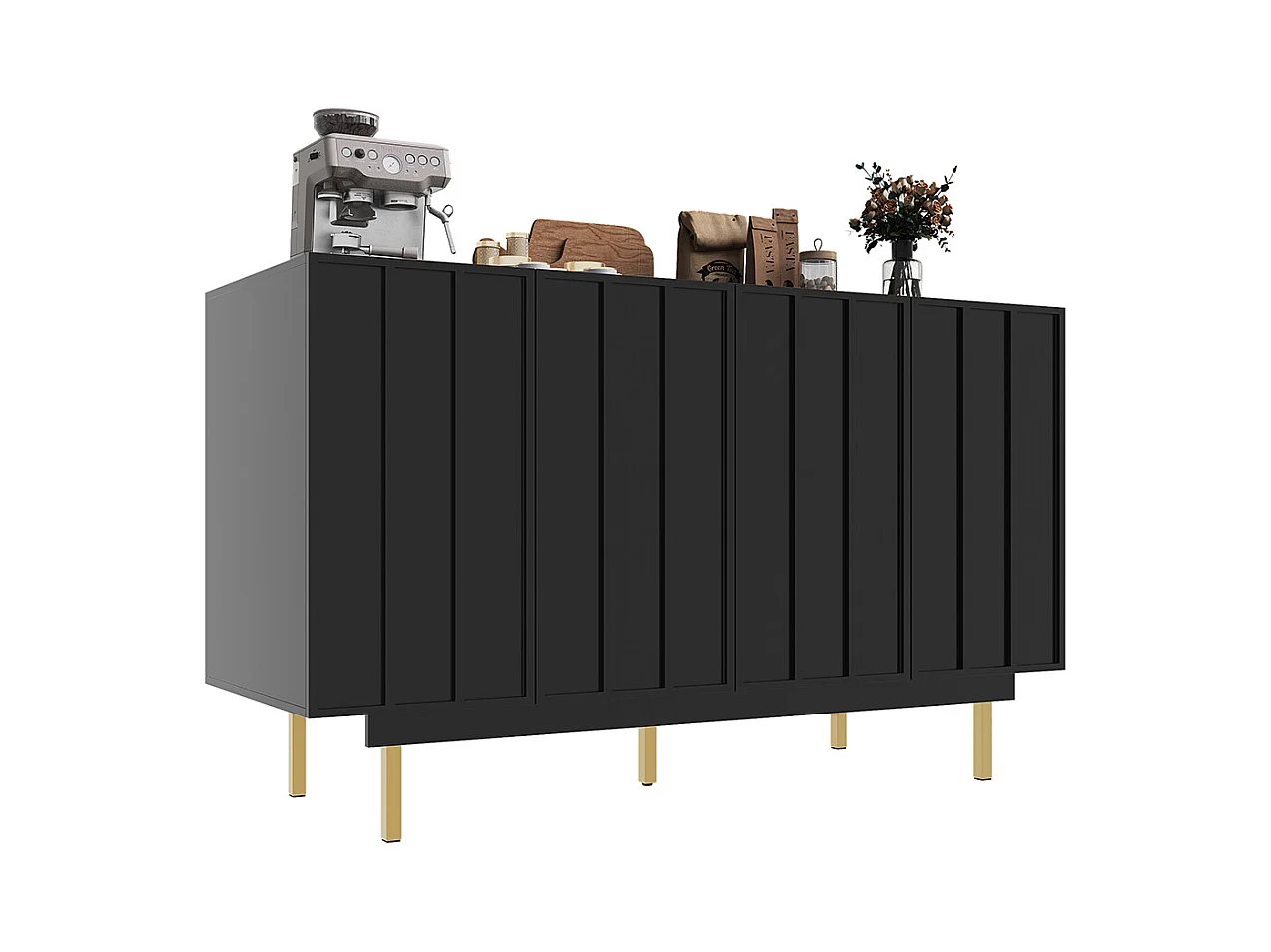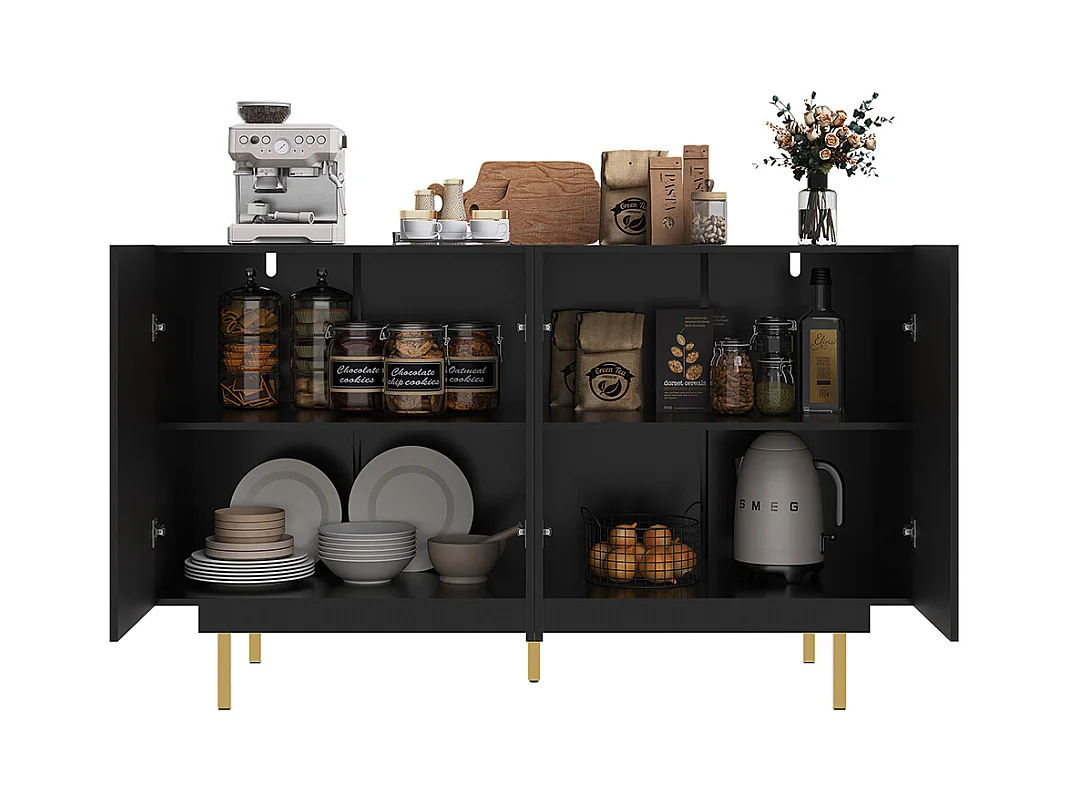 Buffet noir commode 4 portes salon poignées dorées brossées pieds brillants