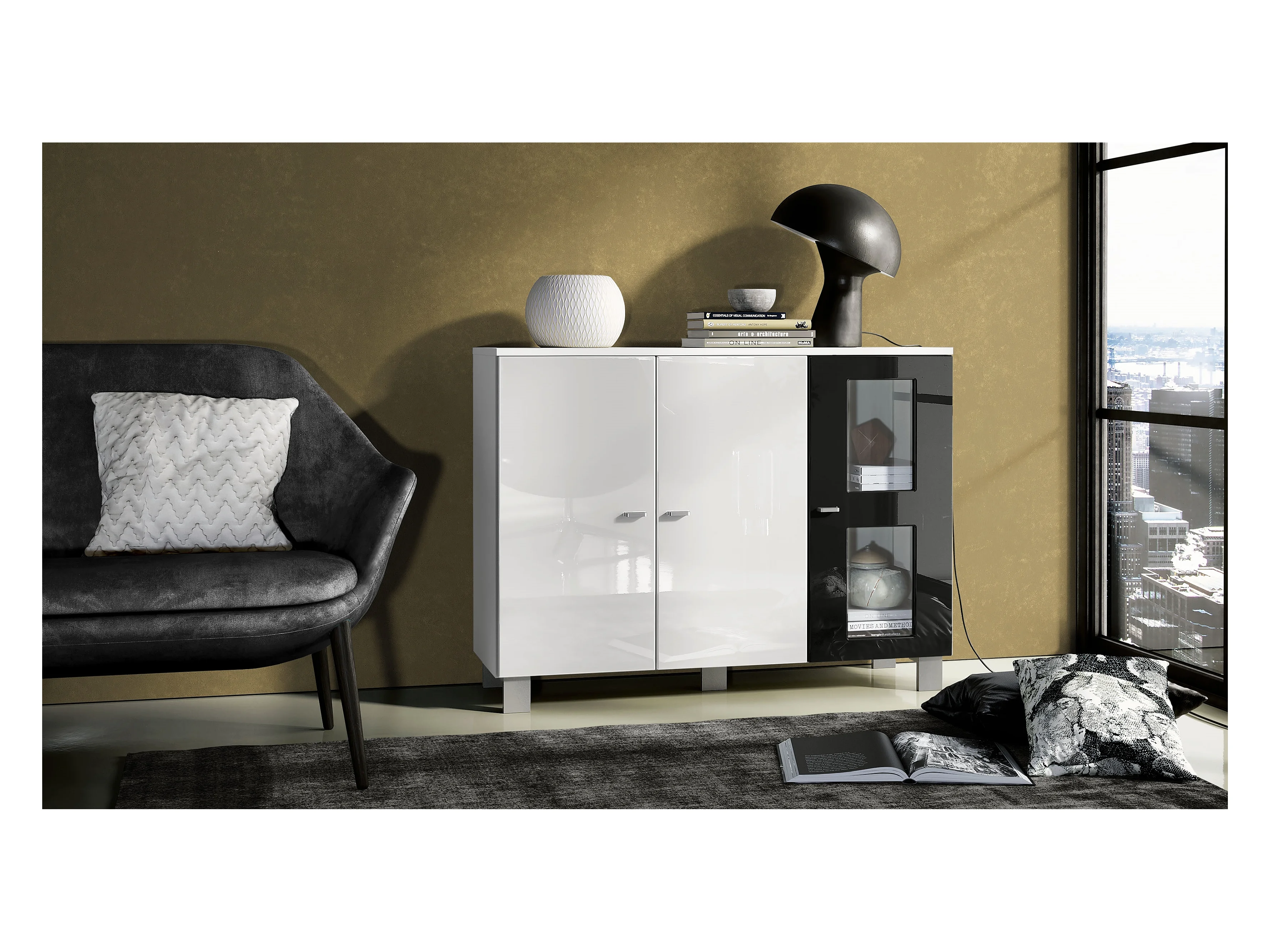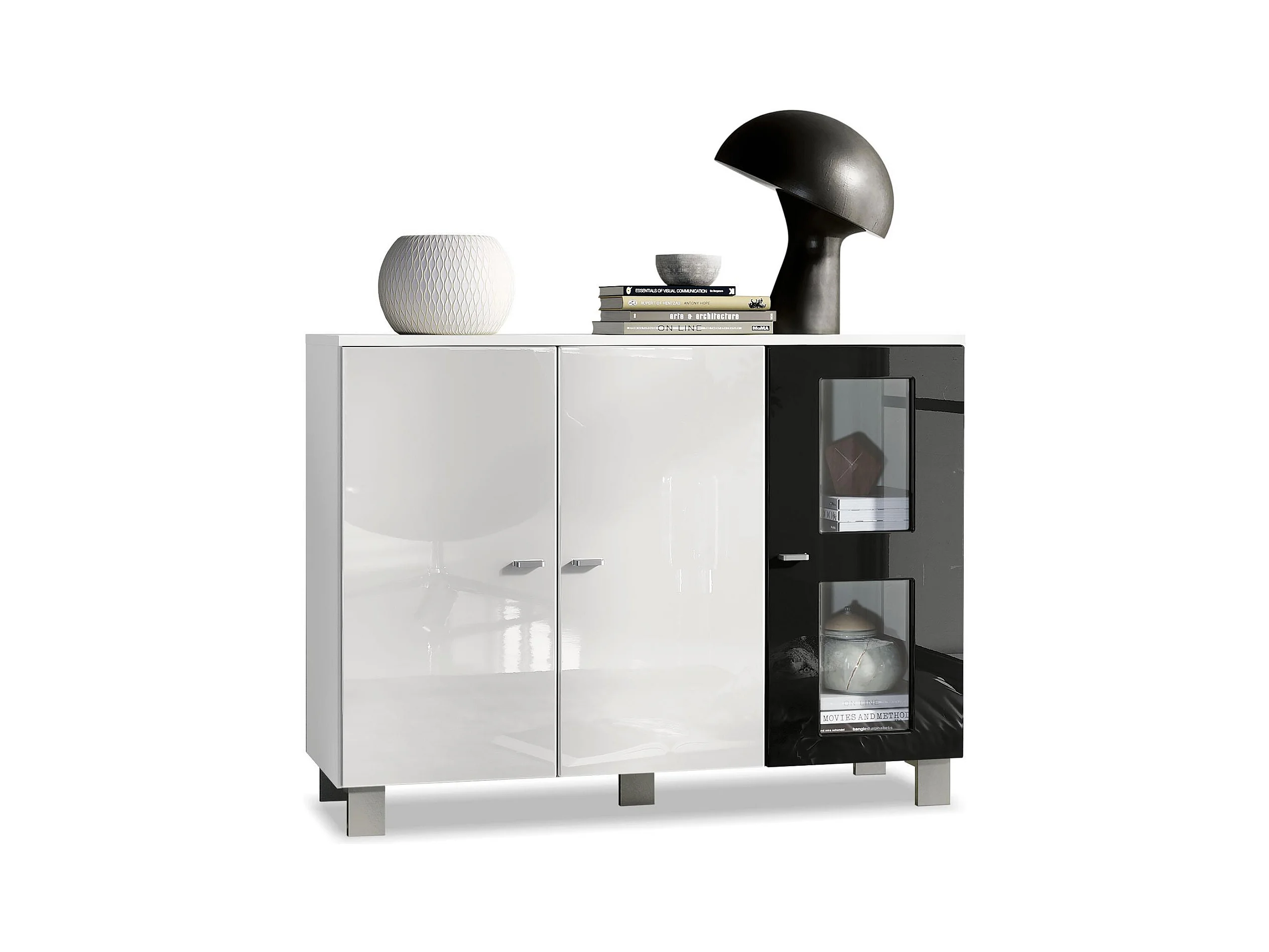Buffet Denjo, Commode avec 3 portes, Blanc mat/Blanc haute brillance/Noir haute brillance (107 x 81 x 35 cm)