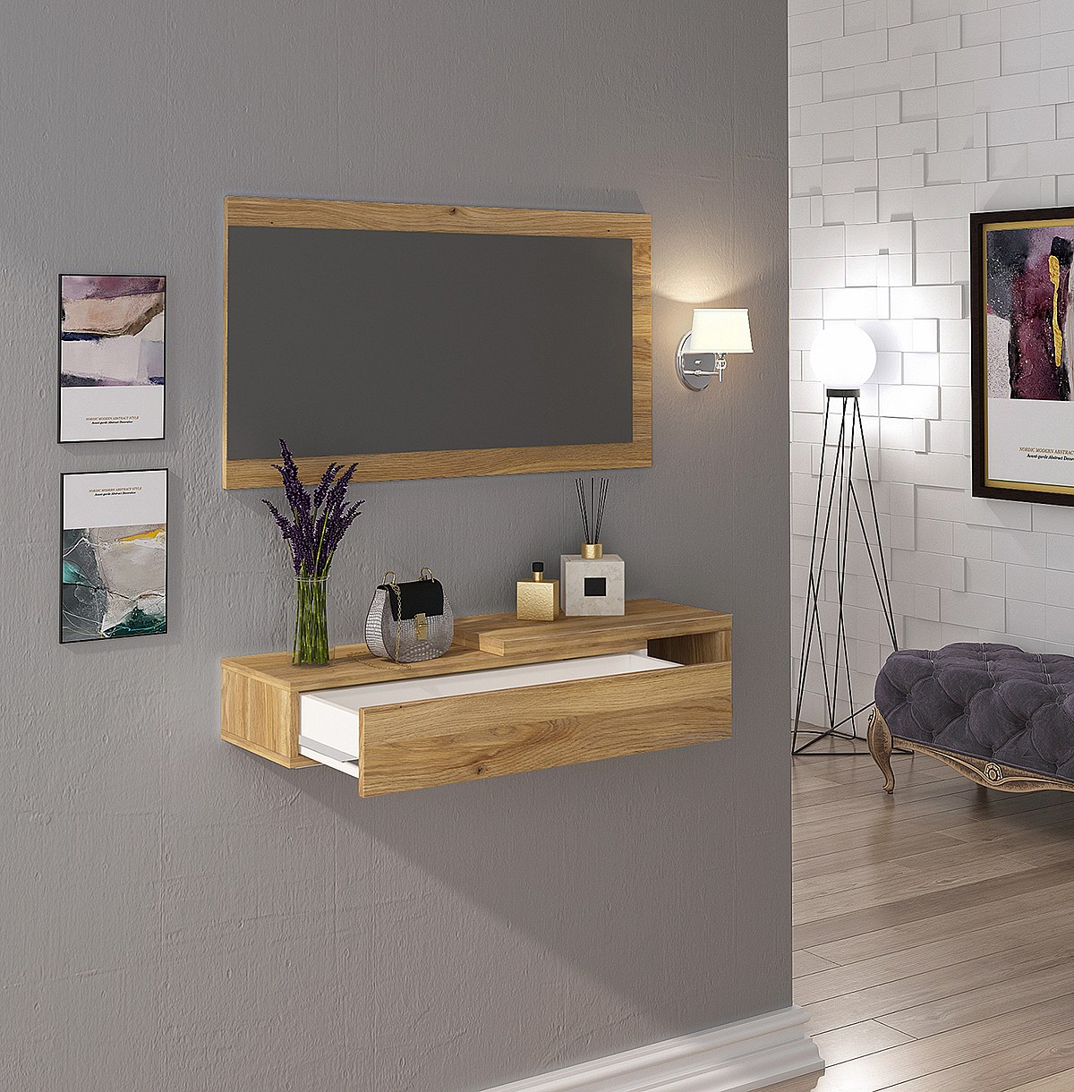 Buffet d'entrée, meuble d'entrée coloris chêne Mauvella + miroir - longueur 91,50 x profondeur 26 x hauteur 65,2 cm