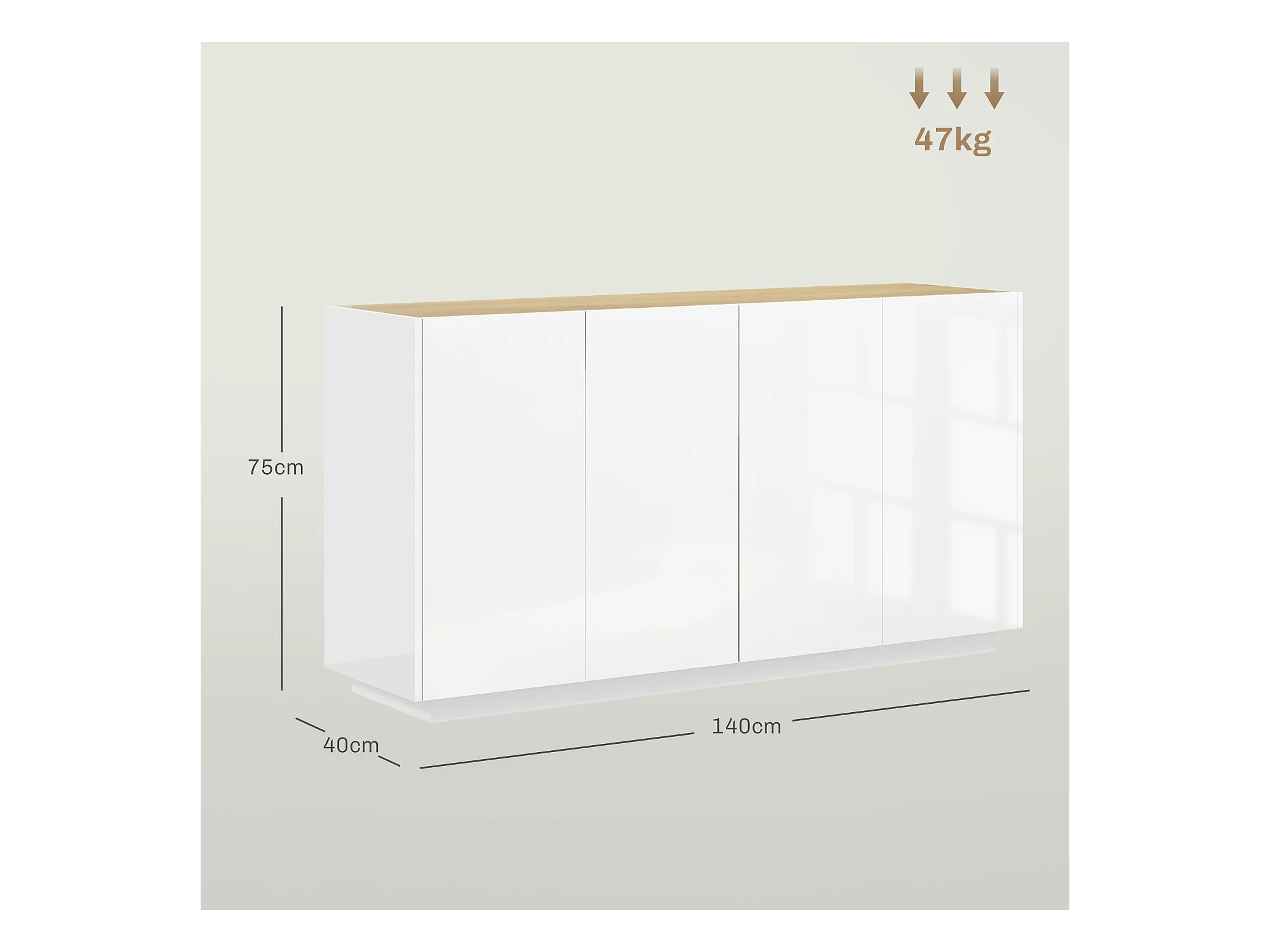 Buffet design contemporain blanc laqué plateau aspect bois clair - dim. 140L x 40l x 75H cm - 4 portes, 2 étagères