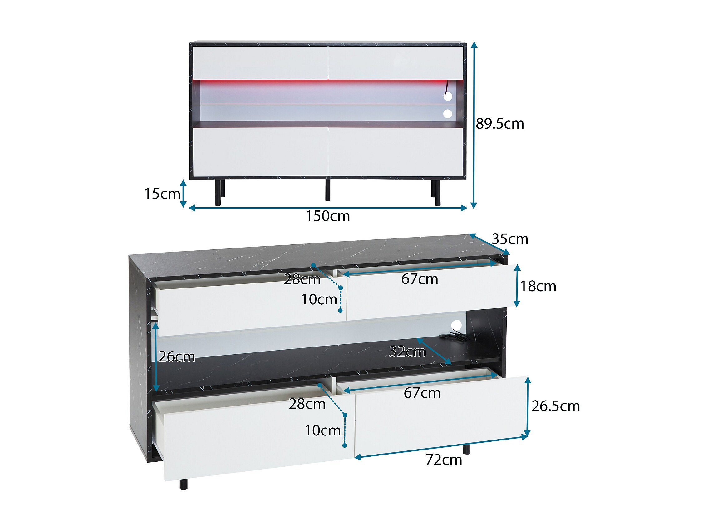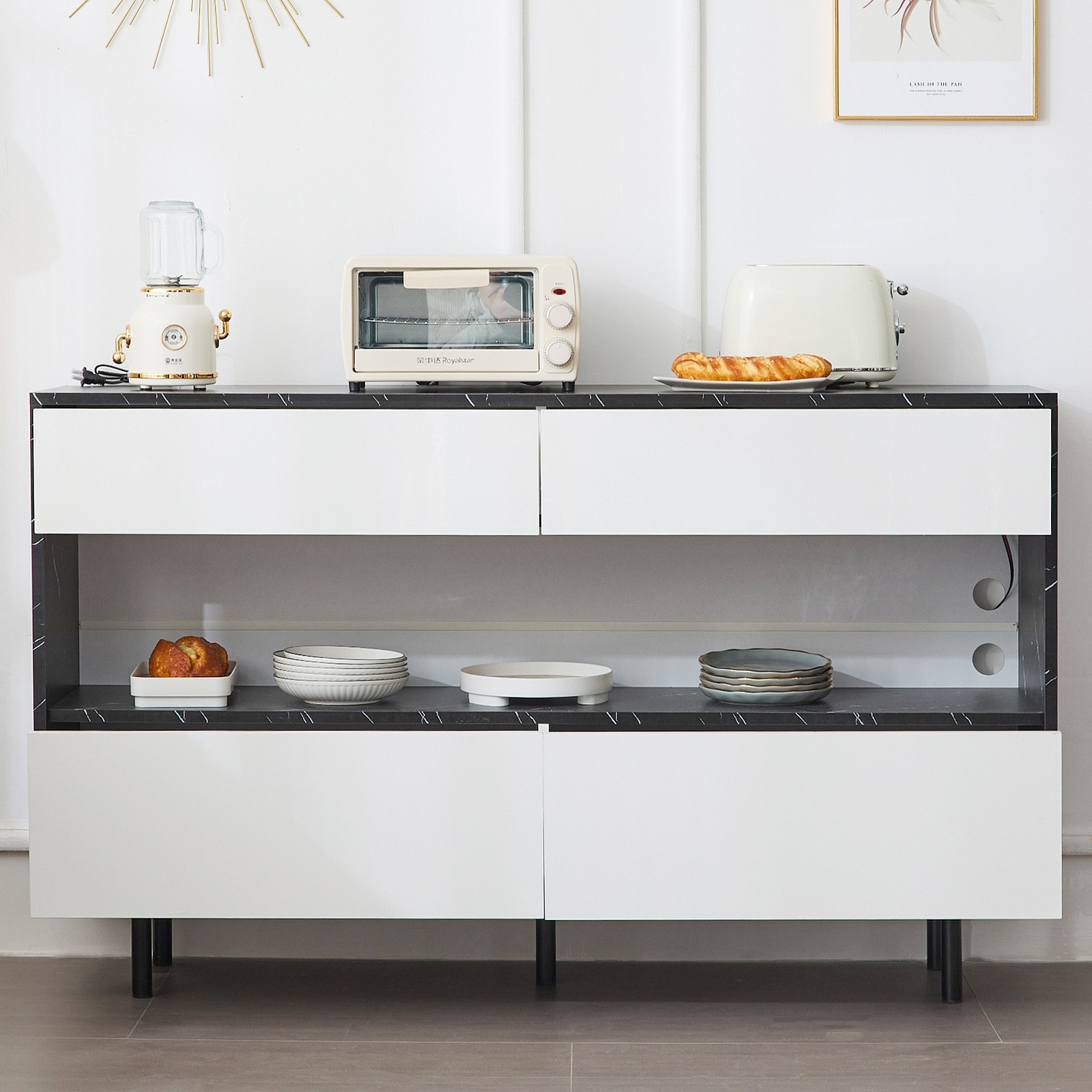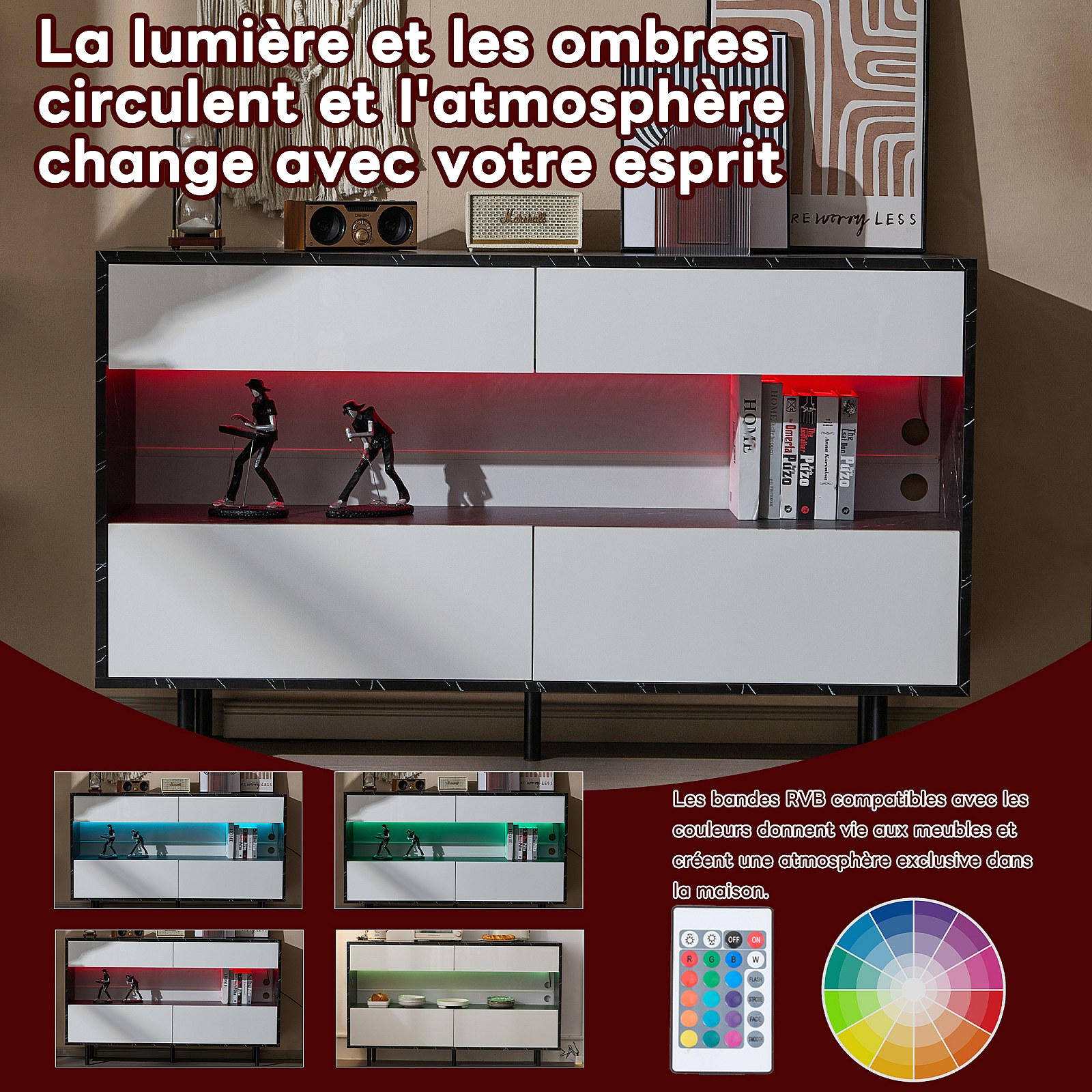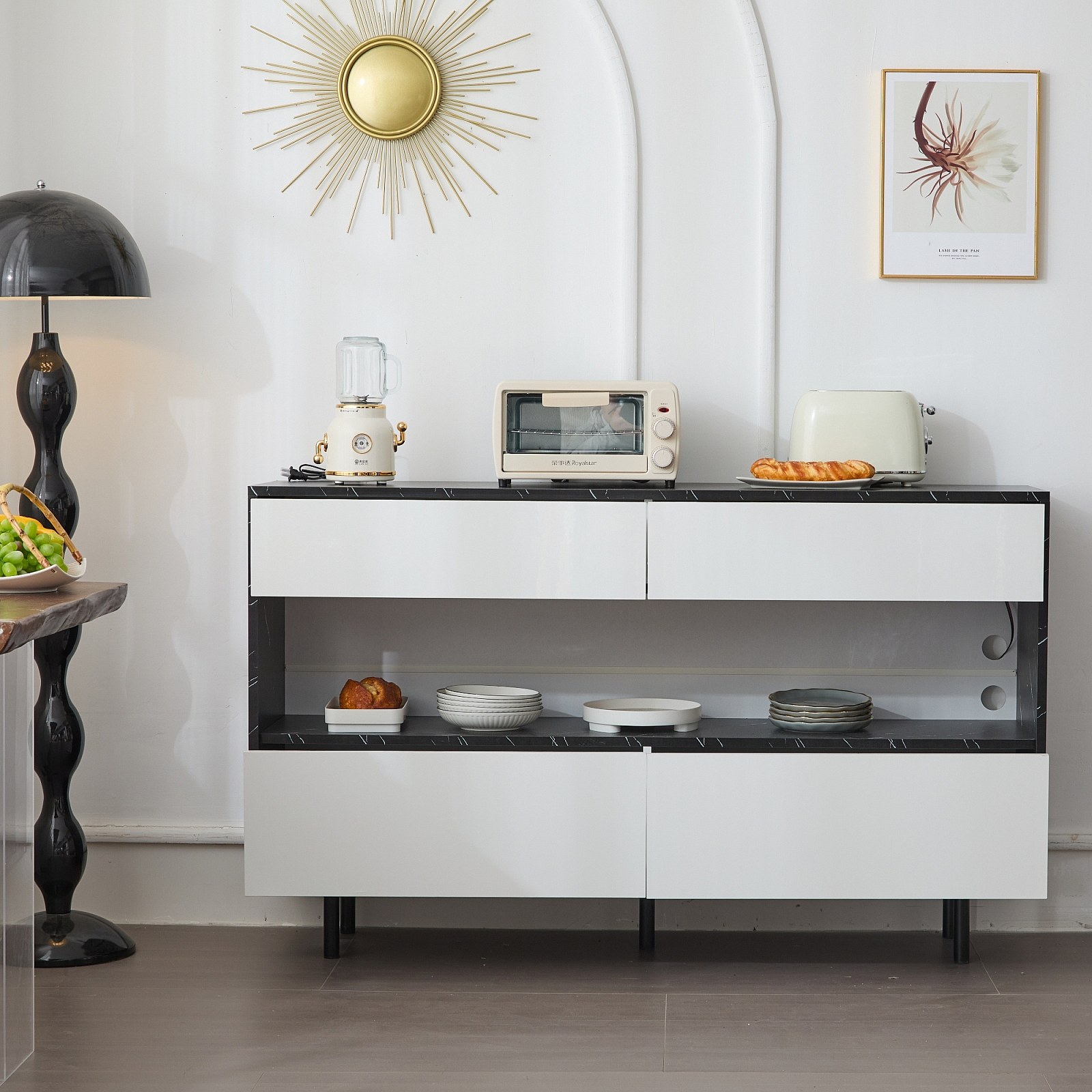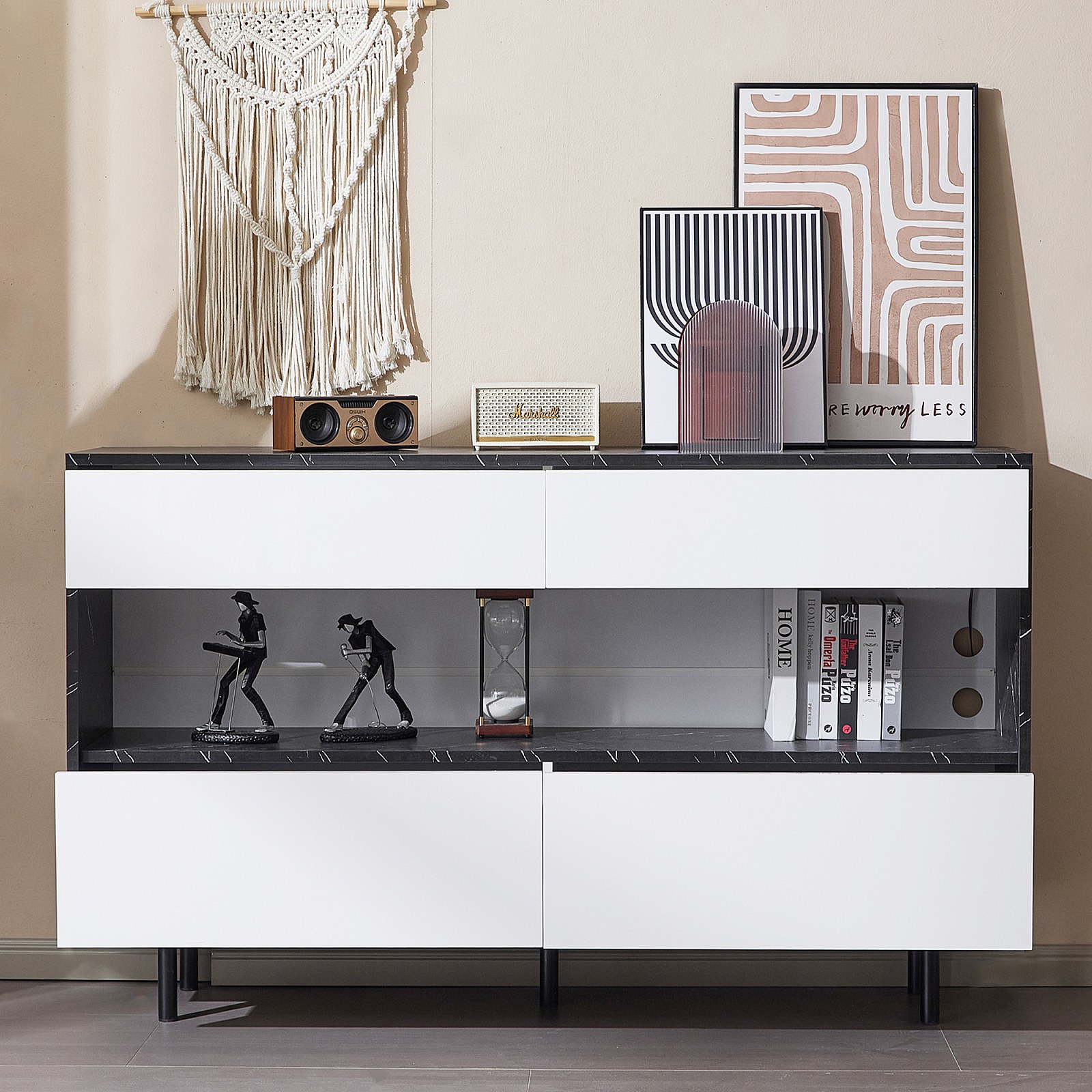 Buffet design marbre noir, espace ouvert, 4 tiroirs, éclairage LED, structure métallique stable, anti-basculement, idéal cuisine et salon