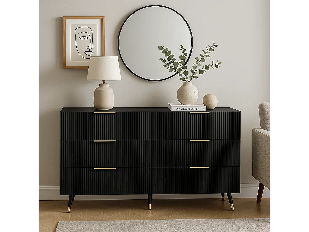 URBAN MEUBLE Buffet élégant noir design moderne, 6 tiroirs poignets et point de pieds dorés 120*40*77cm COQREOD BLACK