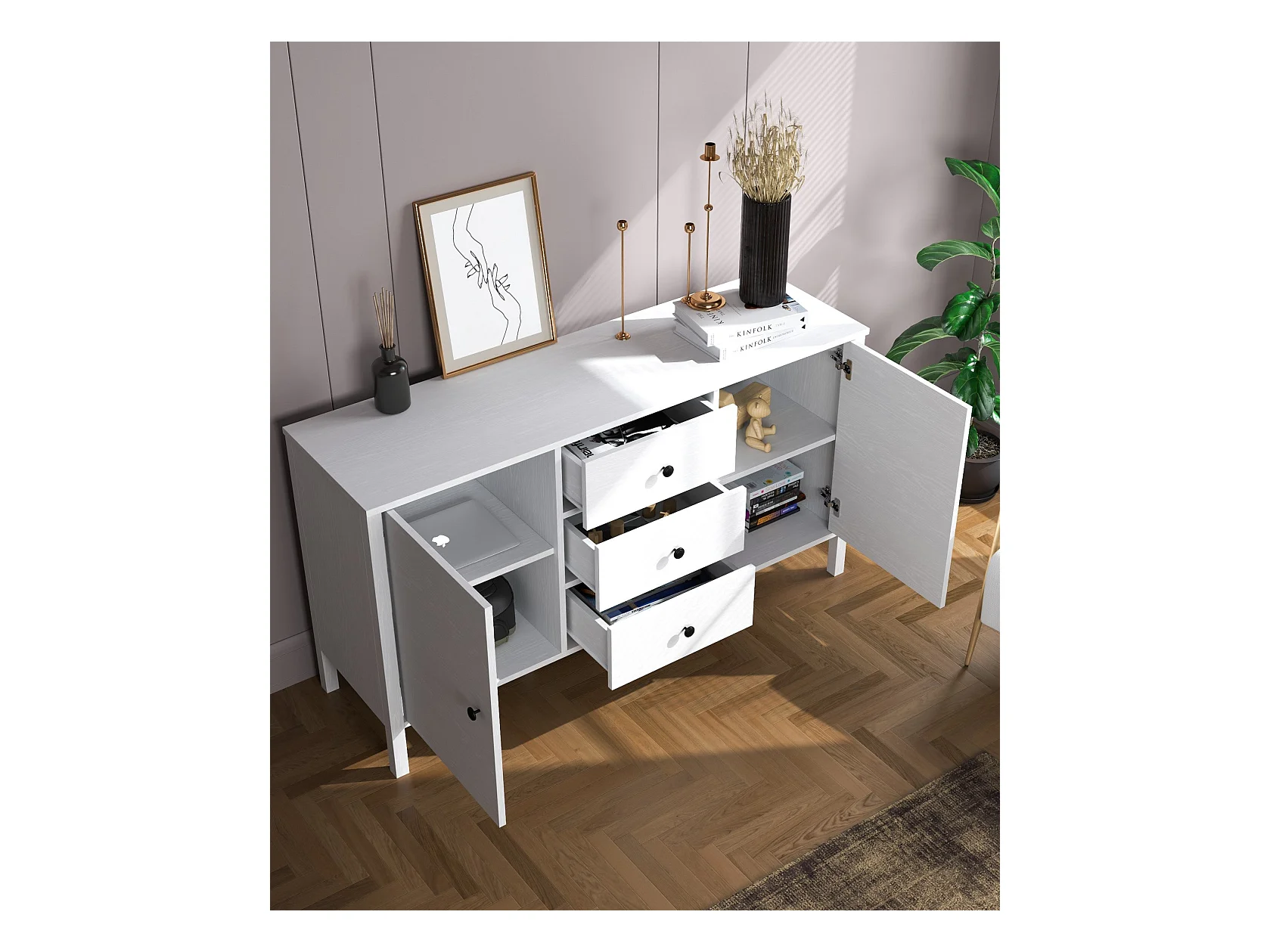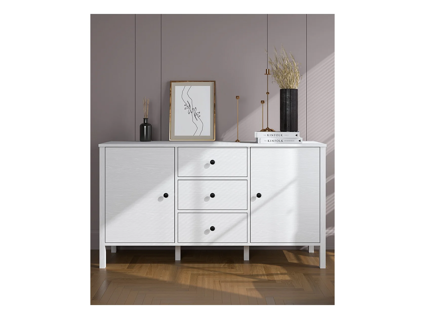 Buffet en bois – 150 cm de large, 82 cm de haut, 44 cm de profondeur – Blanc – Panneau de particules mélaminé