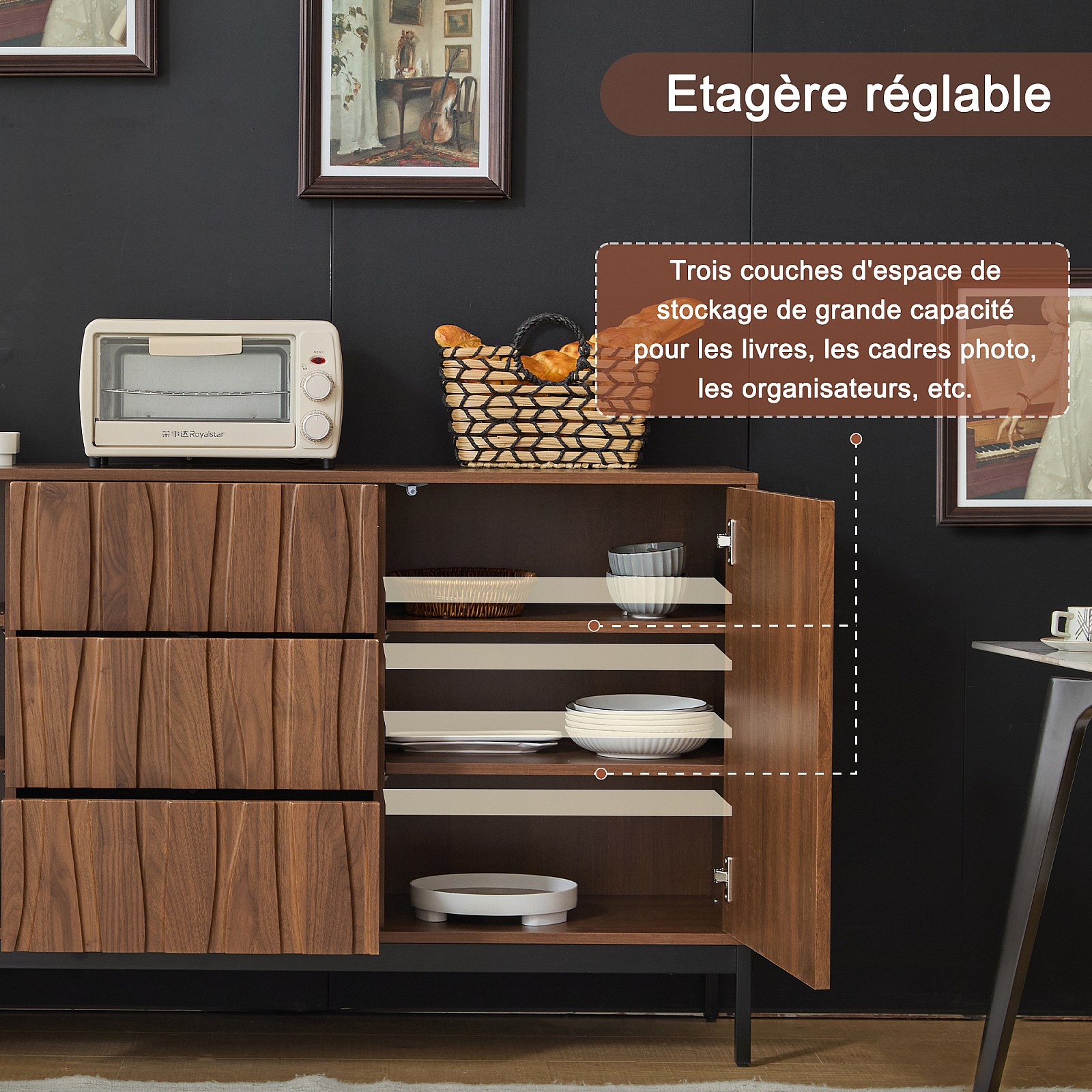 Buffet en chêne foncé 150 cm, 3 tiroirs, grand espace de rangement, style Mid Century Modern, idéal cuisine, salon, hall et couloir