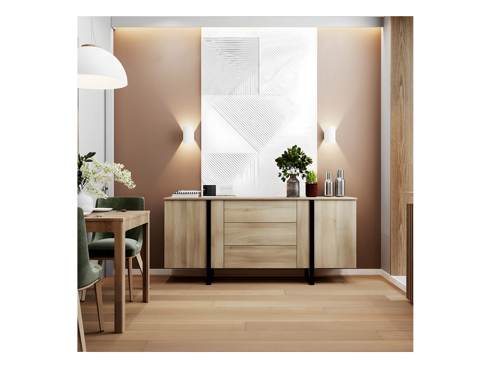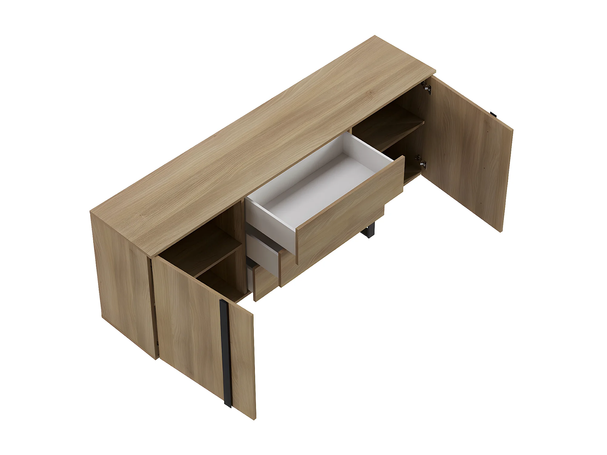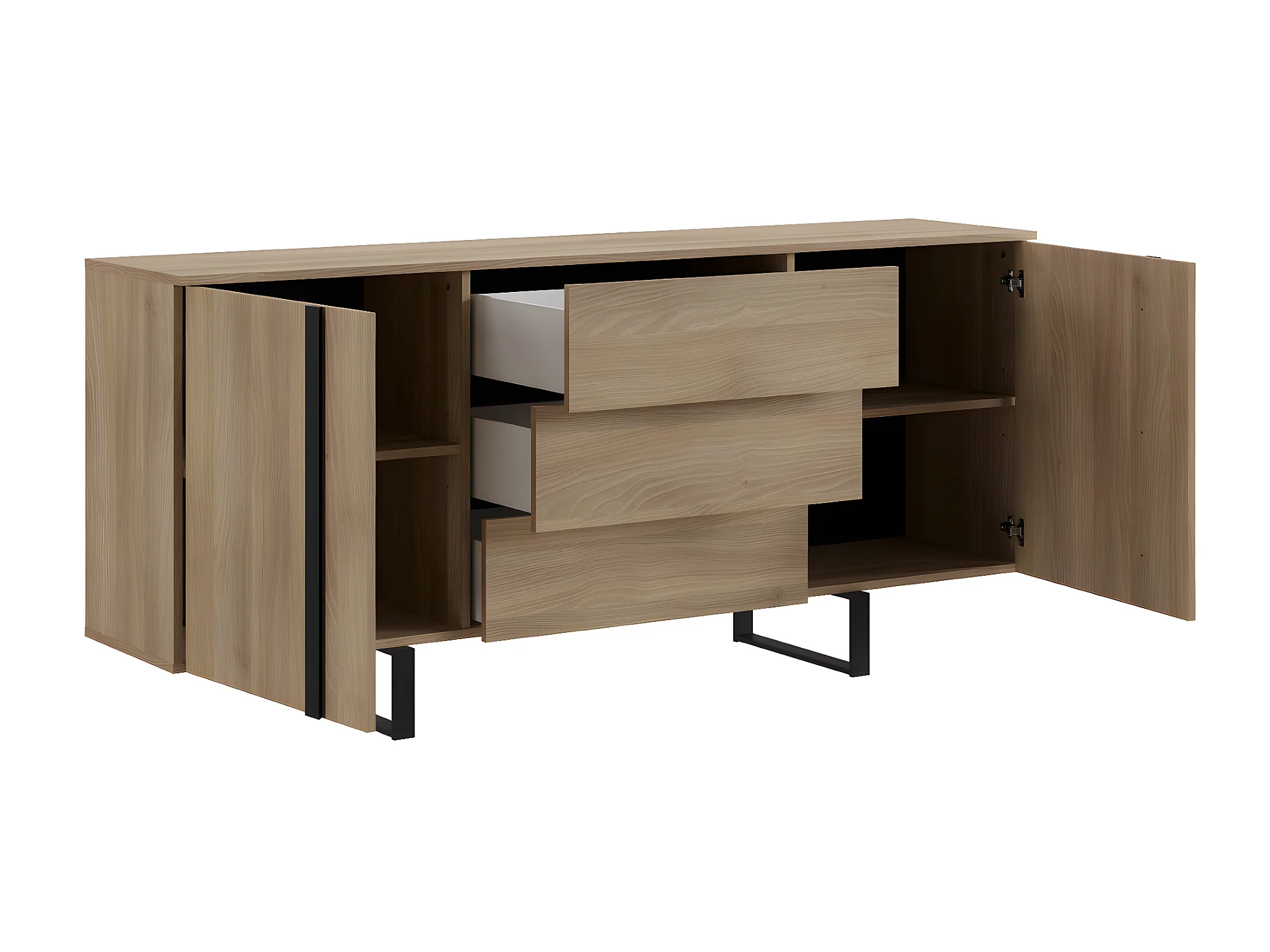Buffet en mélamine et métal coloris chêne / noir - Longueur 180 x profondeur 40 x hauteur 82 cm