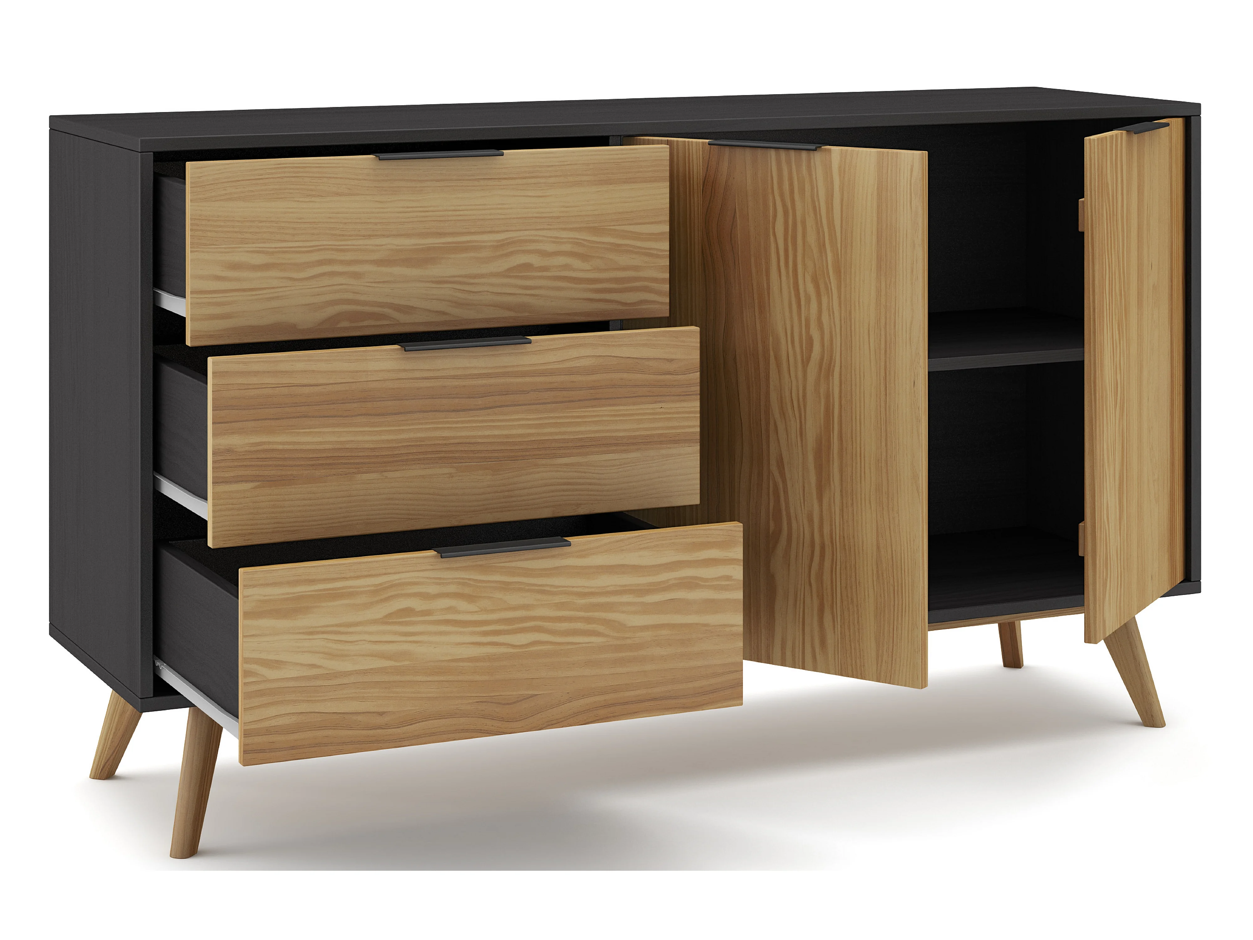 Buffet en pin massif décor ciré naturel et noir, meuble de rangement - Longueur 140 x Profondeur 40 x Hauteur 80 cm