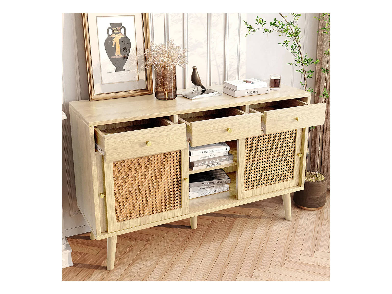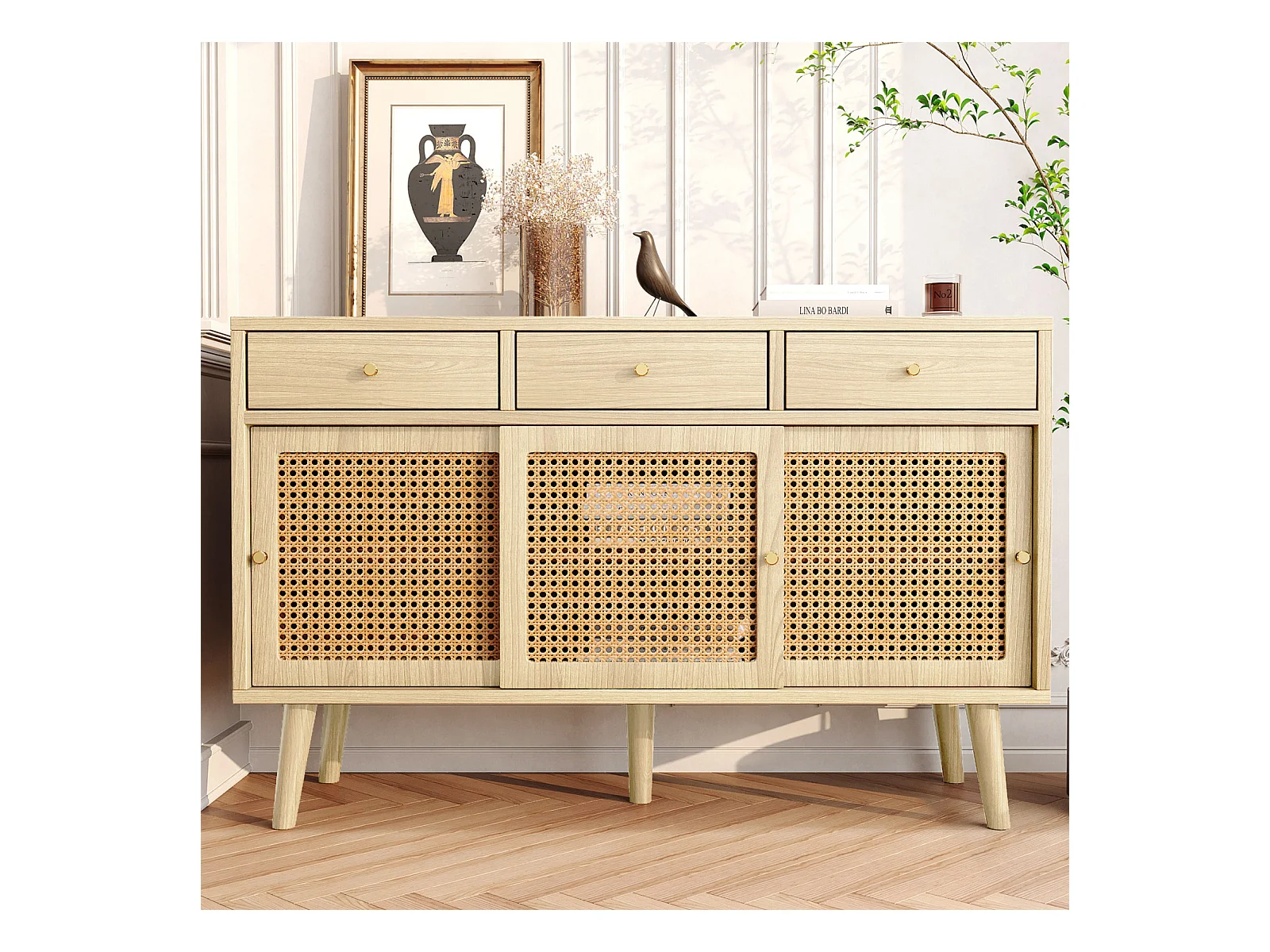 Buffet en rotin 120x40x78cm, avec 3 tiroirs et 3 portes coulissantes, pieds en bois massif, poignée en métal doré, étagères réglables