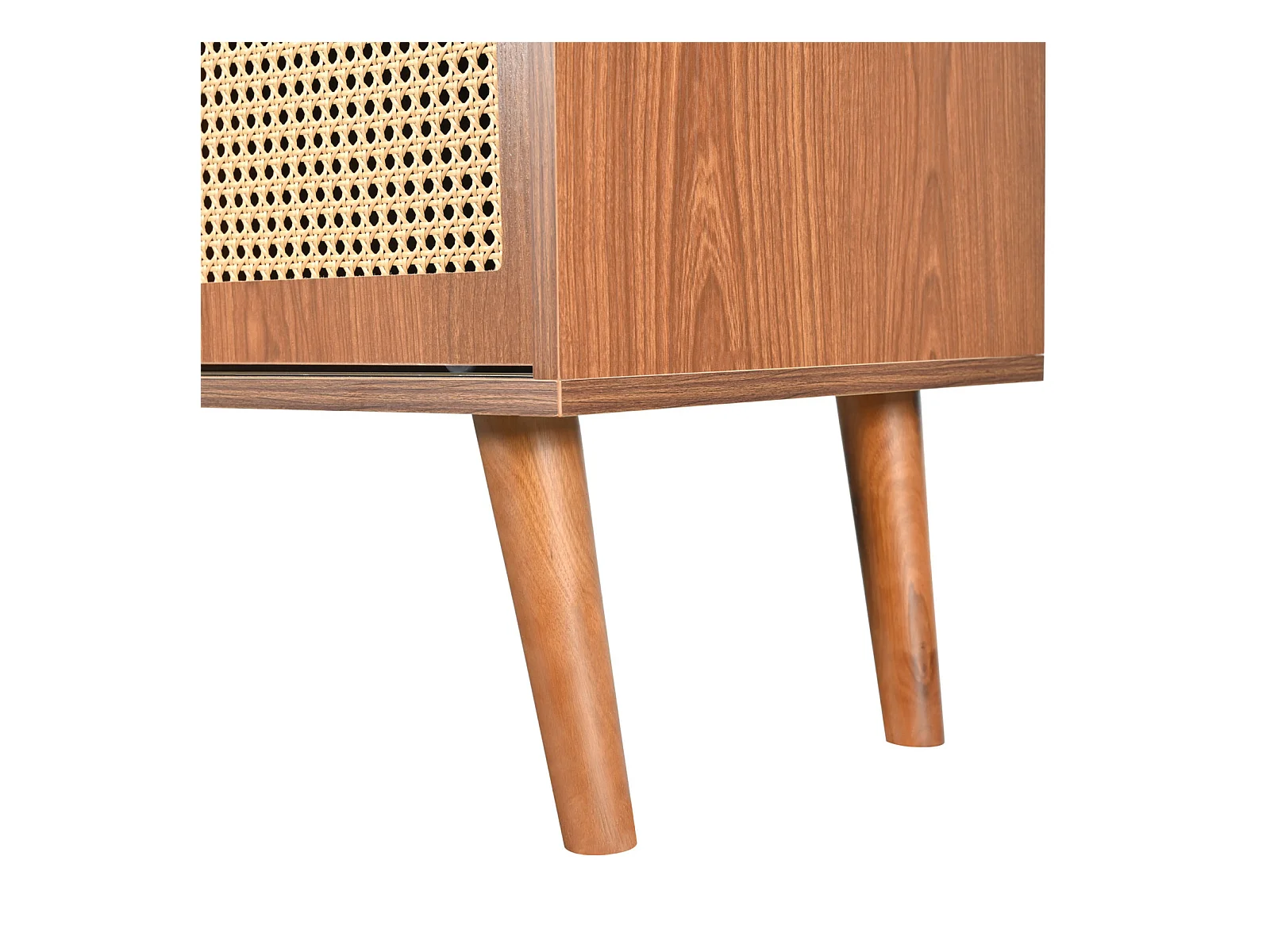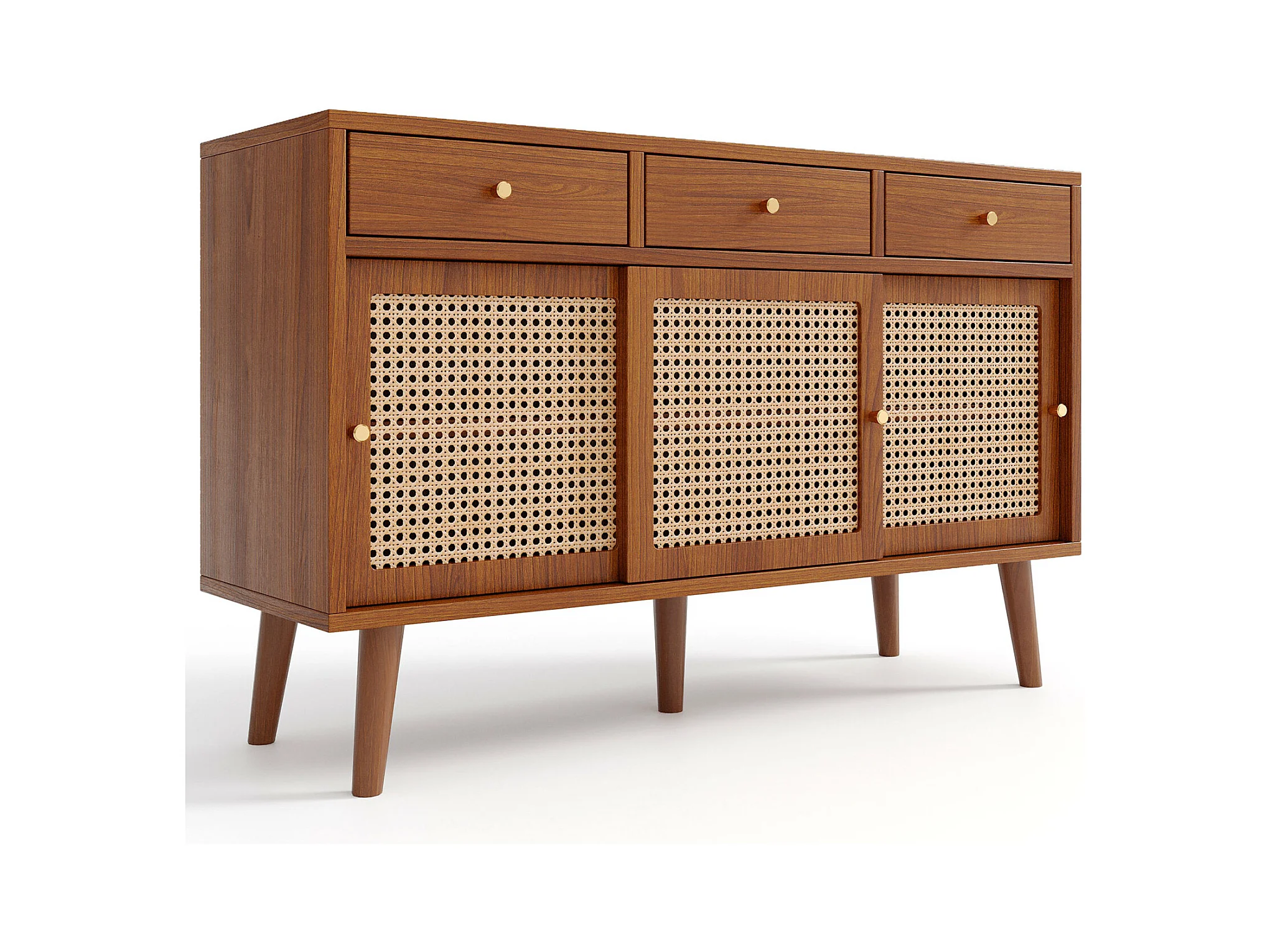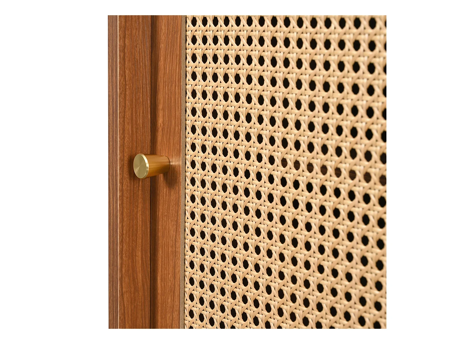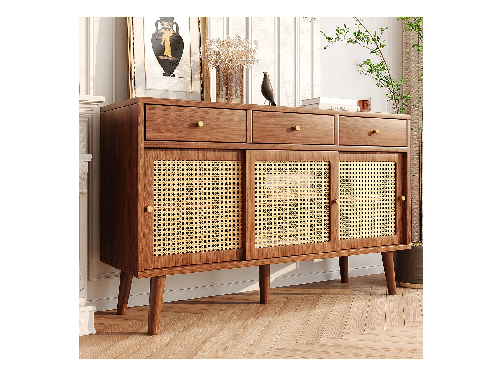 Buffet en rotin 120x40x78cm, avec 3 tiroirs et 3 portes coulissantes, pieds en bois massif, poignée en métal doré, étagères réglables, noyer