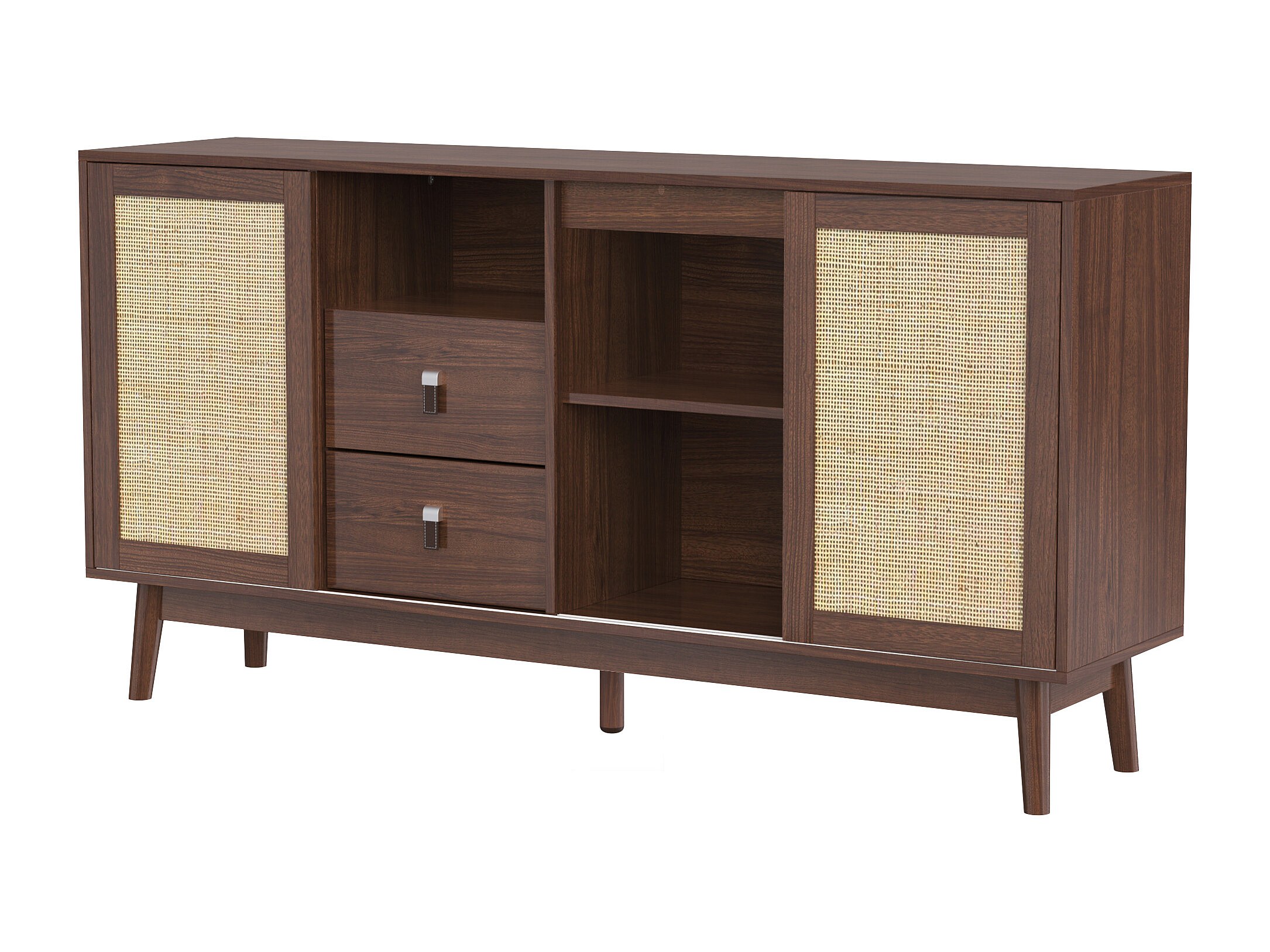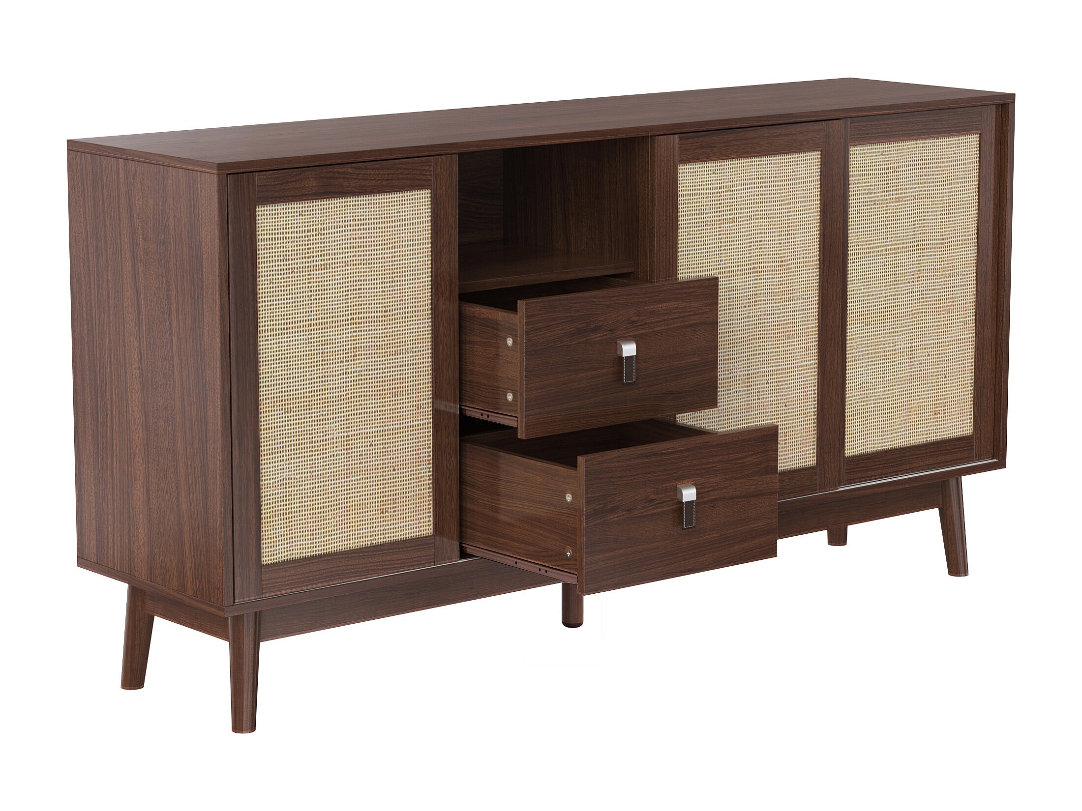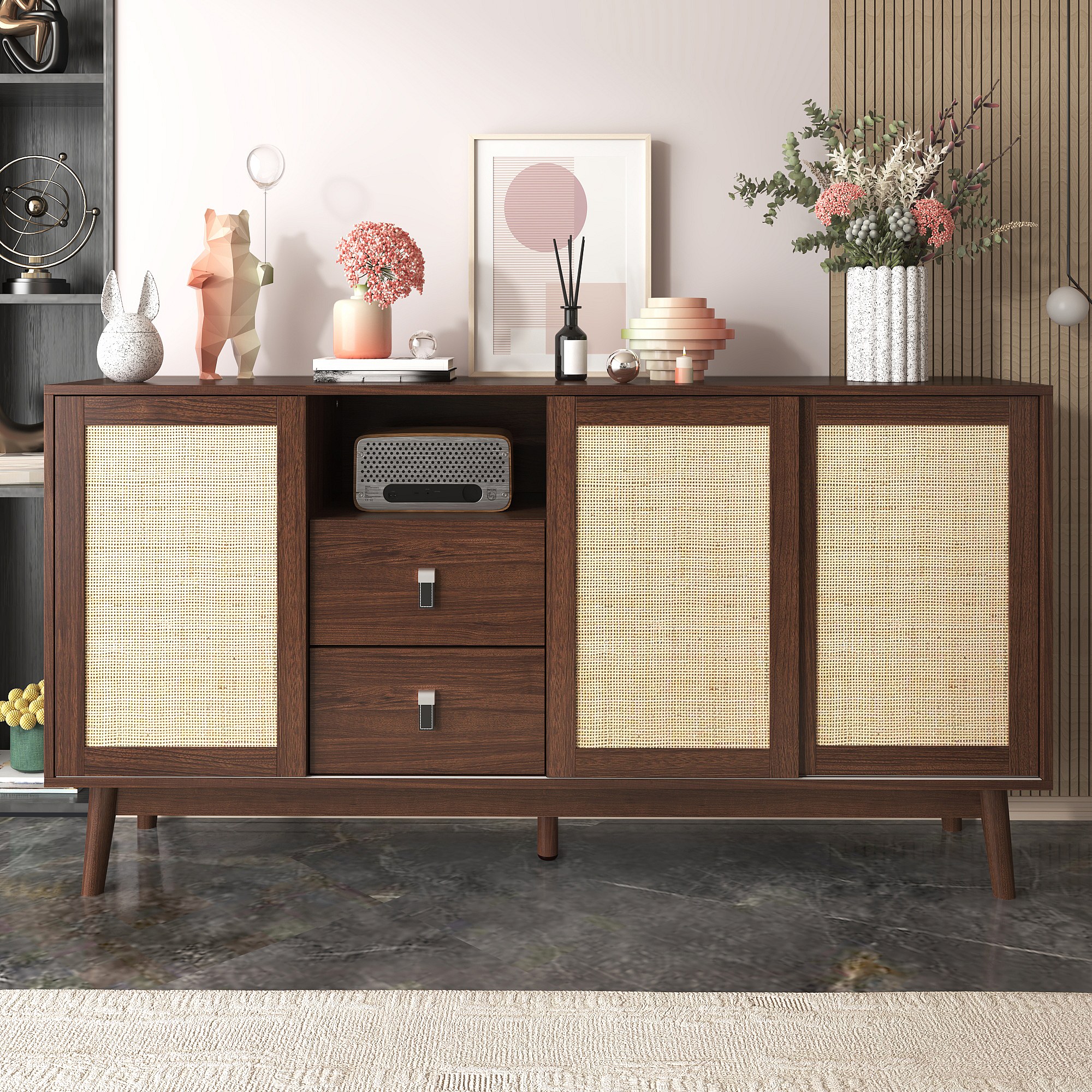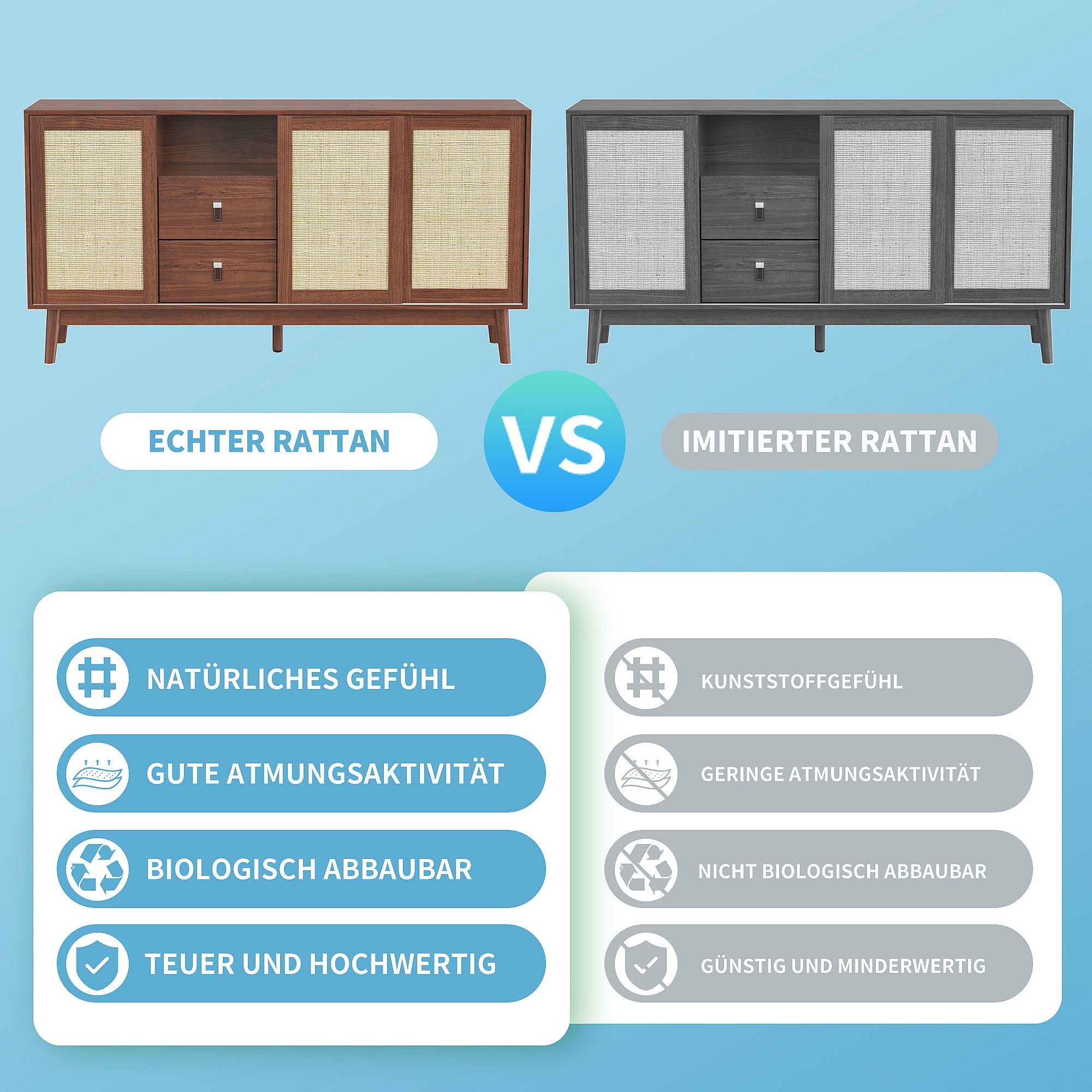 Buffet en rotin naturel 155x38x80 cm, 3 portes coulissantes et 2 tiroirs, respirant, stable et polyvalent, idéal salon, salle à manger et chambre