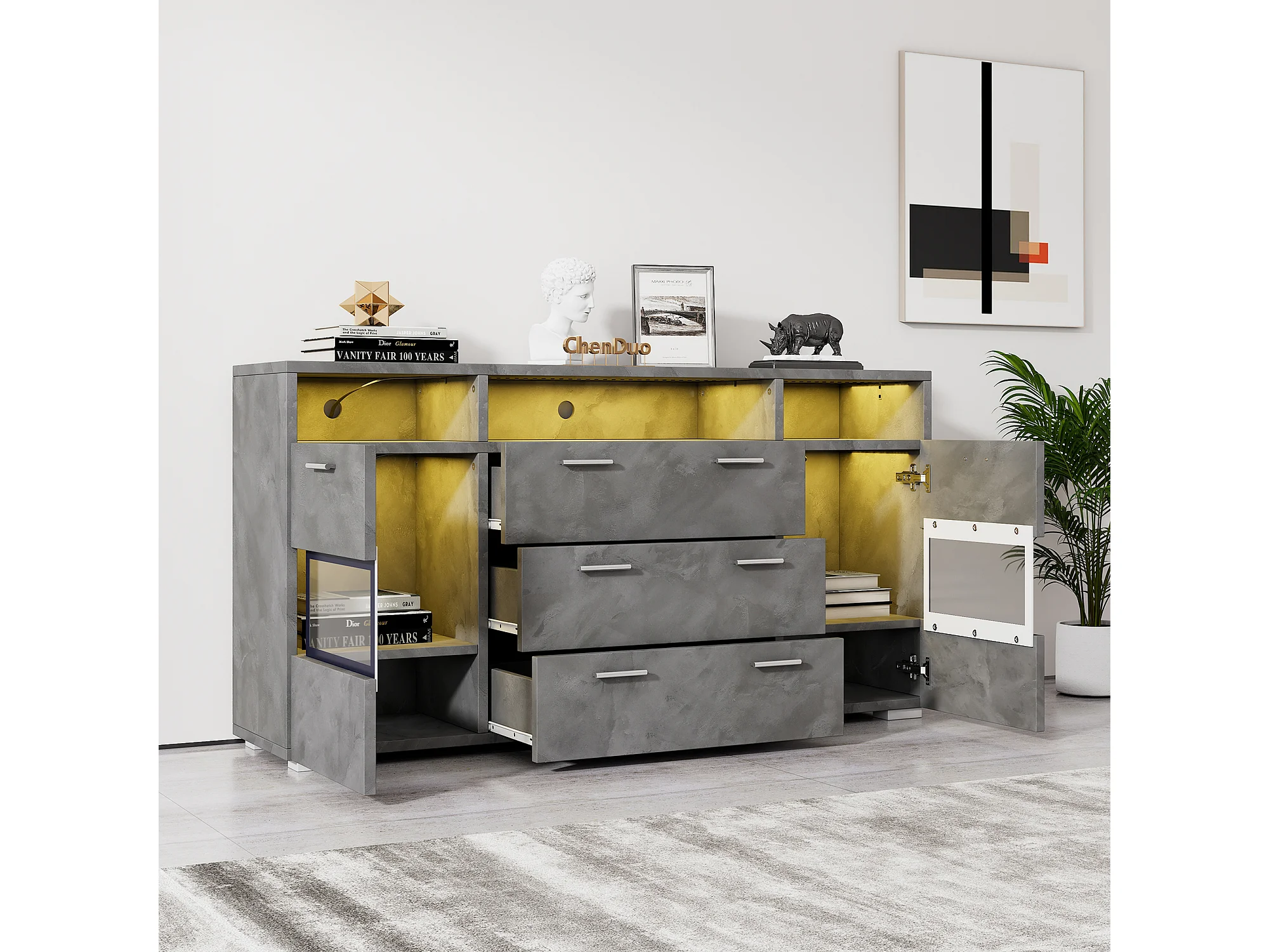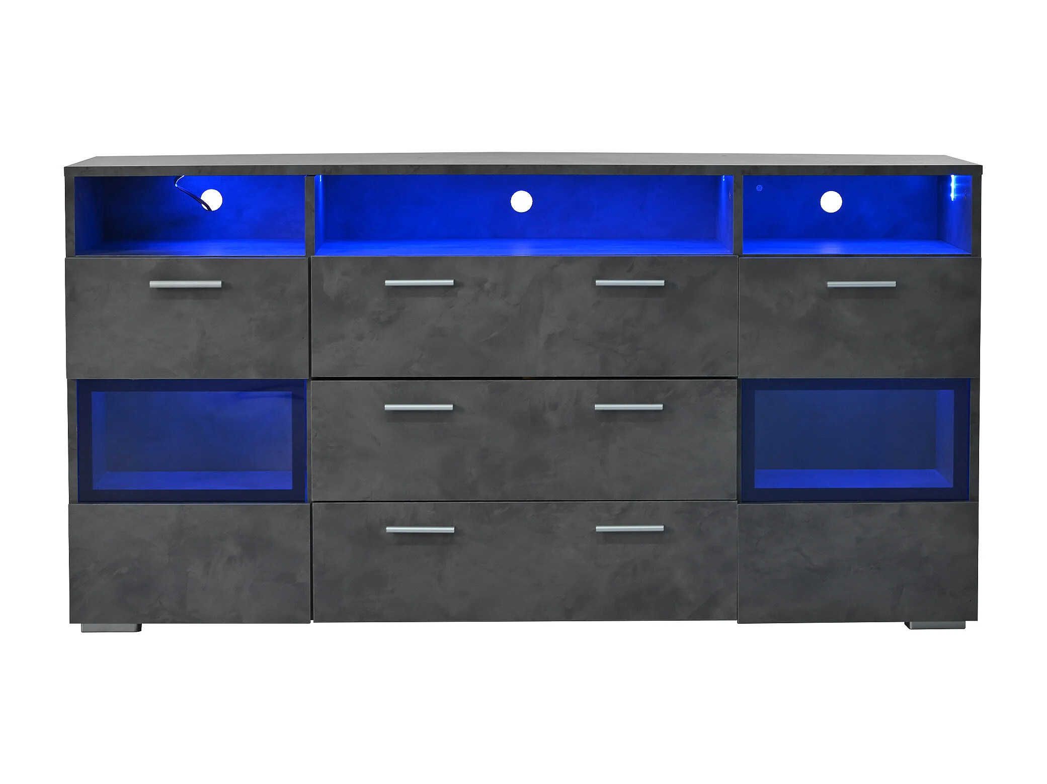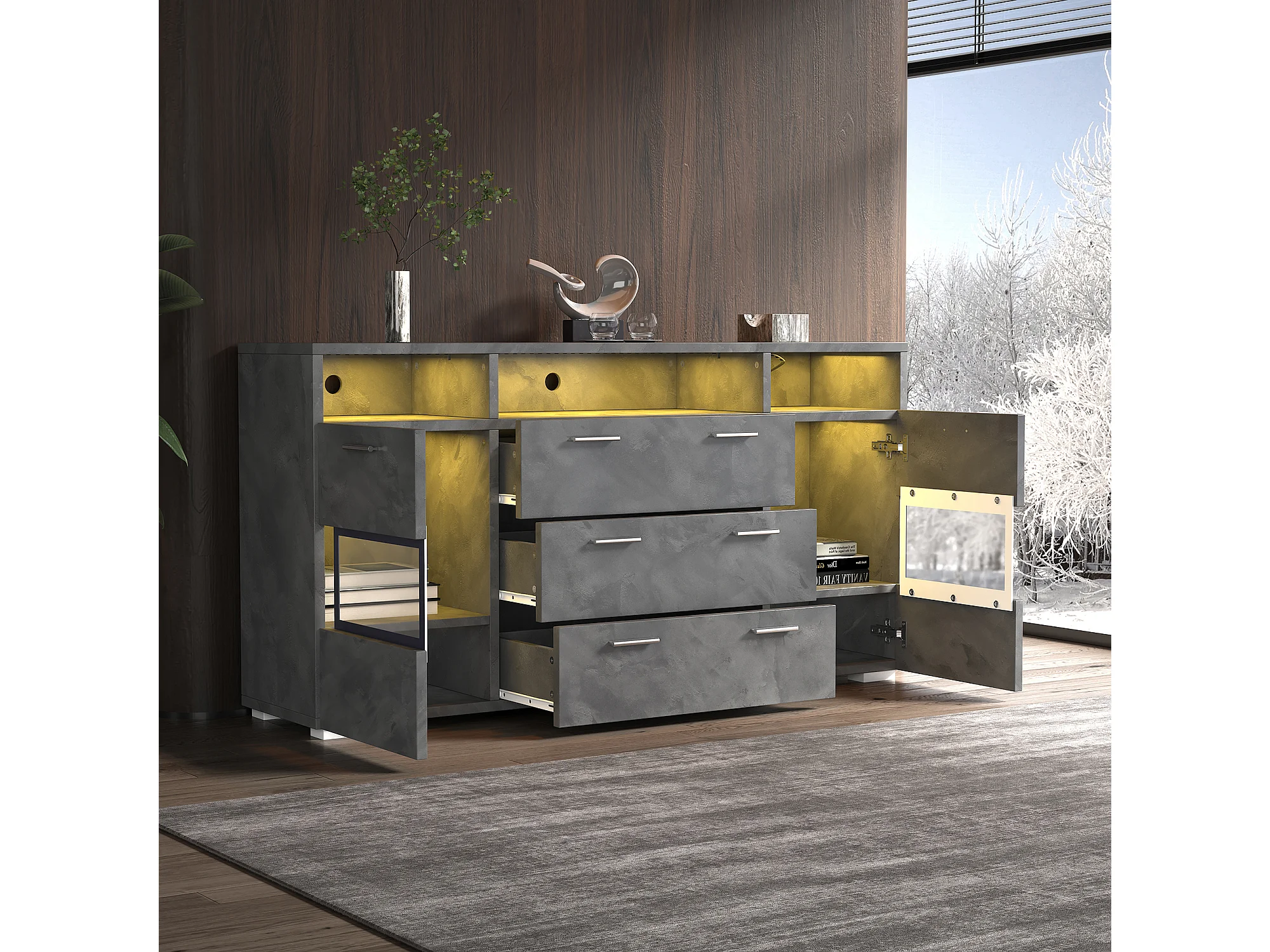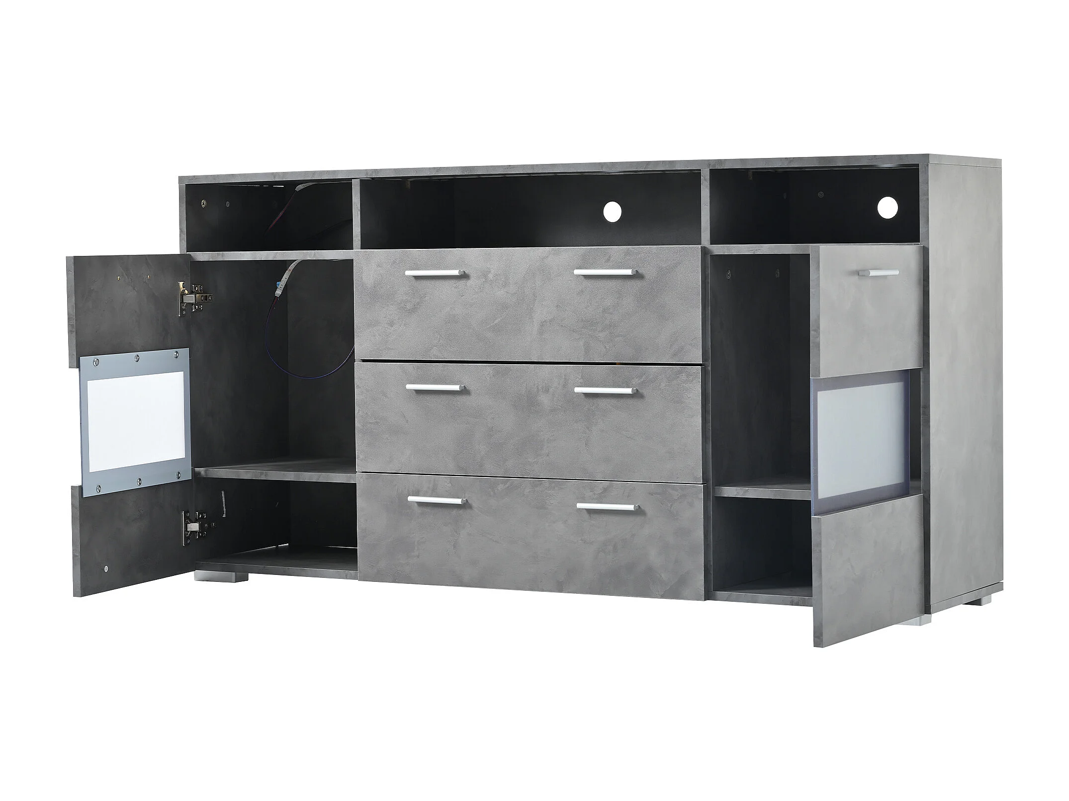 Buffet gris avec 2 portes, 3 tiroirs, 3 espaces de rangement et lumières LED, 140x33,5x72,5cm