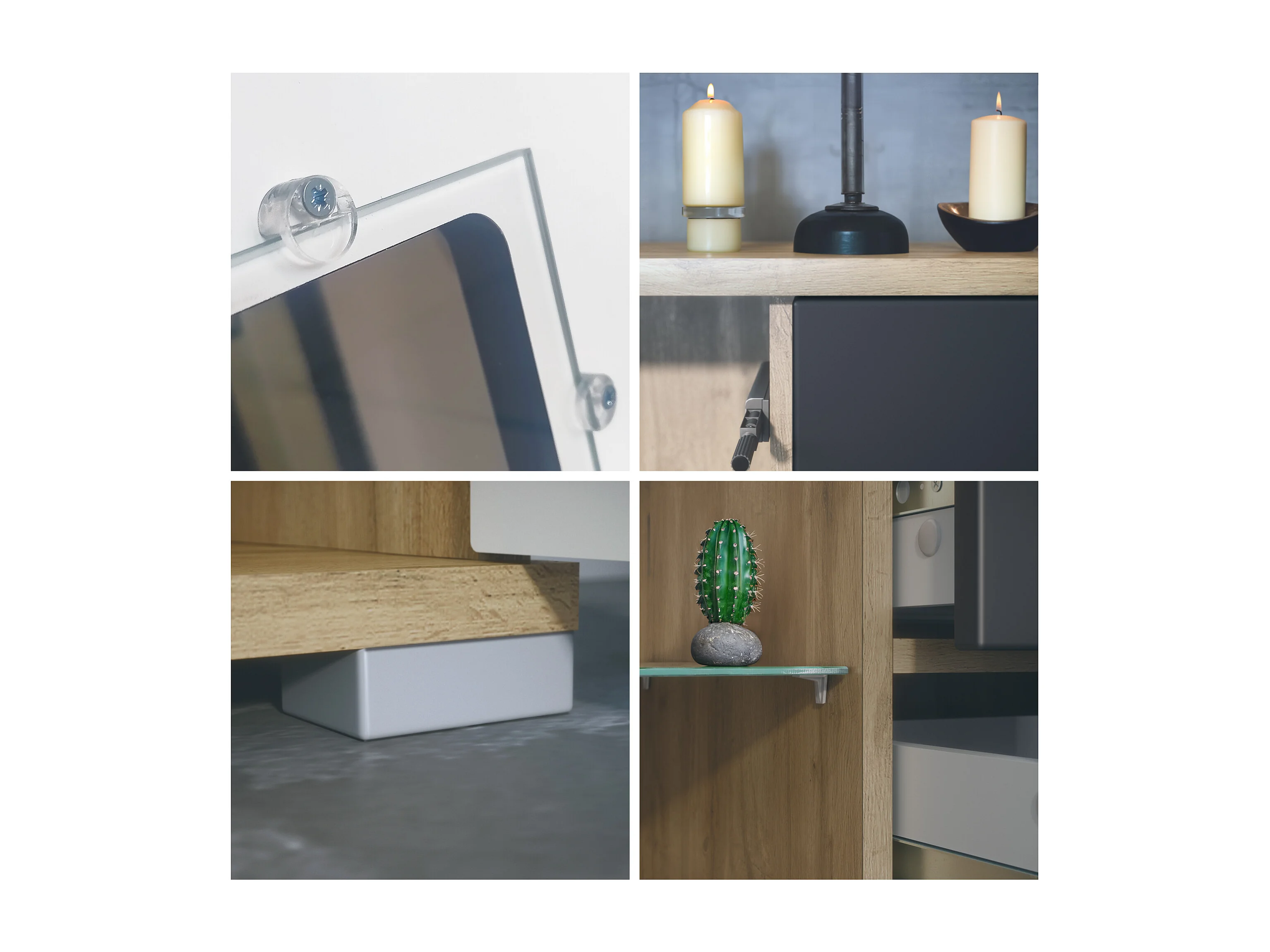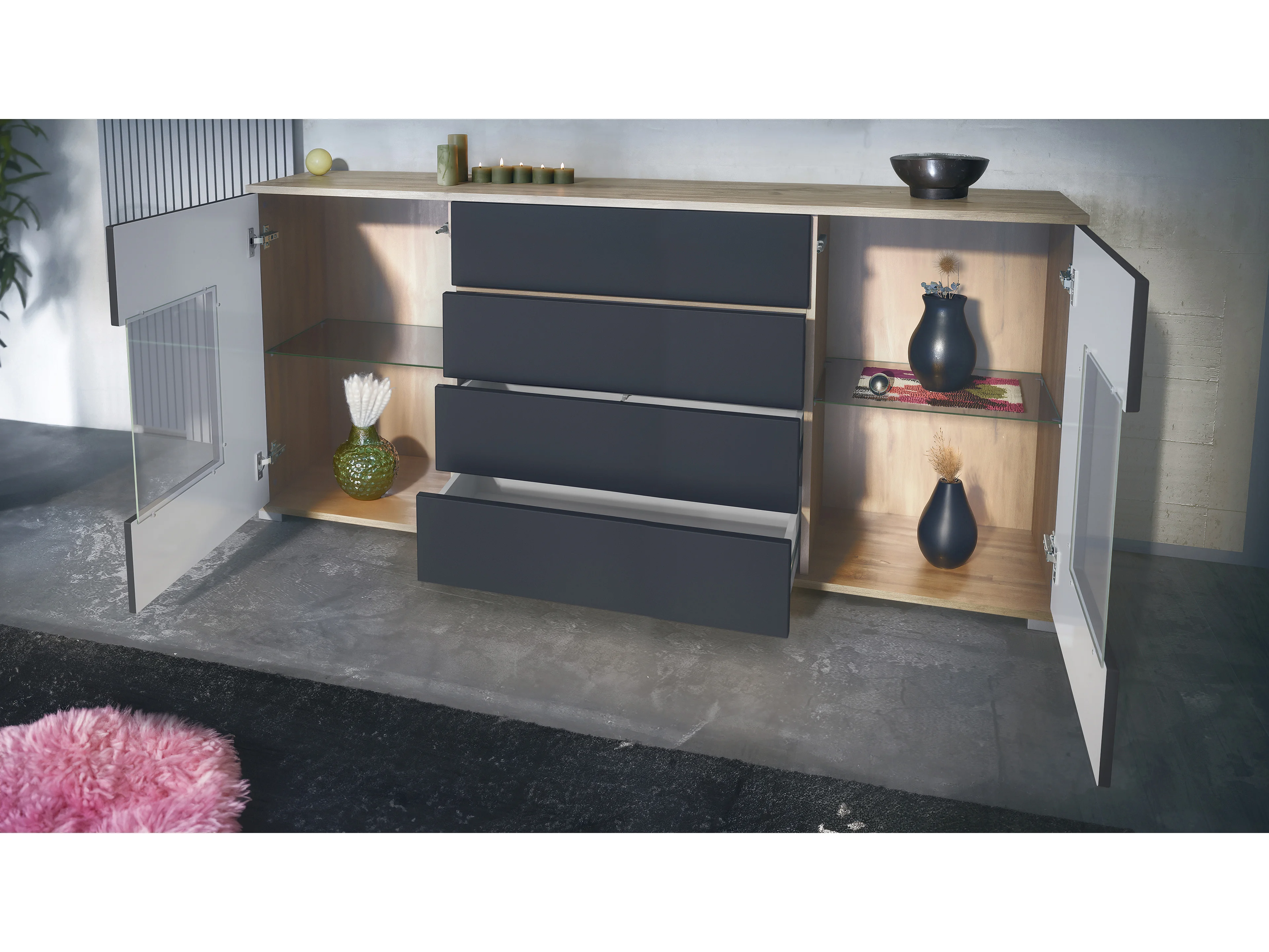 Buffet Grömitz V2 – Meuble avec 2 Grandes Portes et 4 Tiroirs, Chêne Evoke/gris haute brillance (166,5 x 75,5 x 35)