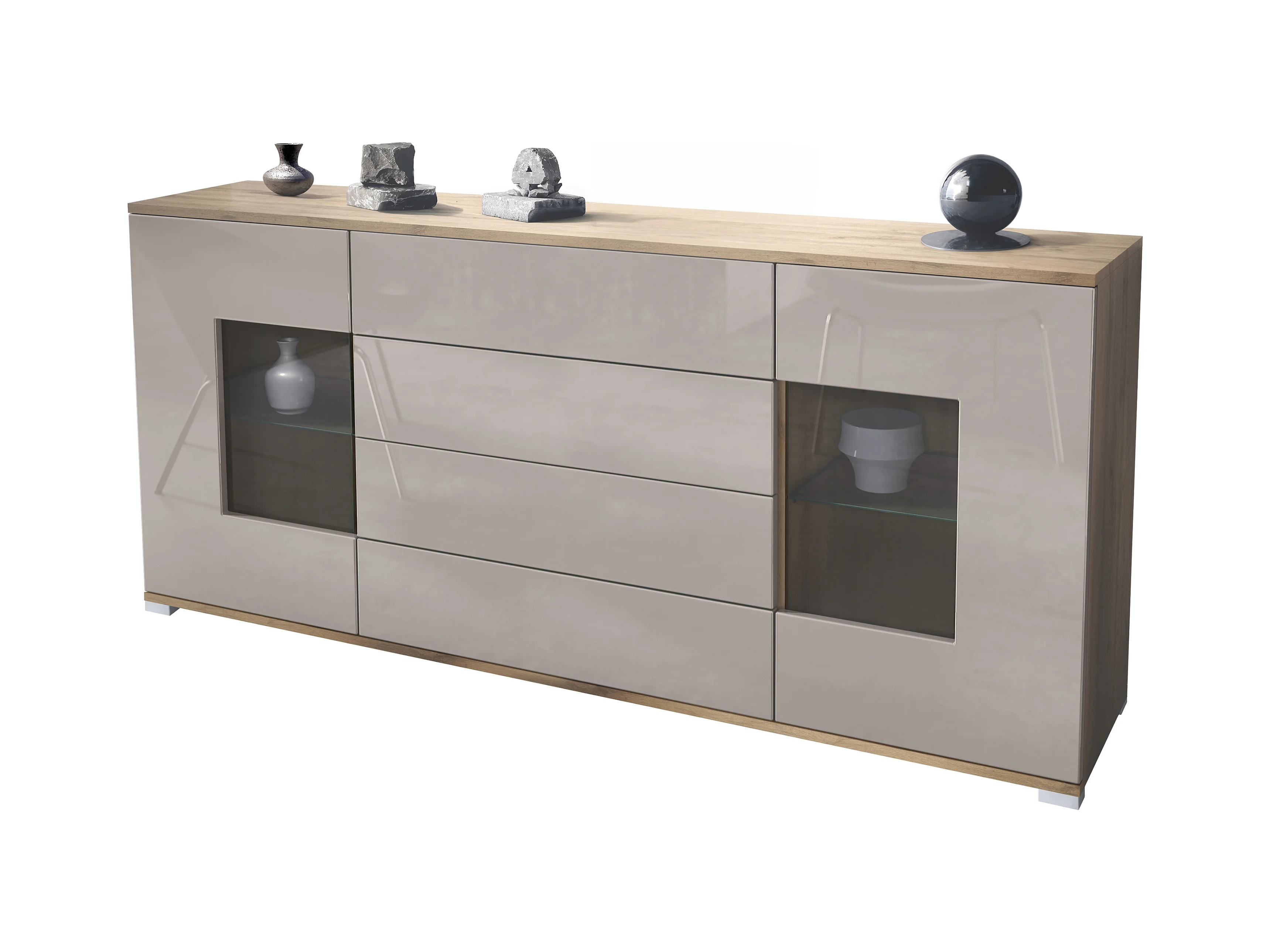 Buffet Grömitz V2 – Meuble avec 2 Grandes Portes et 4 Tiroirs, Chêne Evoke/gris sable haute brillance (166,5 x 75,5 x 35)