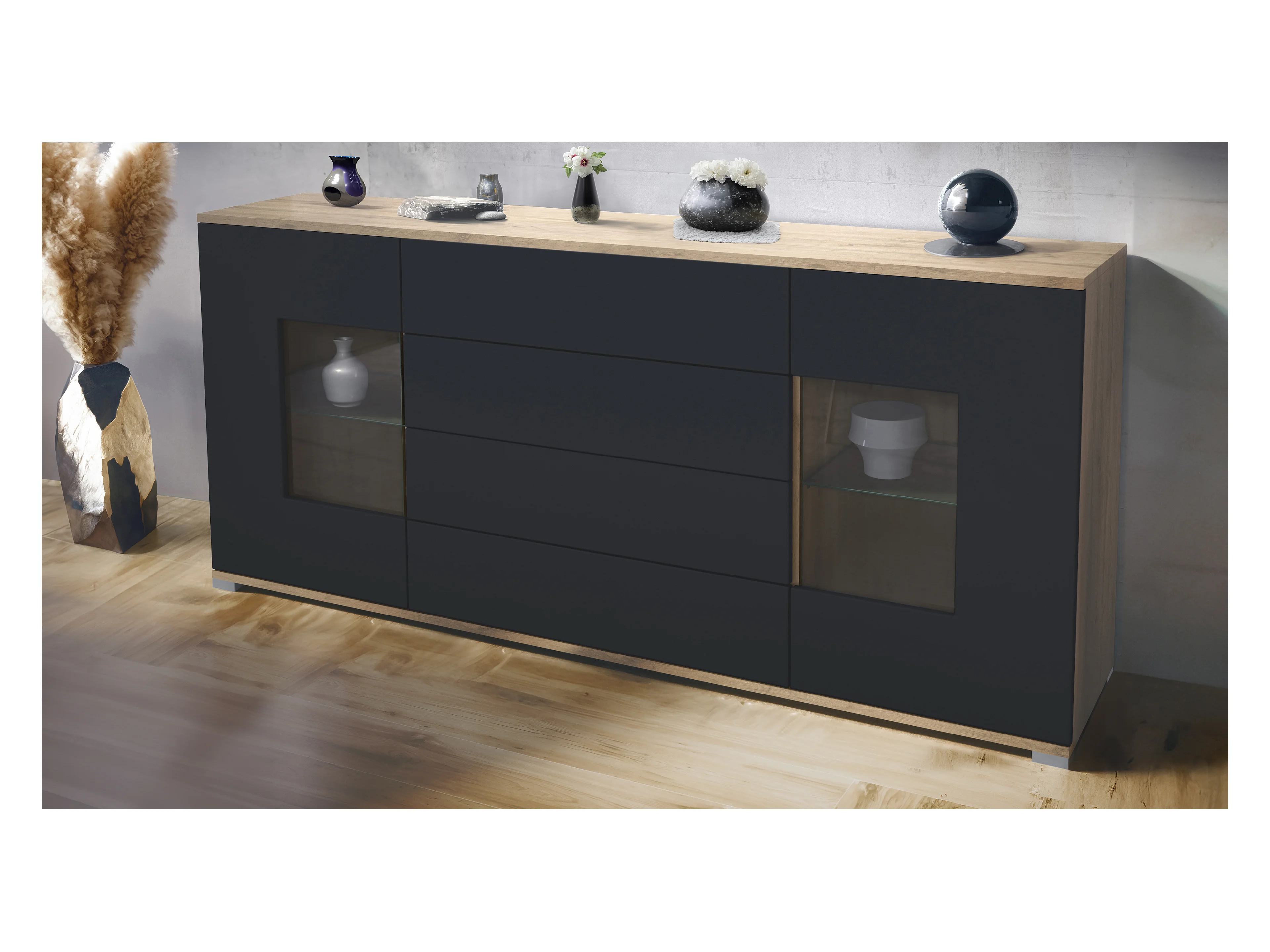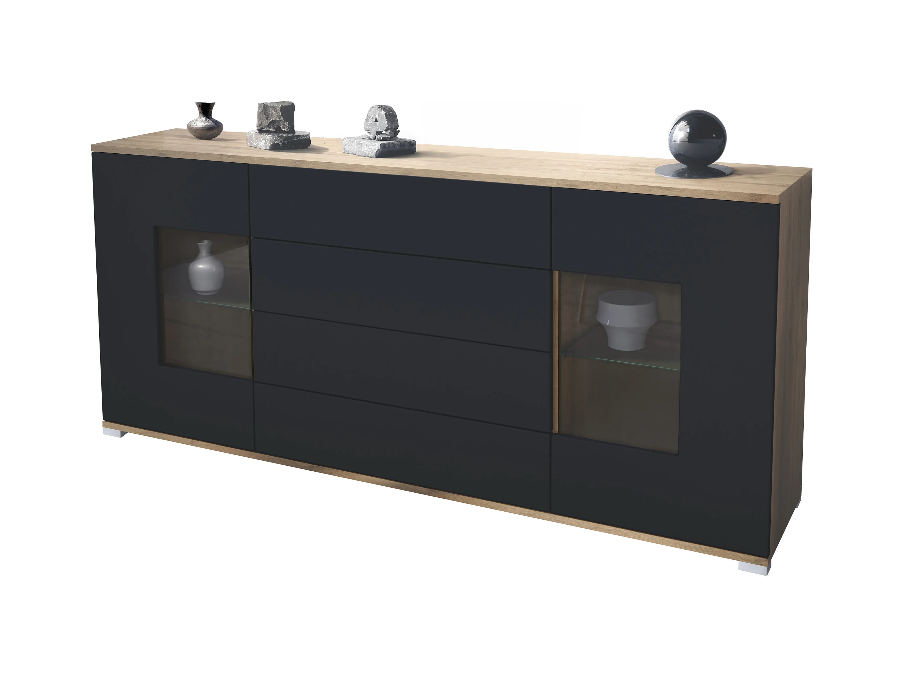 Buffet Grömitz V2 – Meuble avec 2 Grandes Portes et 4 Tiroirs, Chêne Evoke/noir mat (166,5 x 75,5 x 35)