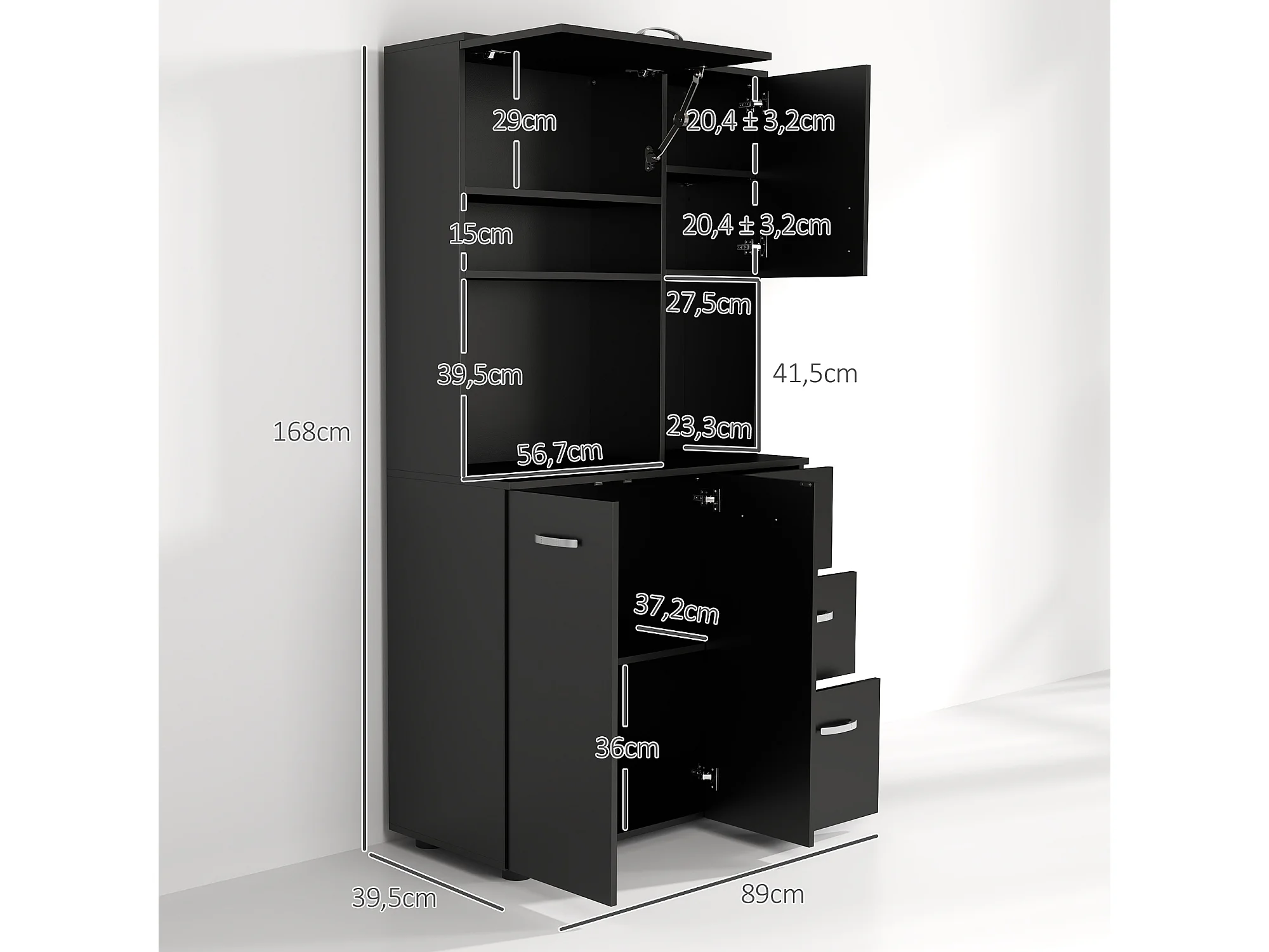 Buffet haut 4 portes 3 tiroirs 2 étagères 2 niches 89L x 39,5l x 168H cm noir