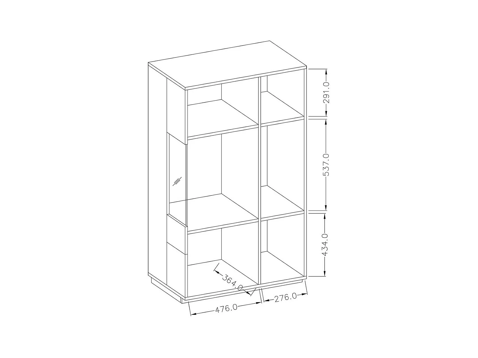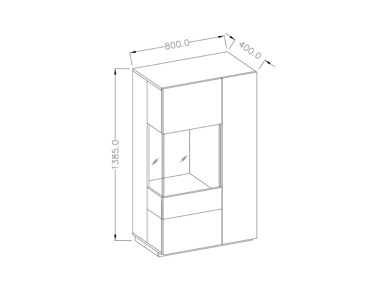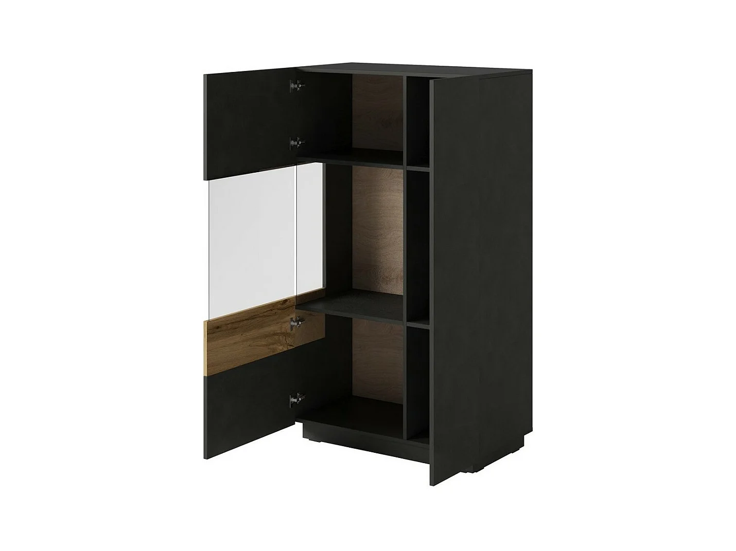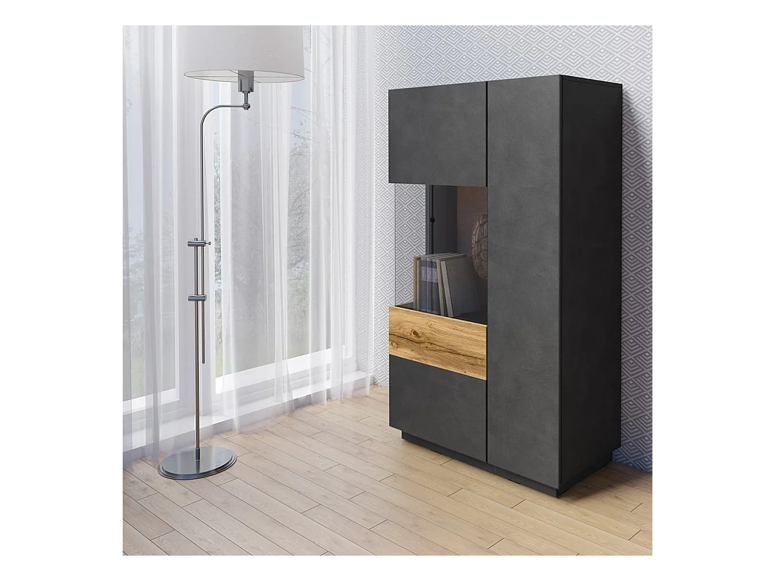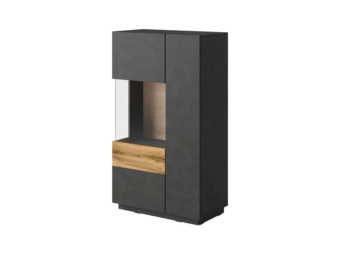 Buffet haut avec collection KILES deux portes. Coloris gris anthracite et chêne. Porte vitrée à gauche
