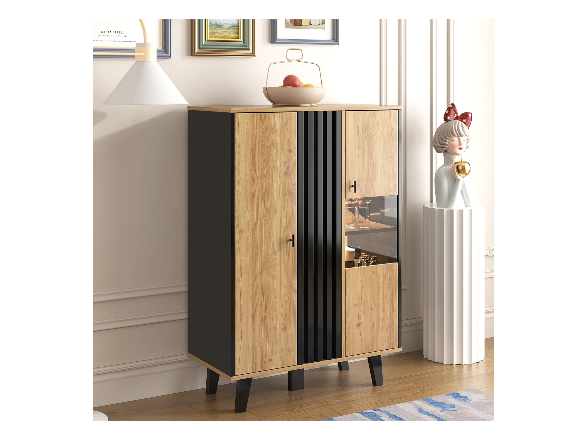Buffet haut avec éclairage LED interne - 2 portes 8 compartiments - Naturel & Noir