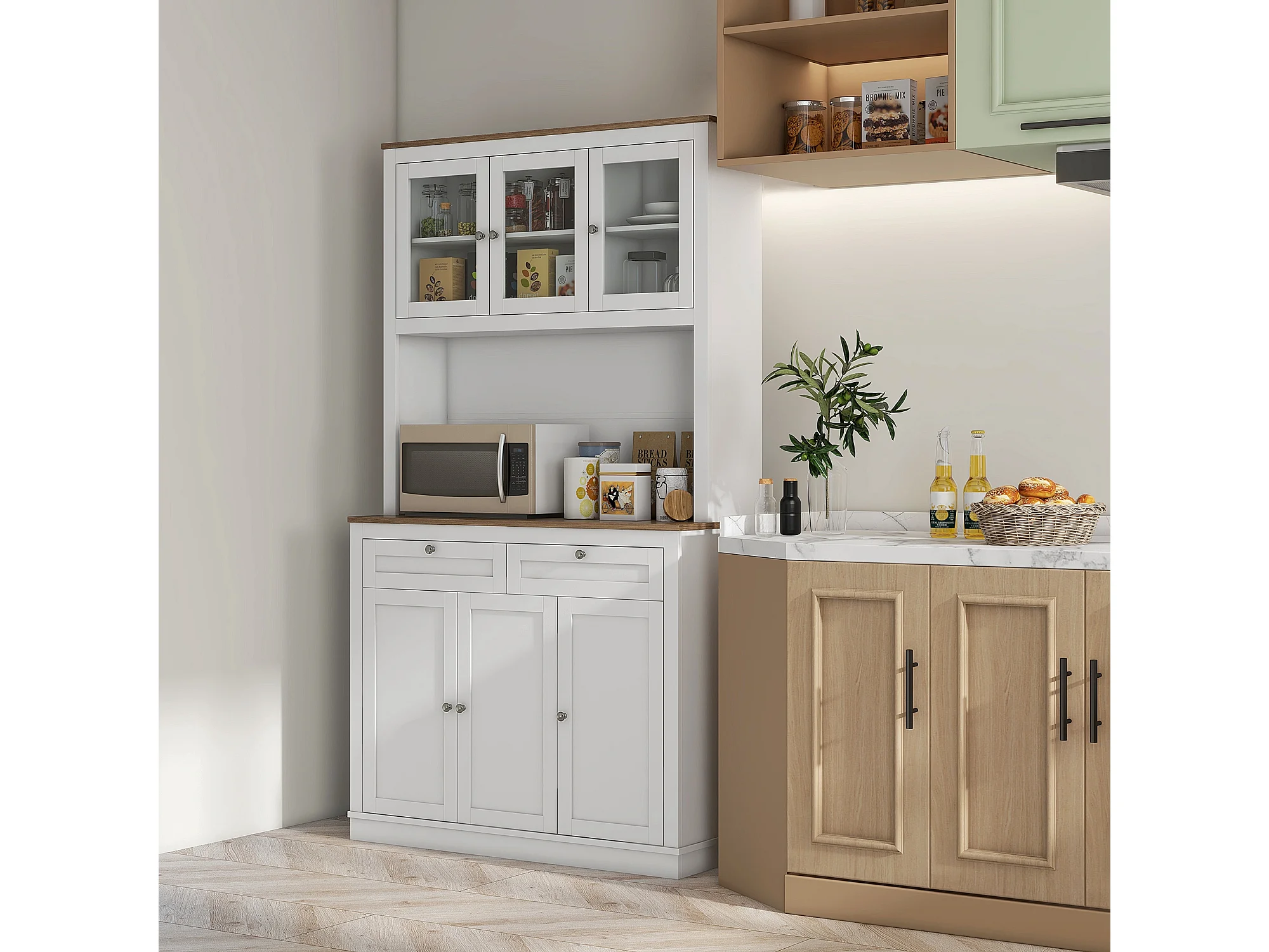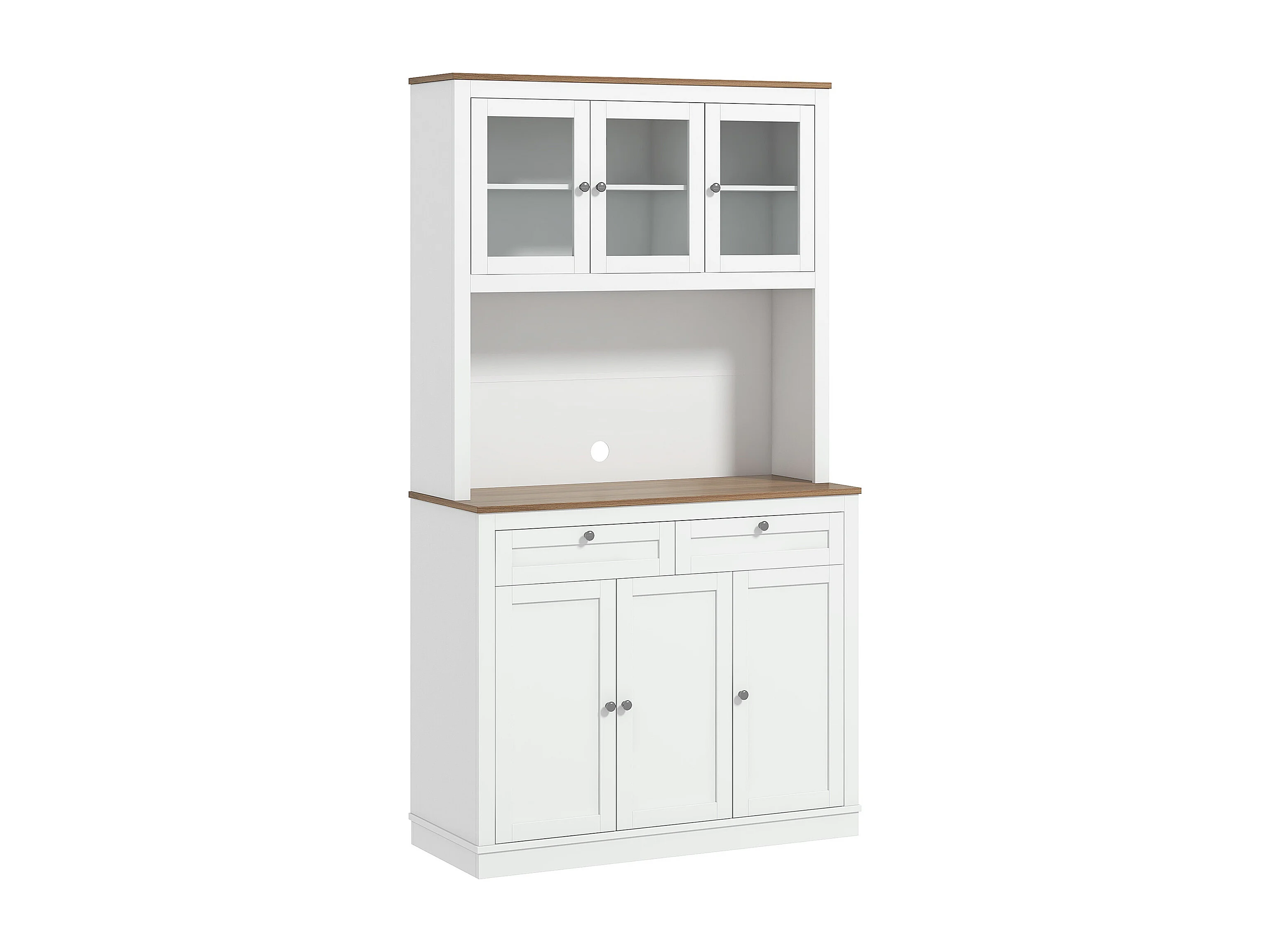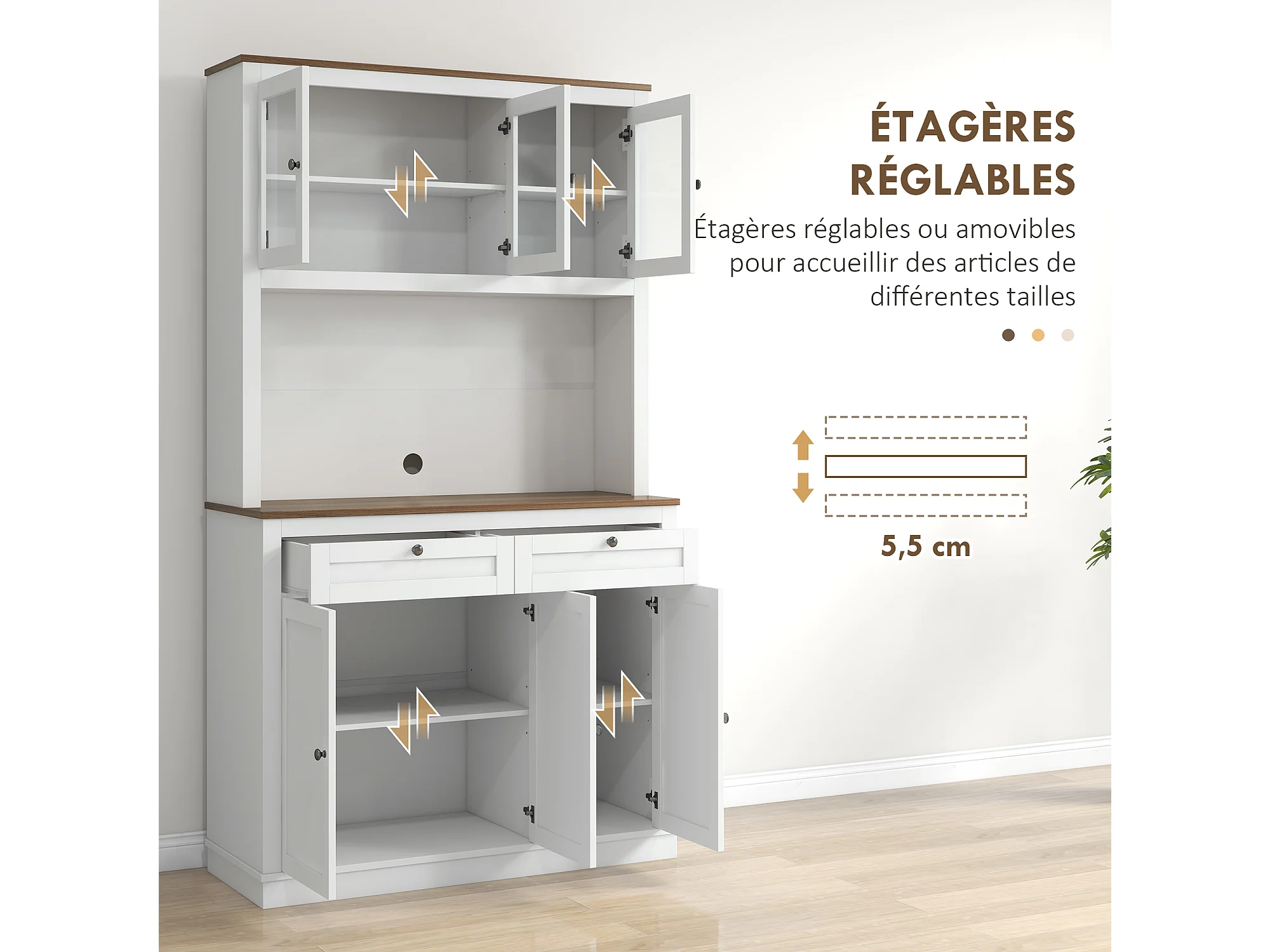 Buffet haut cuisine vitrine - 6 portes, 2 tiroirs, plan de travail - dim. 100x40x180cm - blanc effet bois noyer