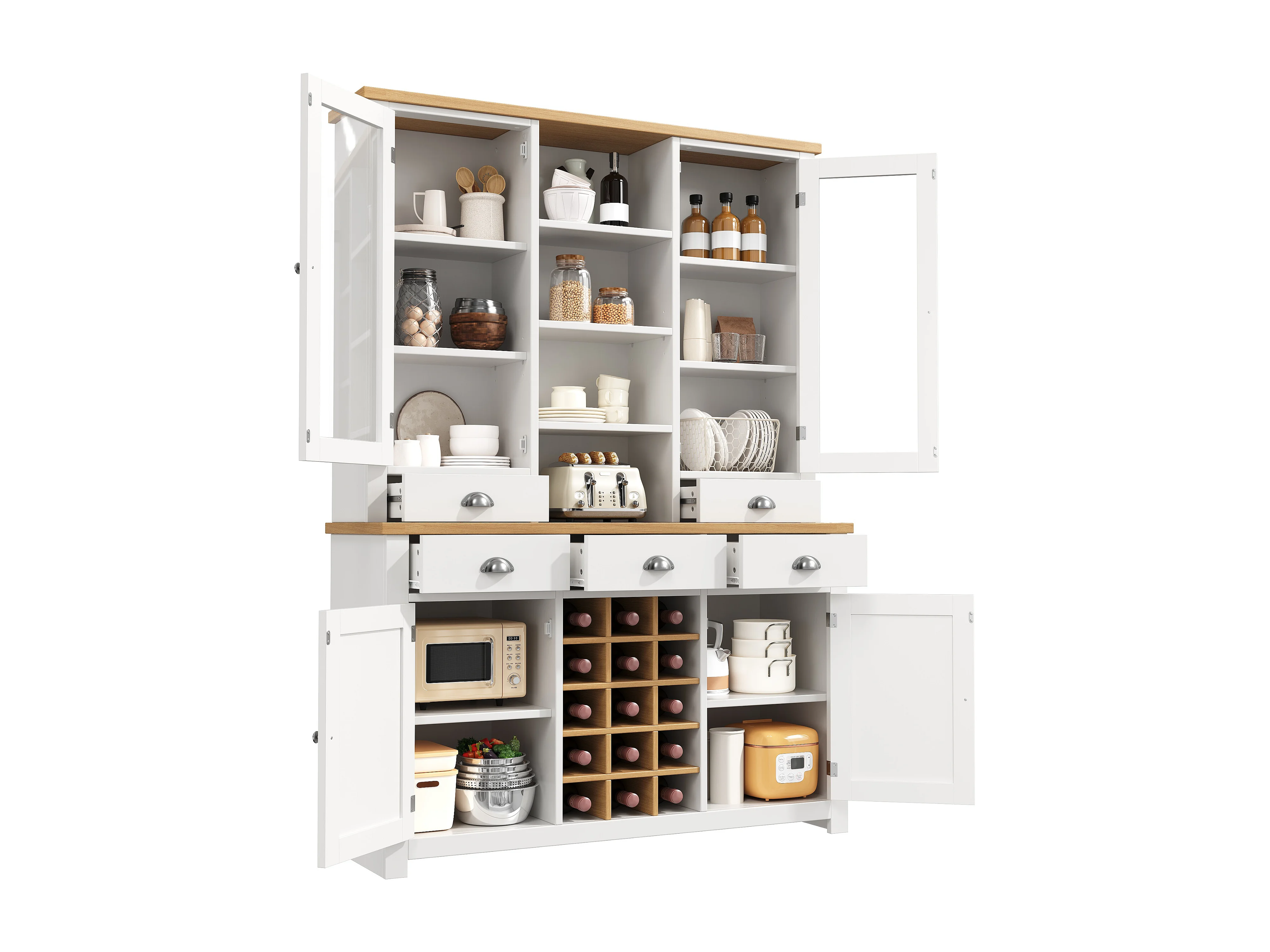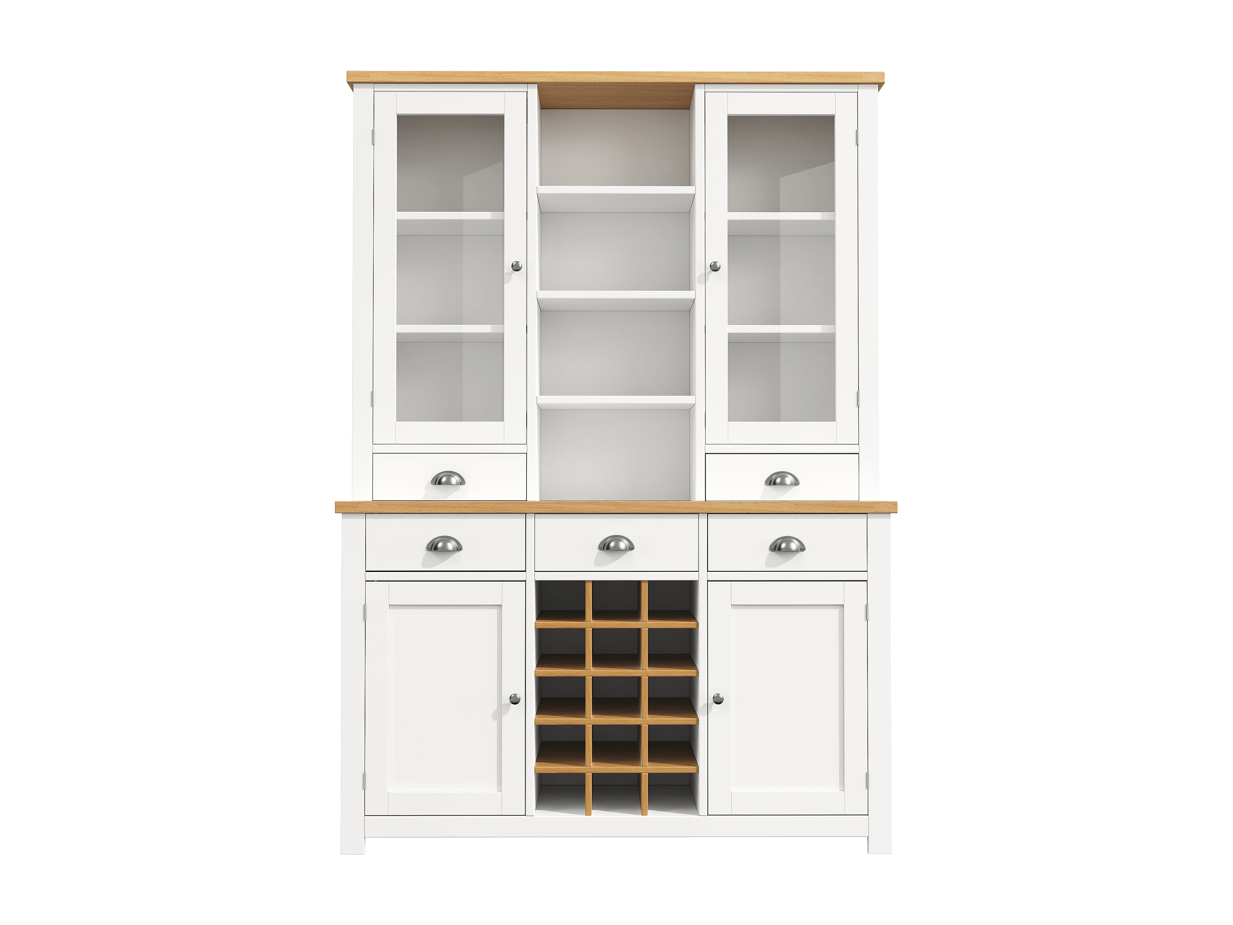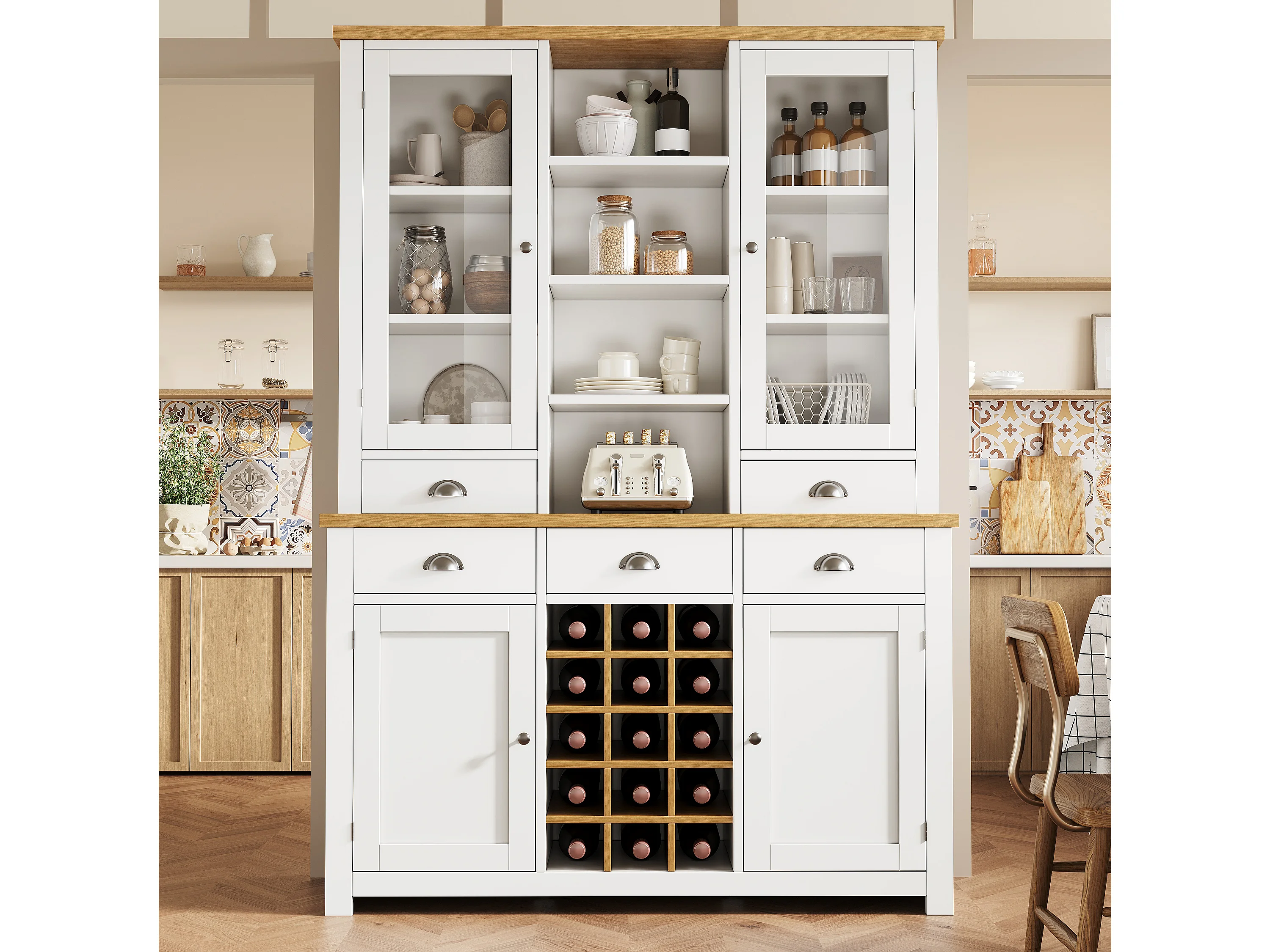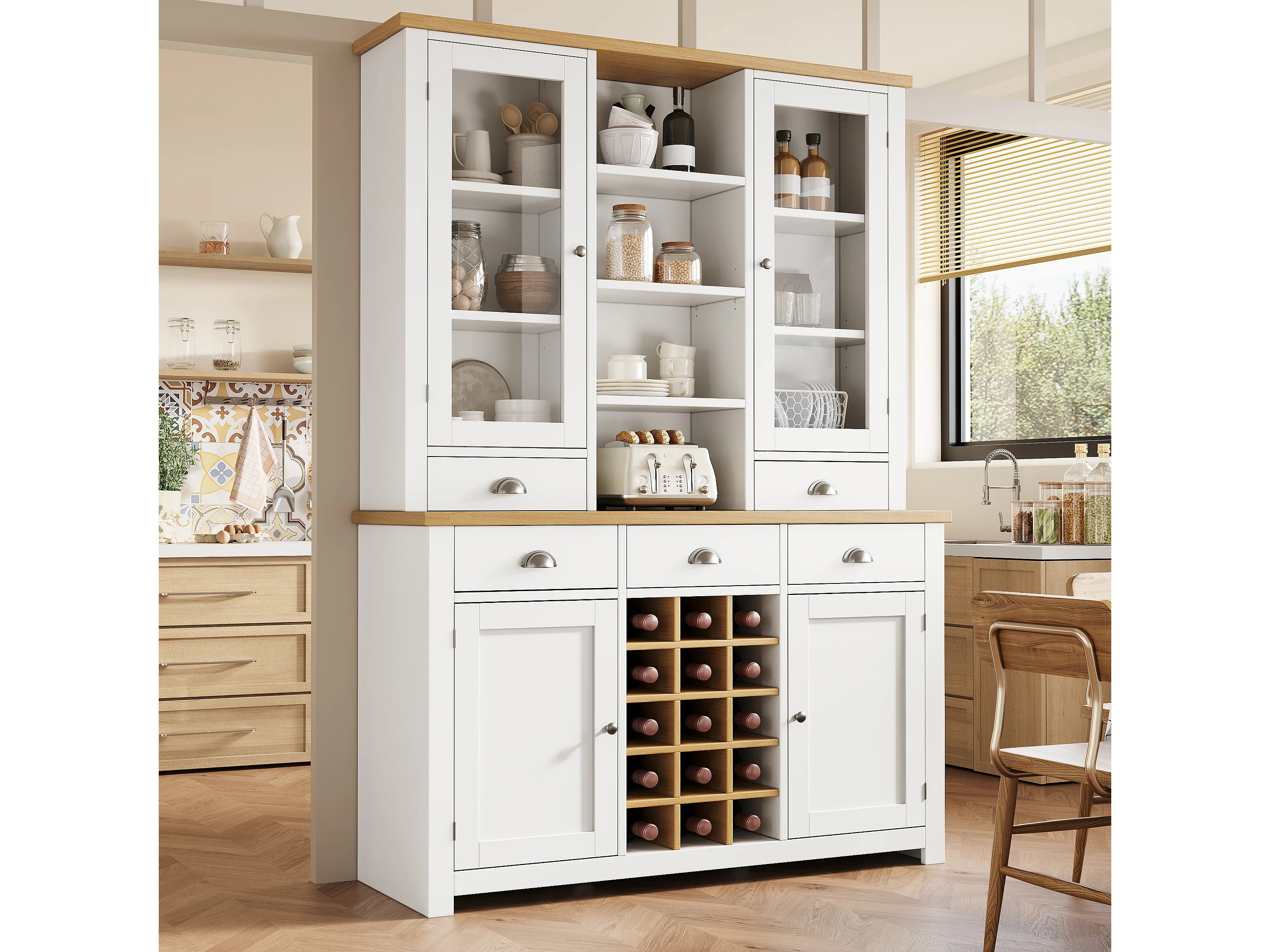 Buffet haut de cuisine - 120 x 40 x 185 cm - avec 5 tiroirs + 4 portes + étagères + casier à vin - MDF - blanc