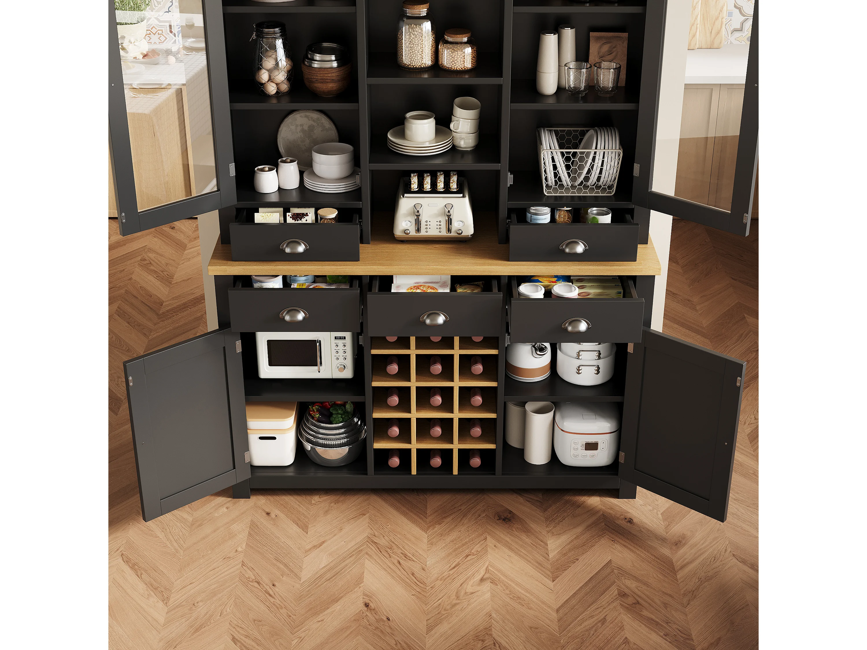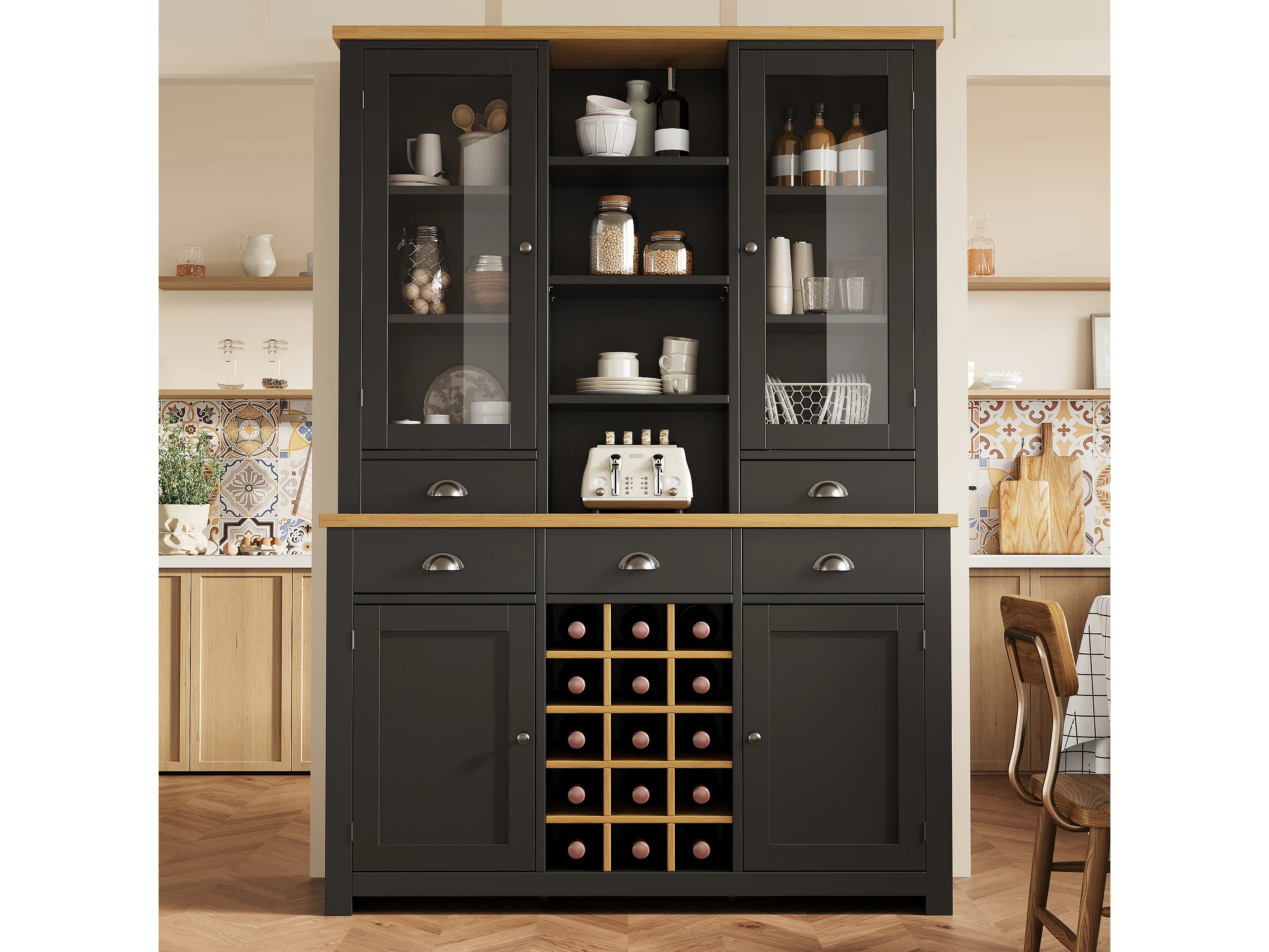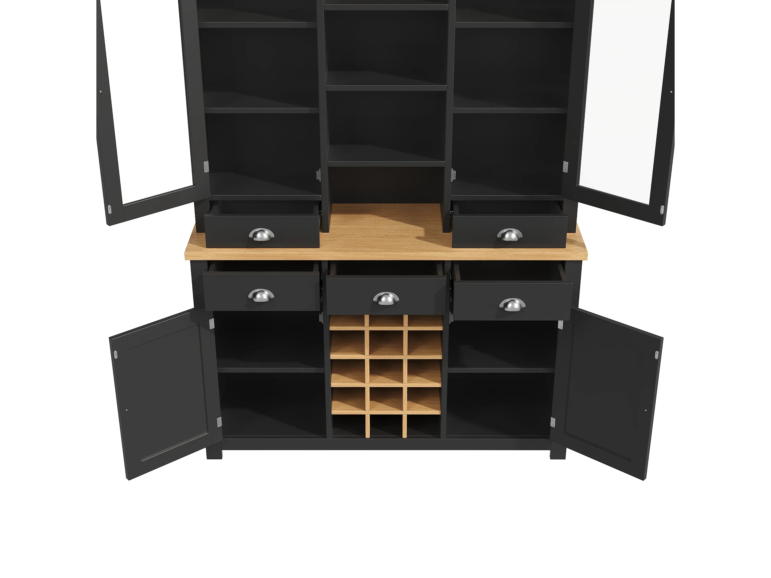 Buffet haut de cuisine - 120 x 40 x 185 cm - avec 5 tiroirs + 4 portes + étagères + casier à vin - MDF - noir