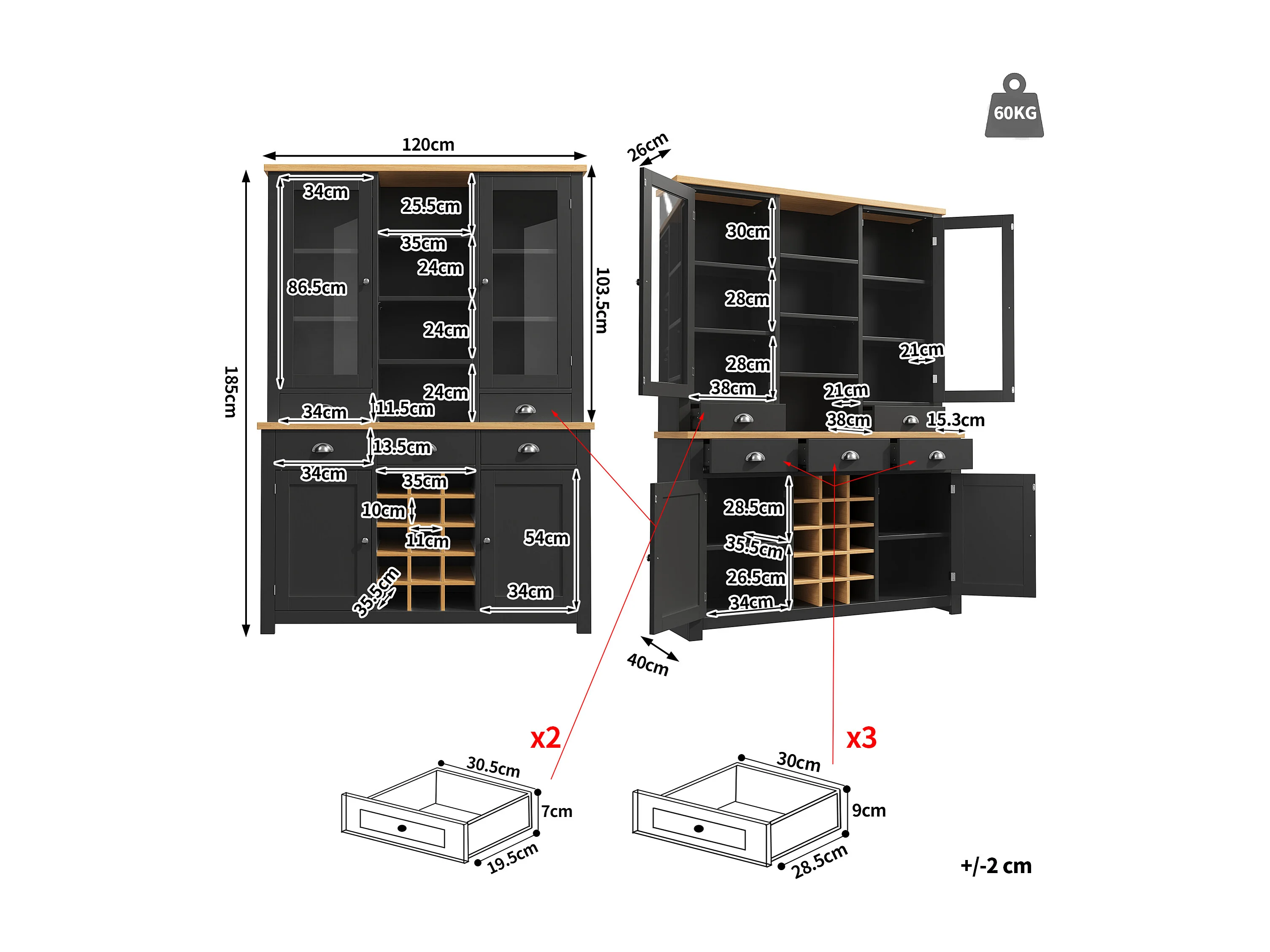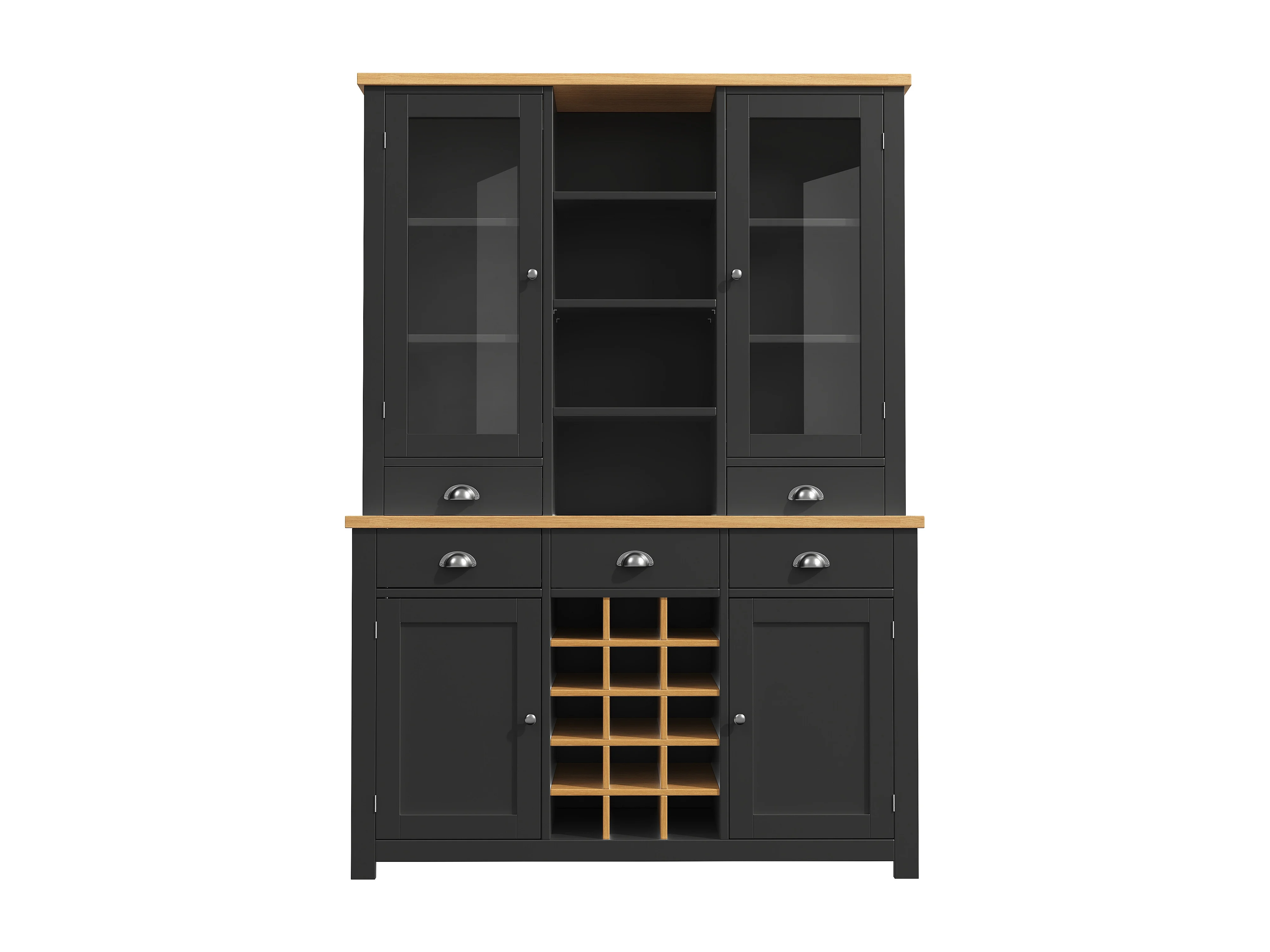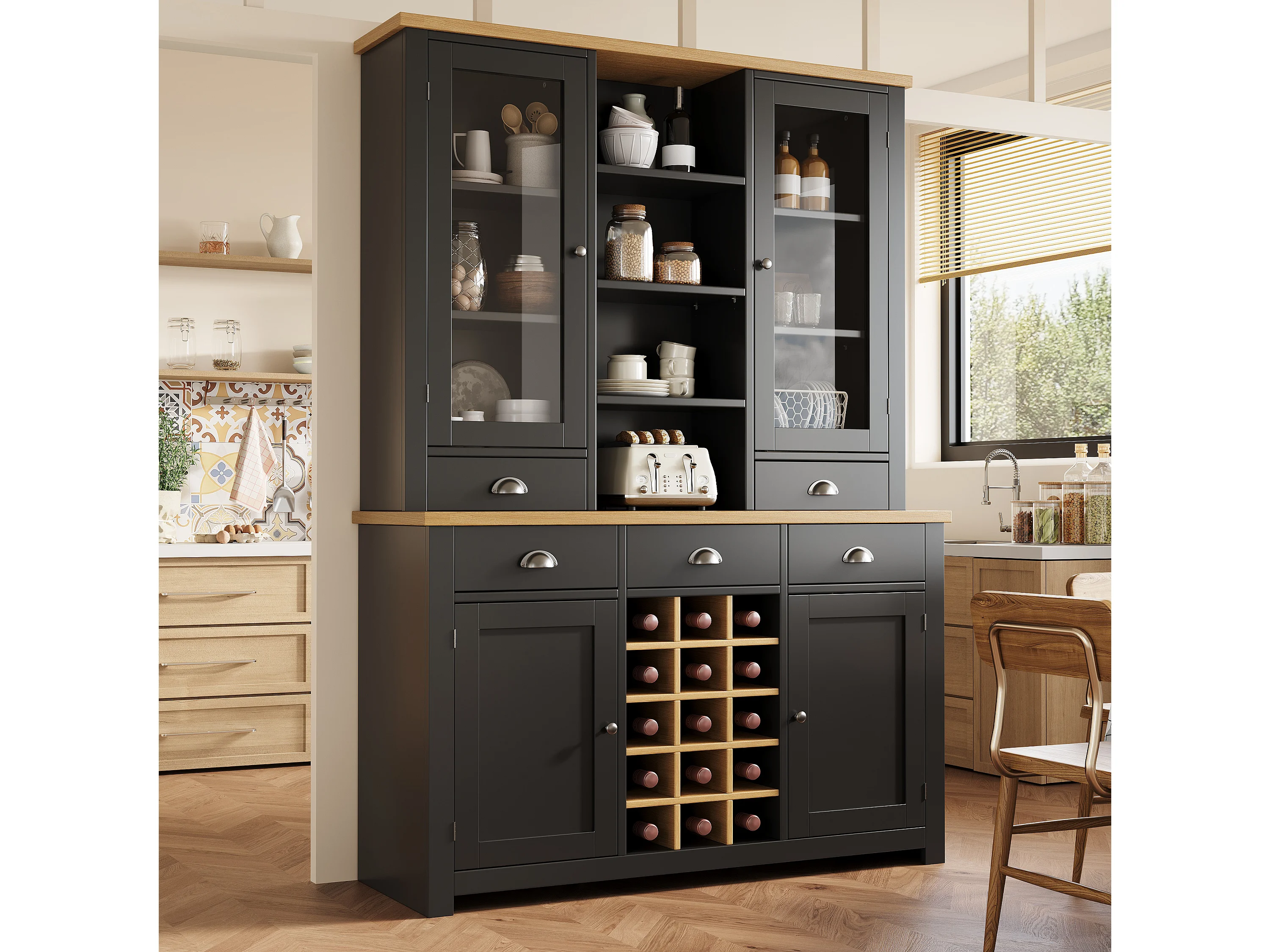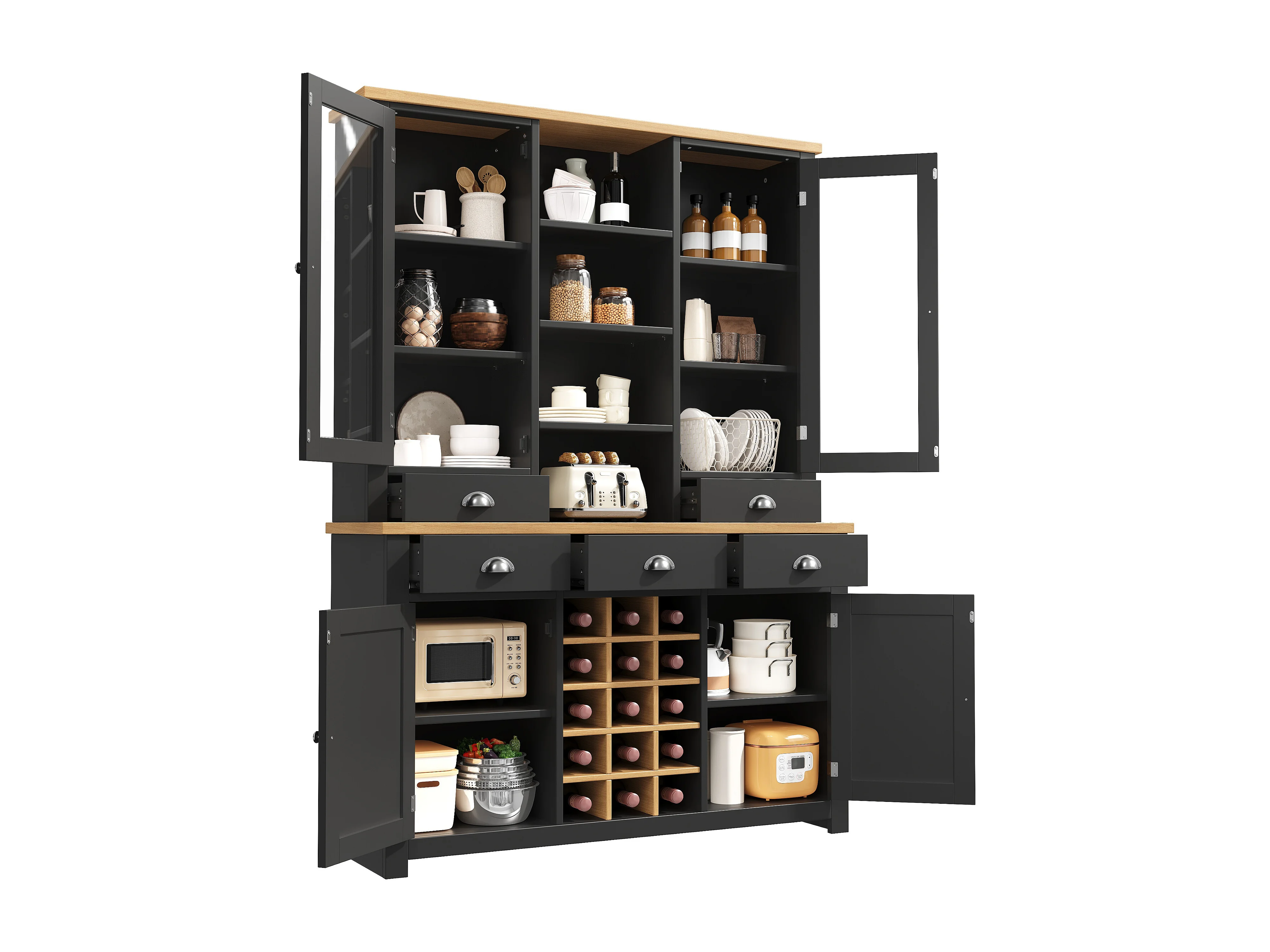 Buffet haut de cuisine - 120 x 40 x 185 cm - avec 5 tiroirs + 4 portes + étagères + casier à vin - MDF - noir